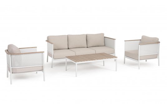 Zestaw wypoczynkowy aluminiowy z poduchami z obiciem Olefin szarobeżowym / podłokietniki i blat stolika powłoka drewnopodobna / Sofa + 2 fotele + stolik