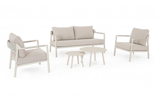 Meble ogrodowe z 2,5-osobową sofą, 2 fotelami i zestawem 2 okrągłych stolików / konstrukcja aluminium beż / oparcie oplot lina polipropylenowa / poduszki beżowe