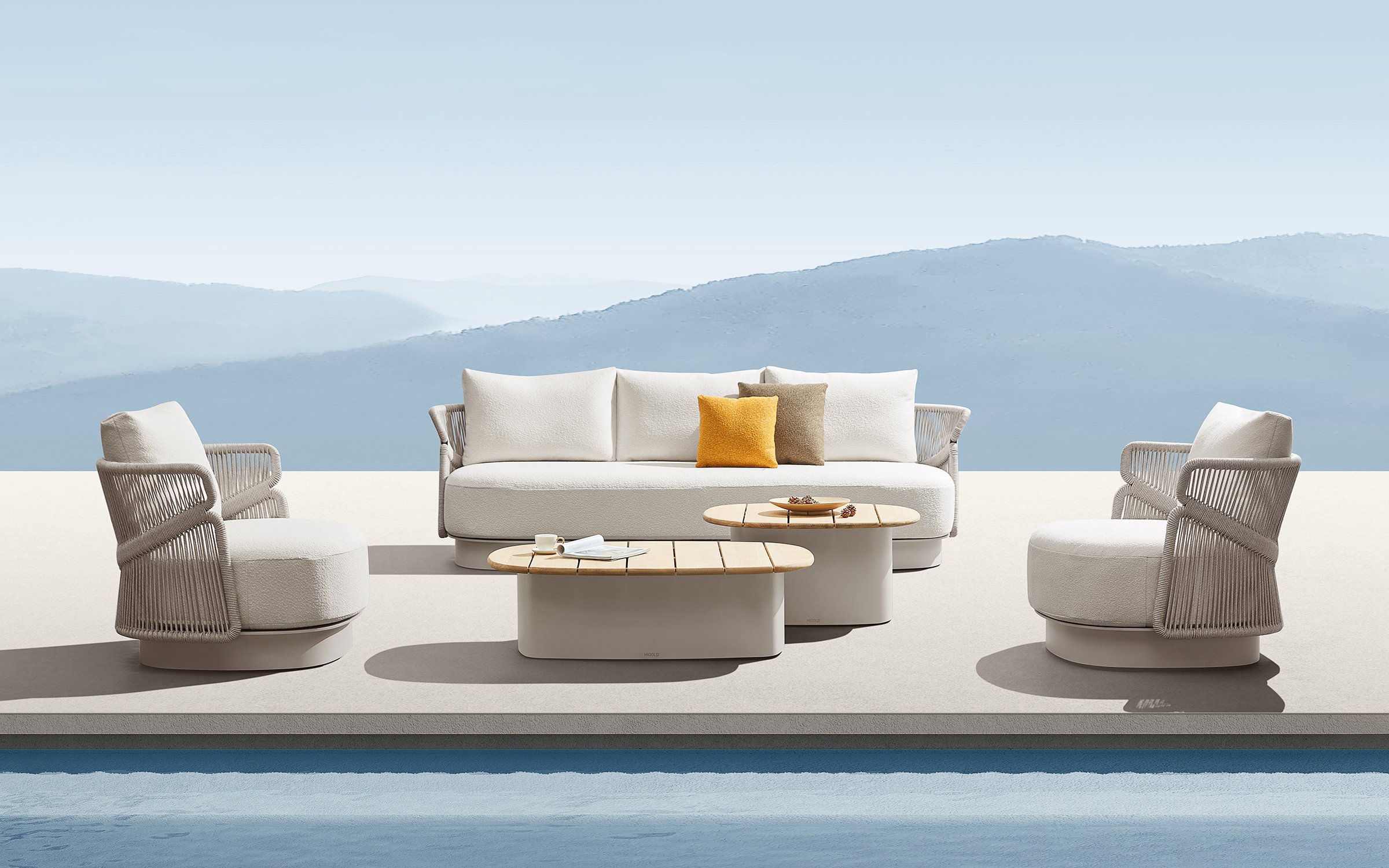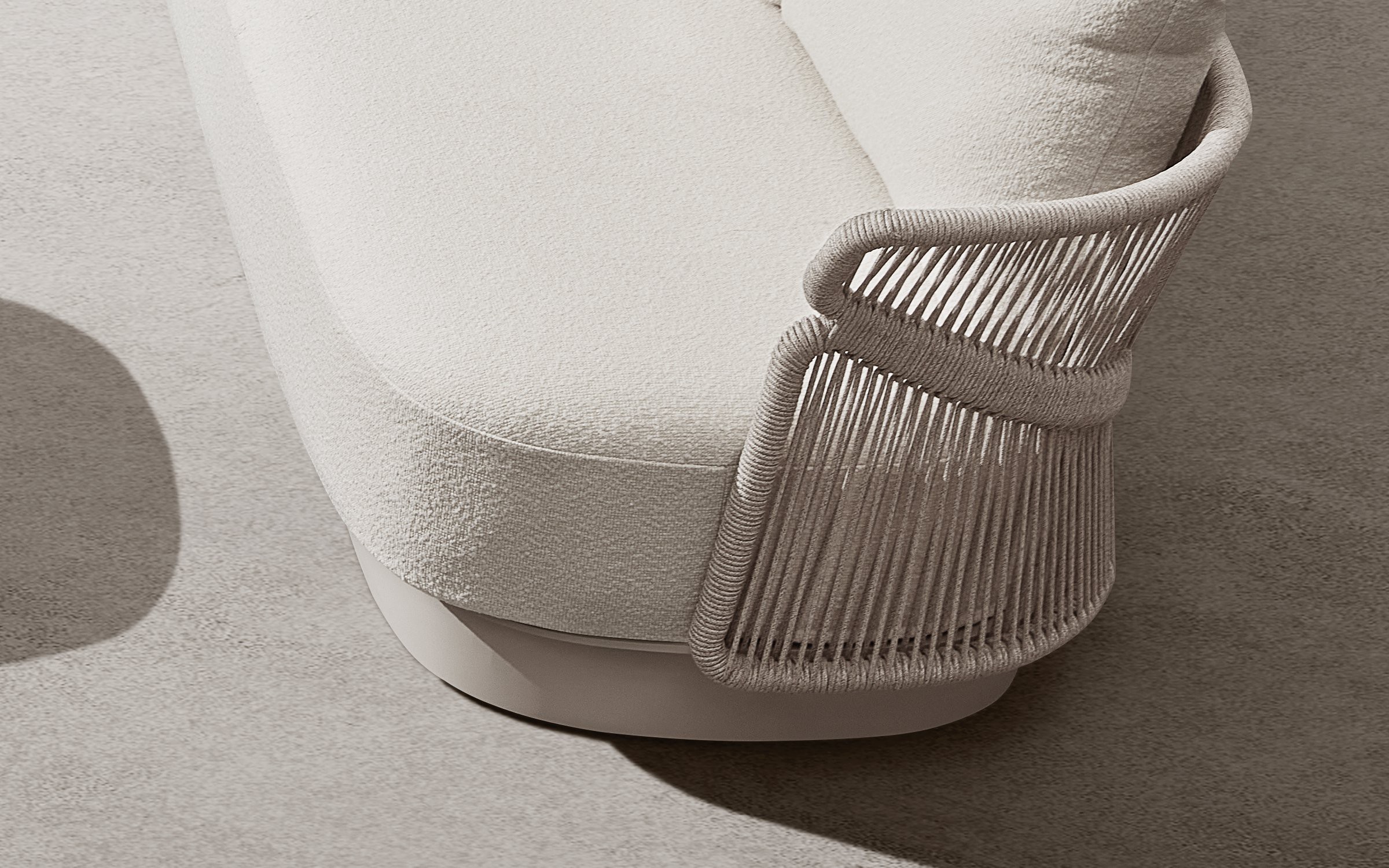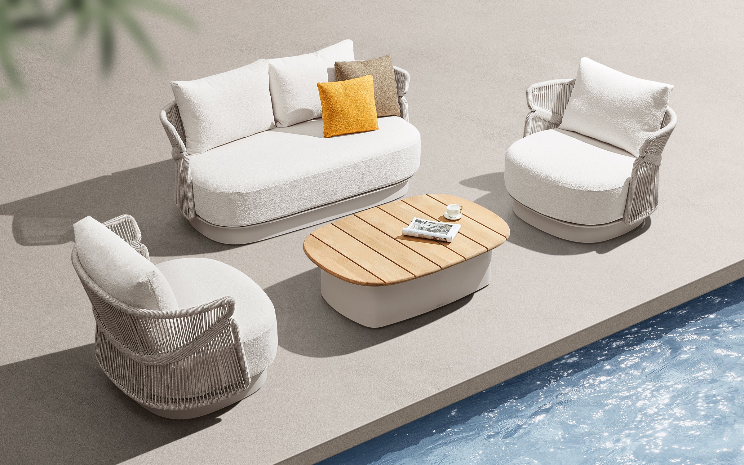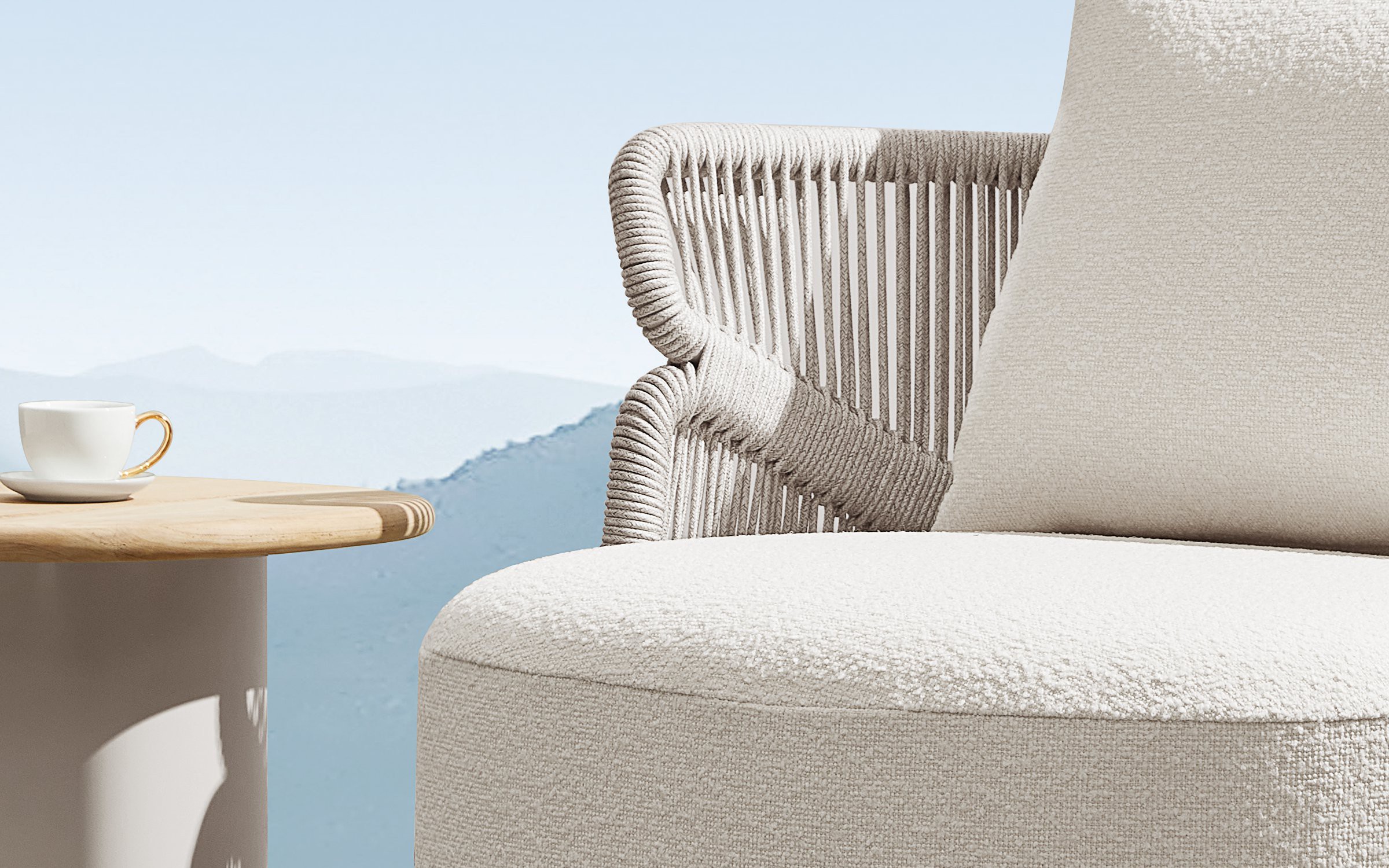 Meble w kolorze jasnobeżowym: poduszki odporne na warunki atmosferyczne ze specjalną pianką, która umożliwia przepływ wody i utrzymuje pierwotny kształt. Poszewki wykonane z materiału Boucle z włókien polipropylenowych odpornych na UV i wodę.