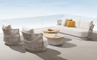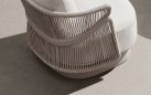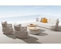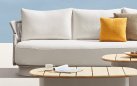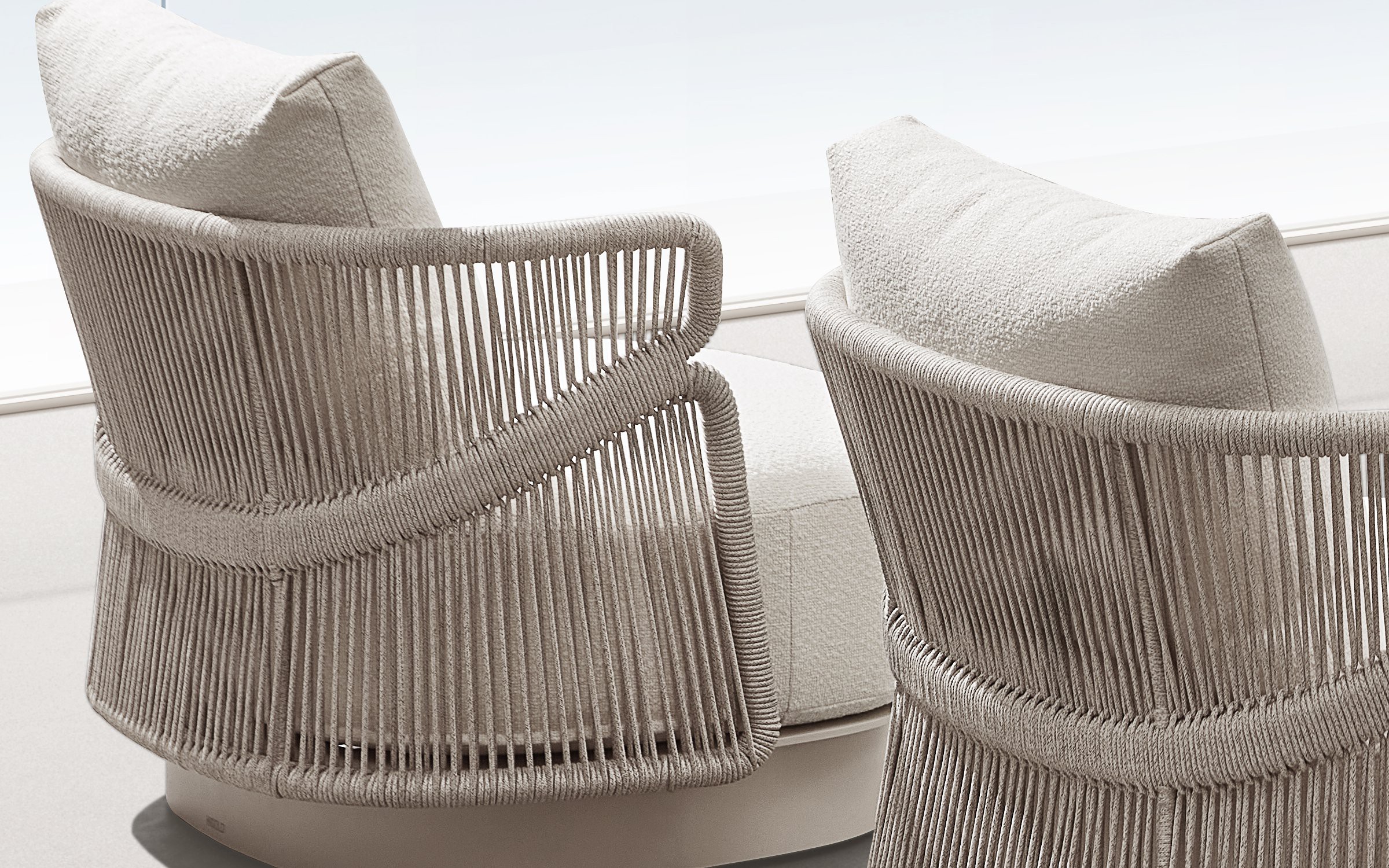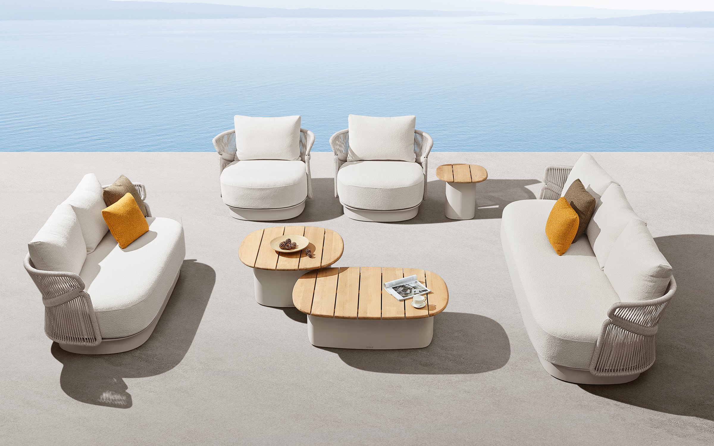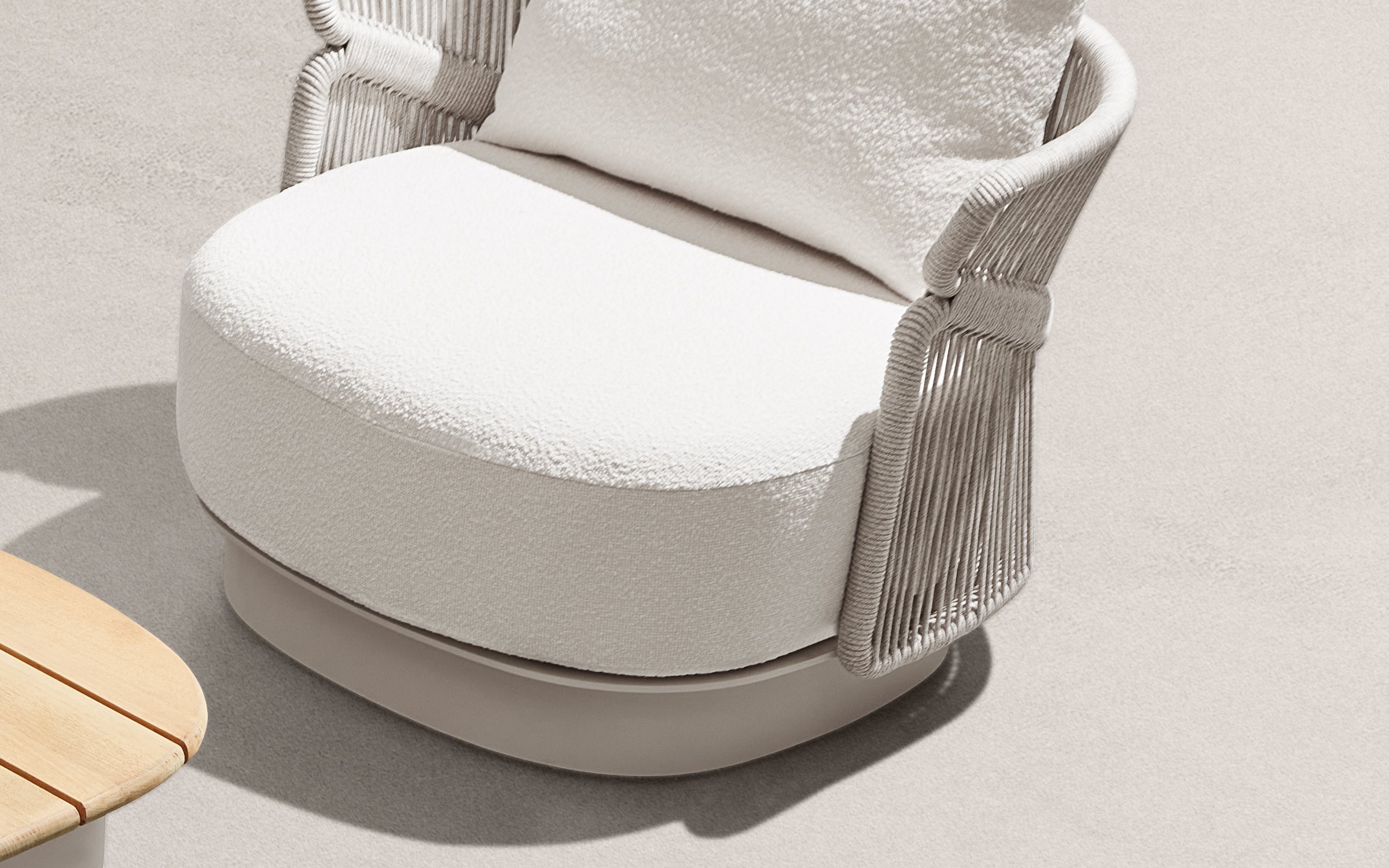 Meble w kolorze jasnobeżowym: poduszki odporne na warunki atmosferyczne ze specjalną pianką, która umożliwia przepływ wody i utrzymuje pierwotny kształt. Poszewki wykonane z materiału Boucle z włókien polipropylenowych odpornych na UV i wodę.