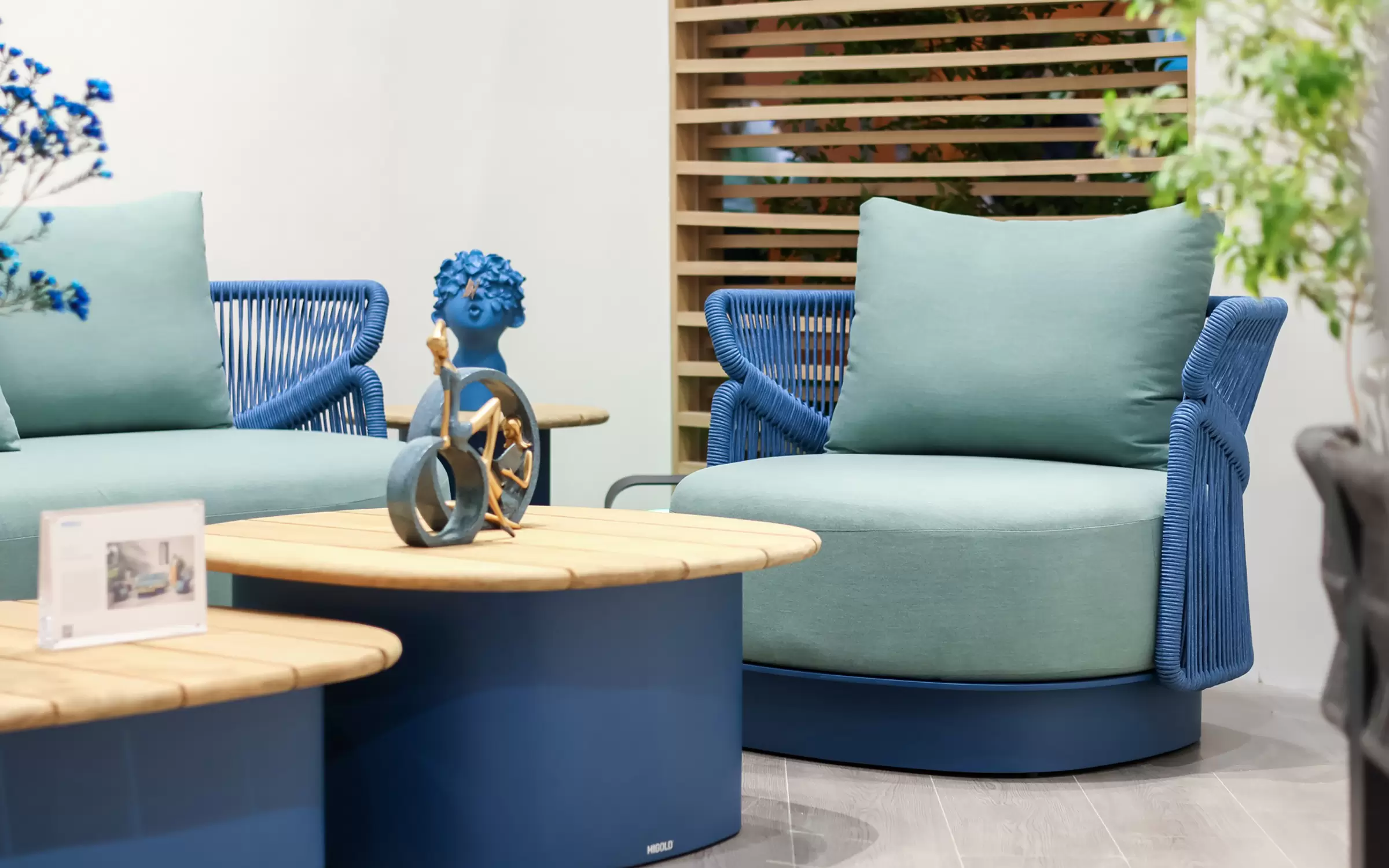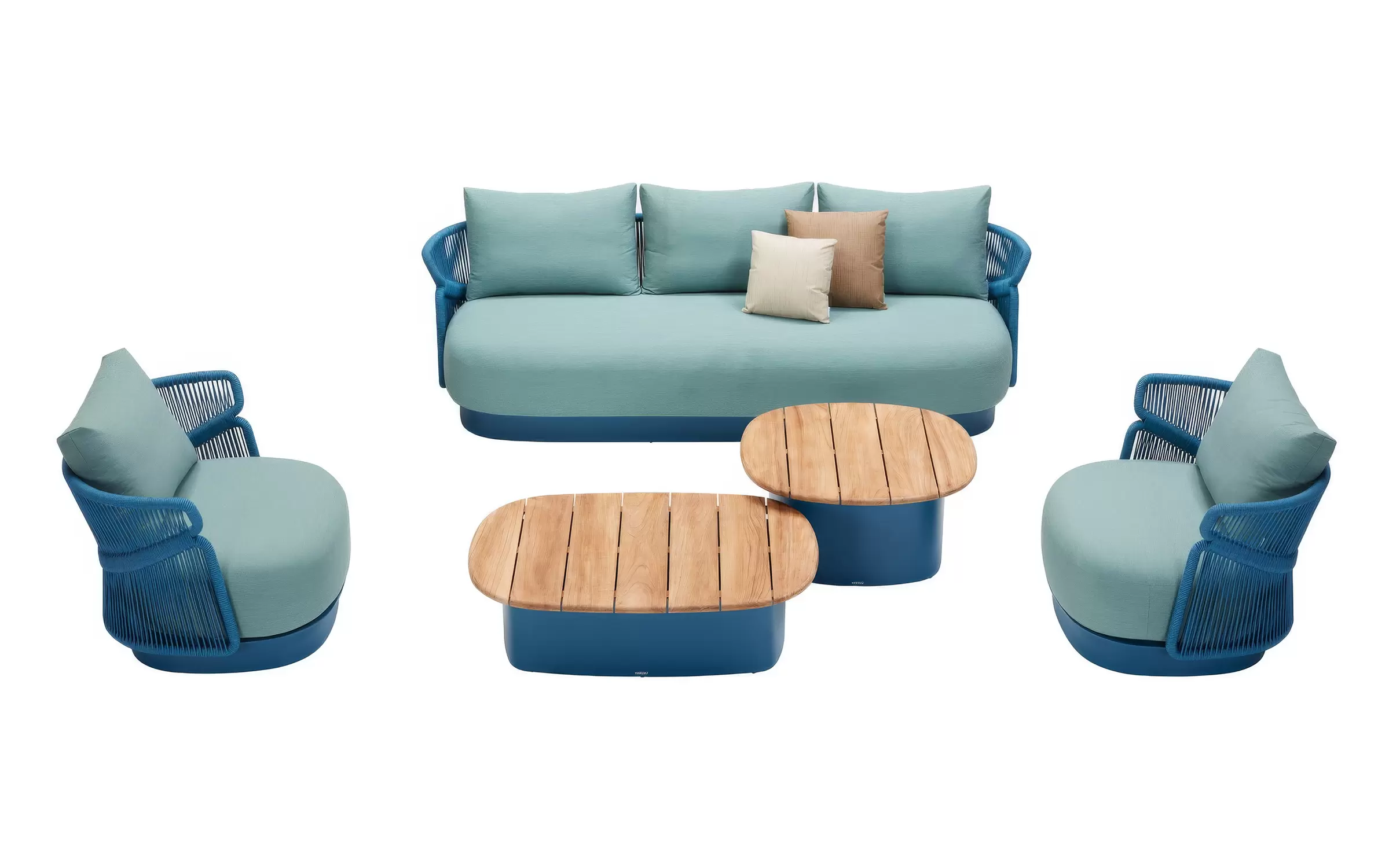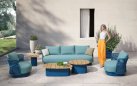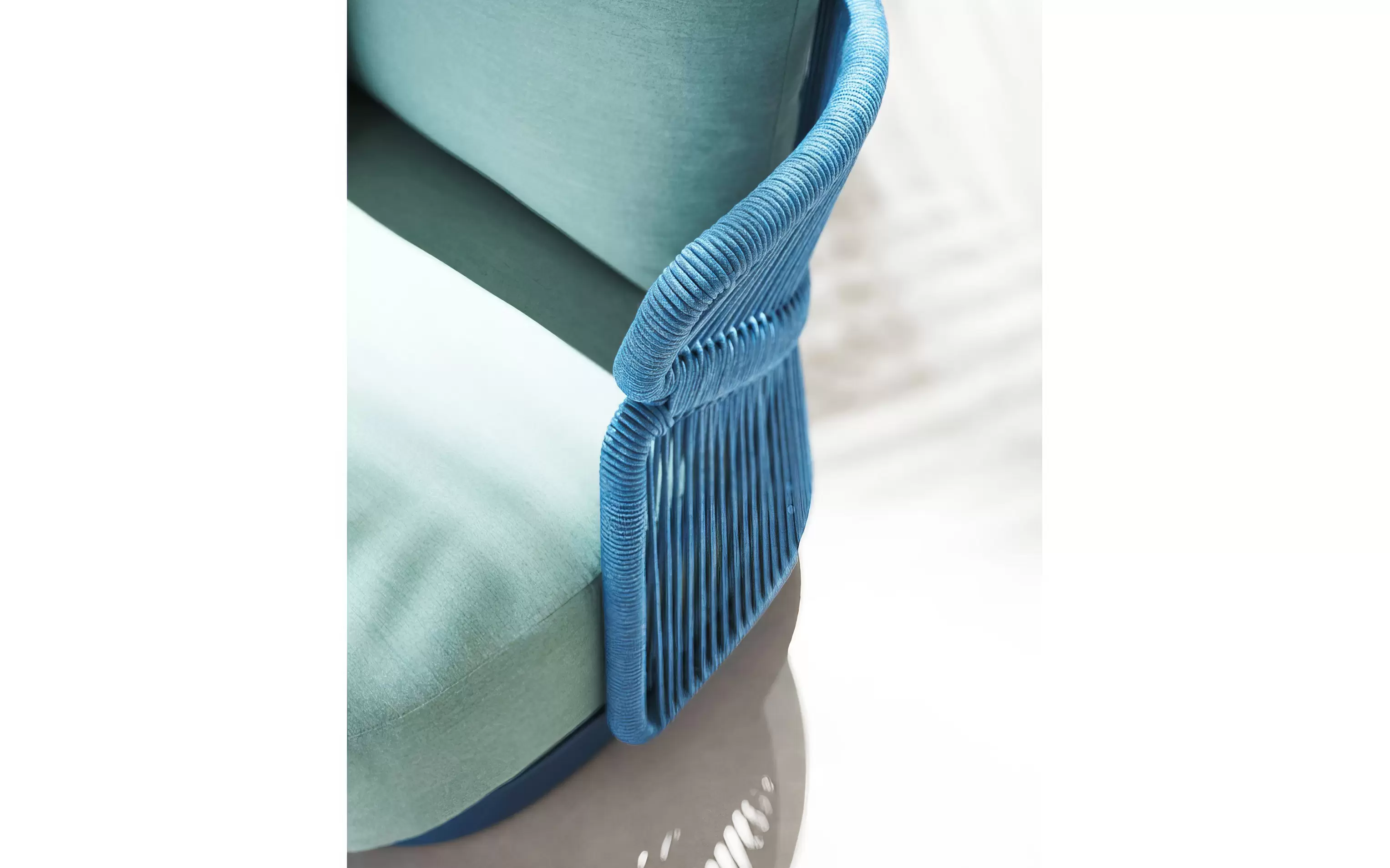Meble w kolorze niebieskim: poduszki Olefin zapewniają wysoki komfort siedzenia i są przystosowane do użytku na zewnątrz. Tkanina jest wyjątkowo trwała, łatwa w czyszczeniu, szybko schnąca, odporna na warunki atmosferyczne i promieniowanie UV, a dzięki zamkowi błyskawicznemu poszewki można łatwo zdjąć. Dla dłuższego zachowania pięknego wyglądu warto chronić poduszki przed intensywnym, nierównomiernym nasłonecznieniem.