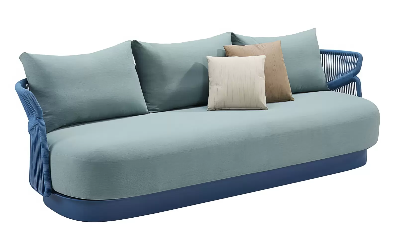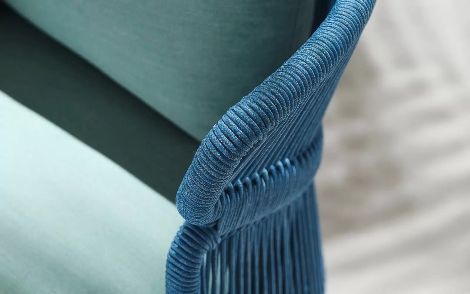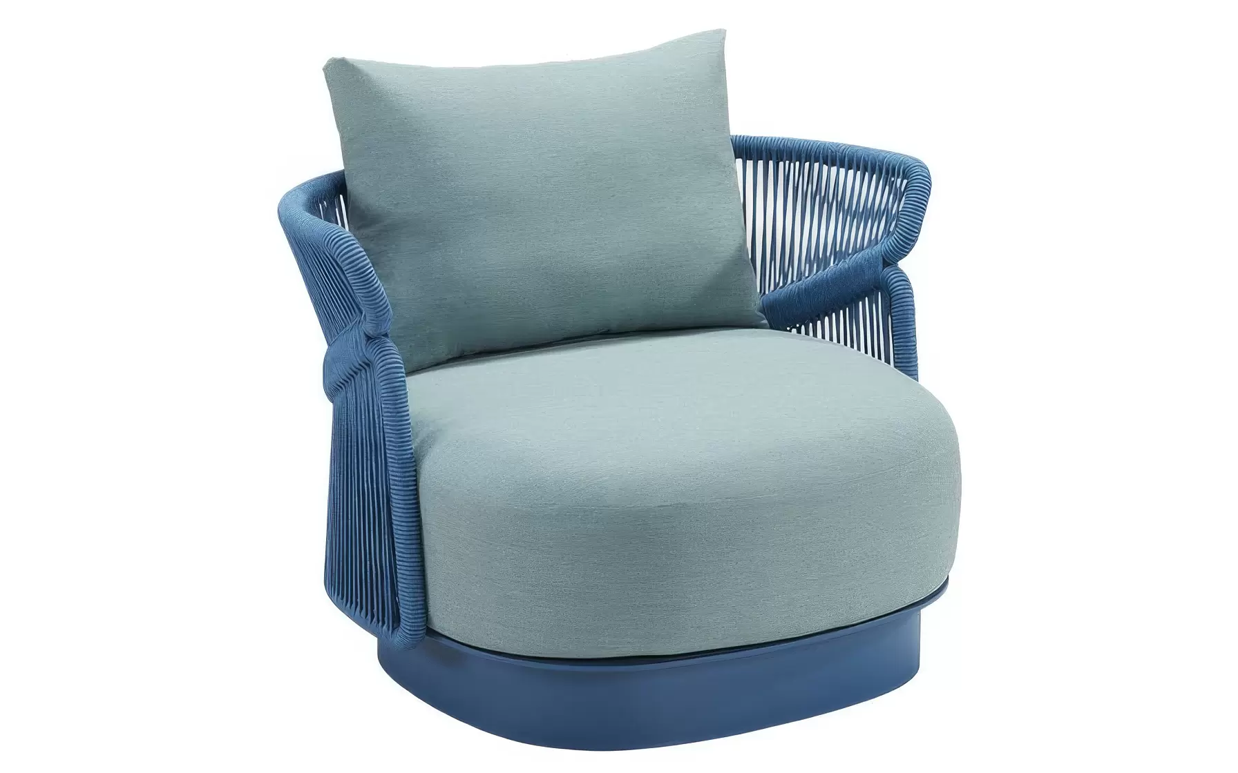 Meble w kolorze niebieskim: poduszki Olefin zapewniają wysoki komfort siedzenia i są przystosowane do użytku na zewnątrz. Tkanina jest wyjątkowo trwała, łatwa w czyszczeniu, szybko schnąca, odporna na warunki atmosferyczne i promieniowanie UV, a dzięki zamkowi błyskawicznemu poszewki można łatwo zdjąć. Dla dłuższego zachowania pięknego wyglądu warto chronić poduszki przed intensywnym, nierównomiernym nasłonecznieniem.