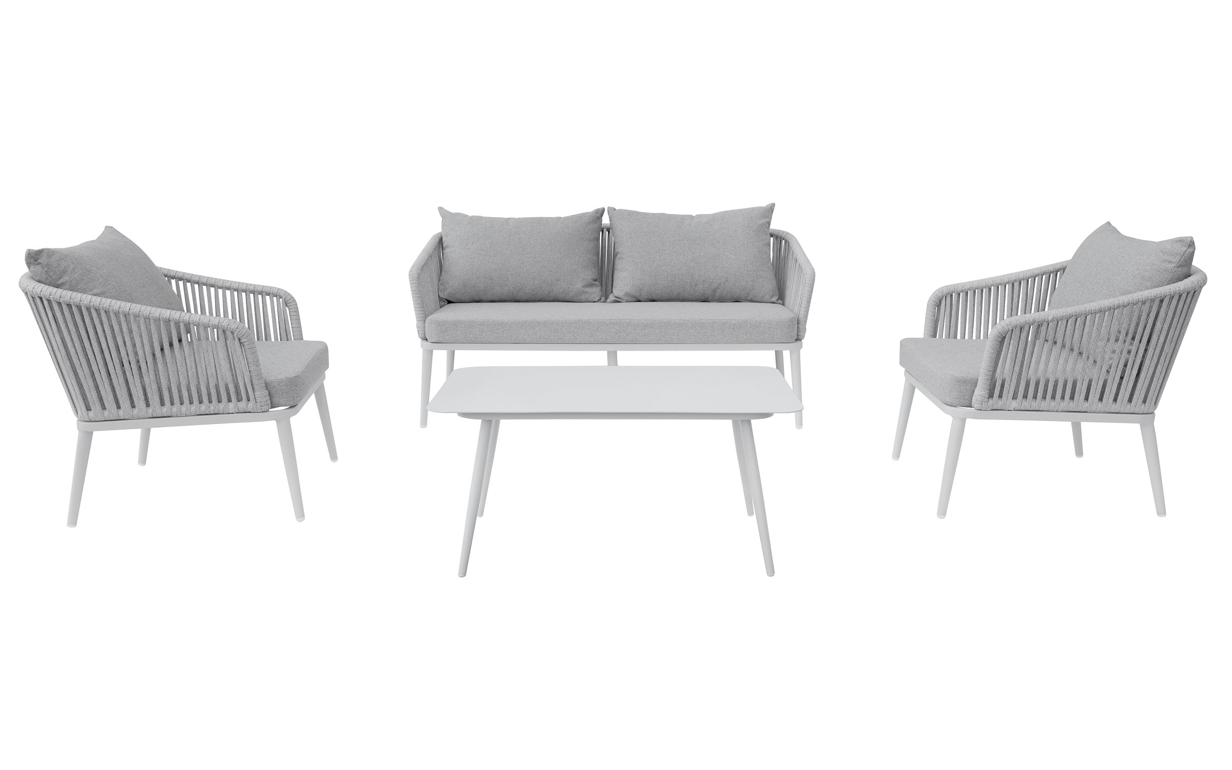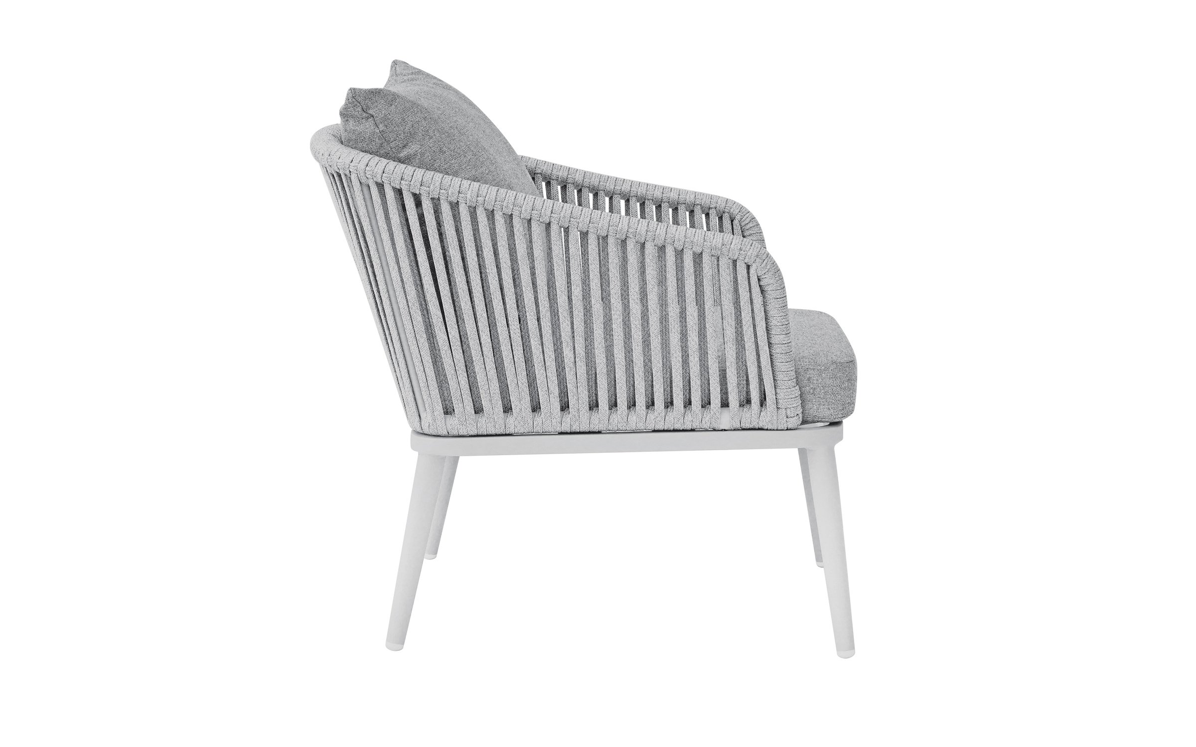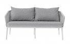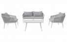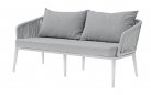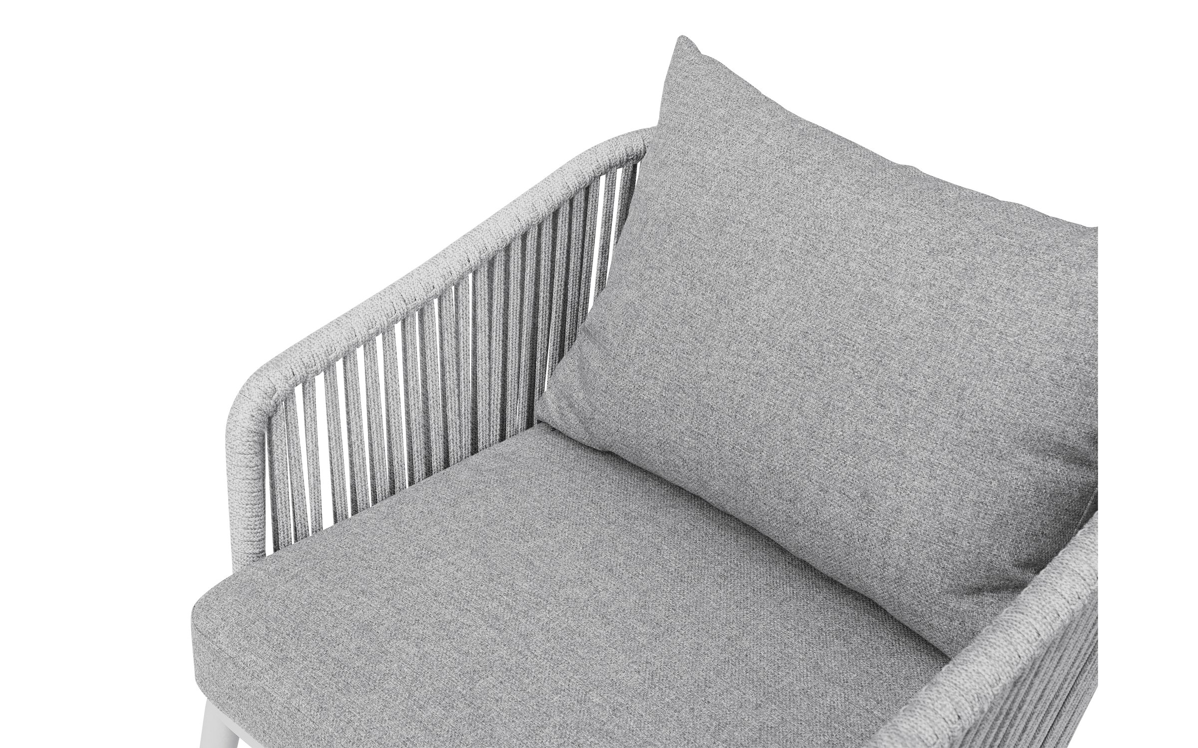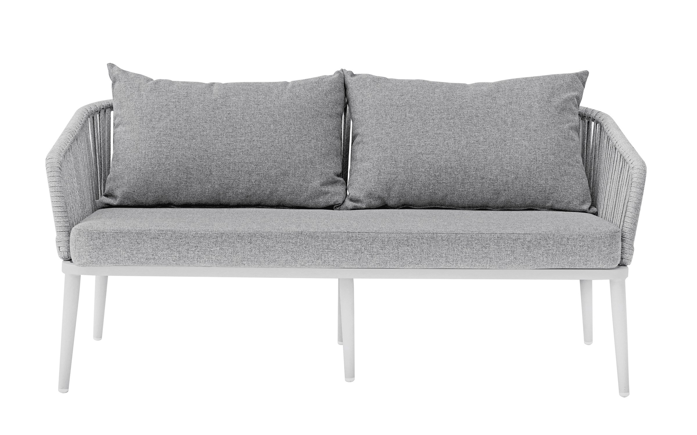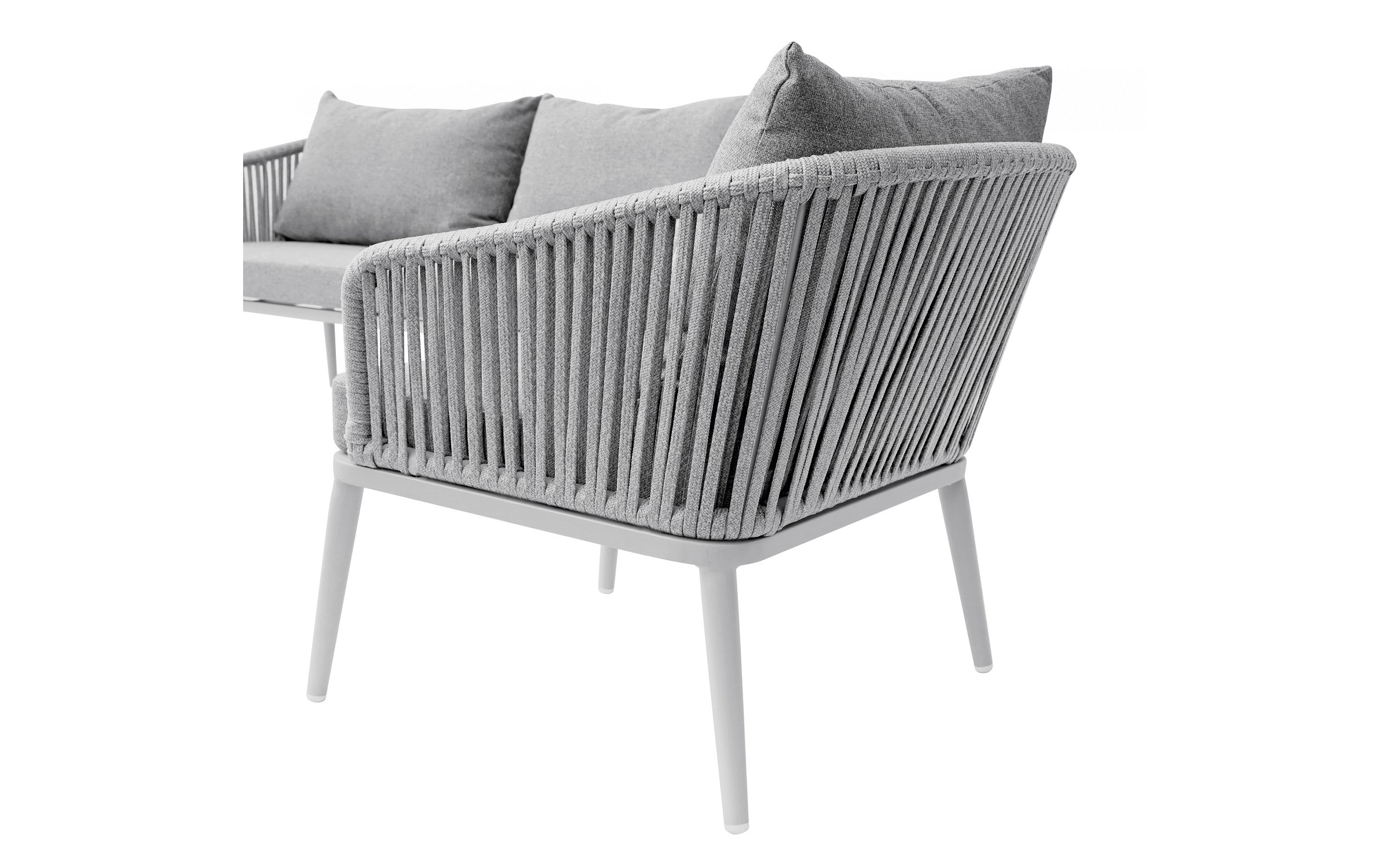 Konstrukcja z aluminium malowanego proszkowo w kolorze białym. Oparcia i boki z plecionej szarej liny. Poduszki zdejmowane w kolorze szarym, odporne na warunki atmosferyczne.