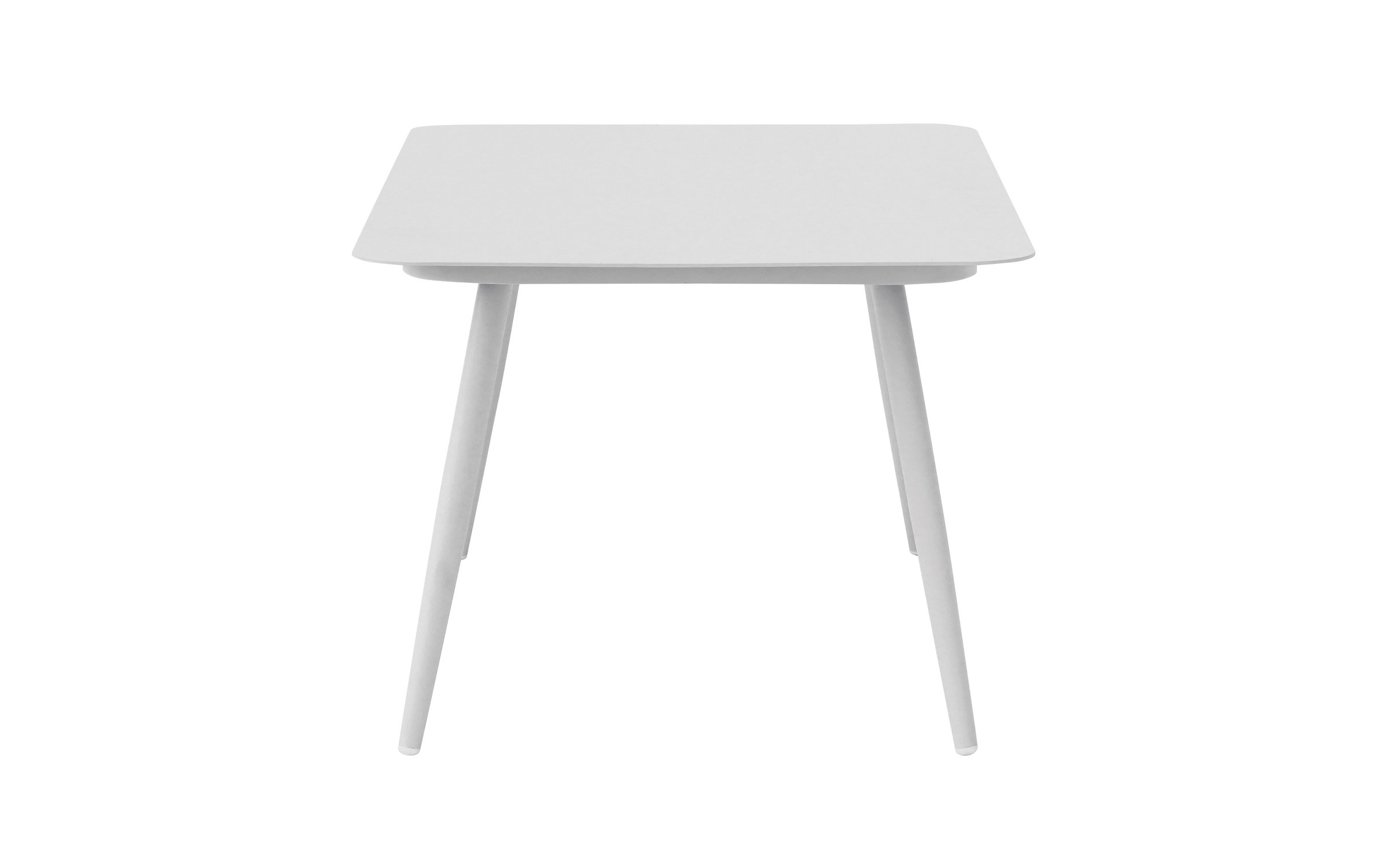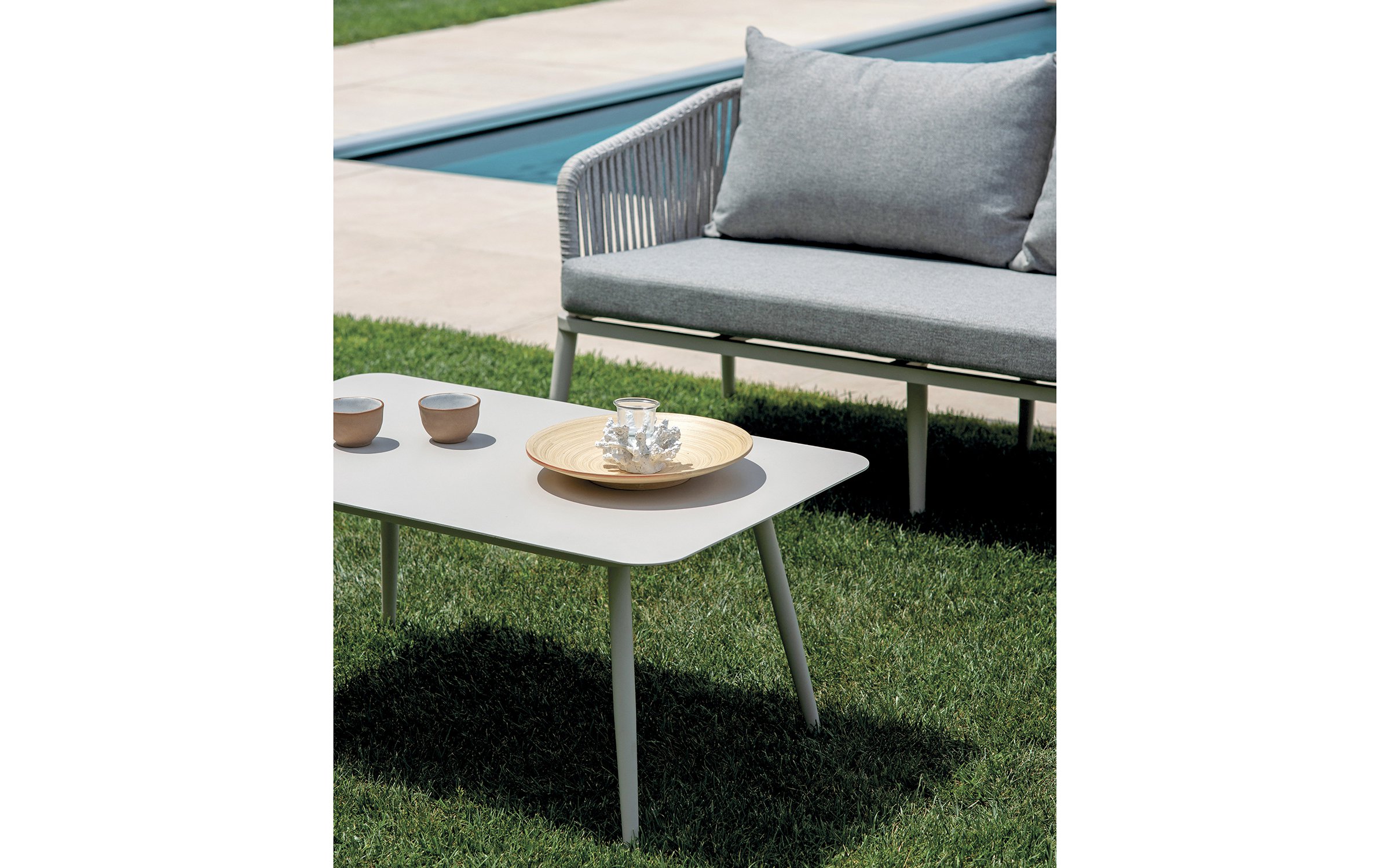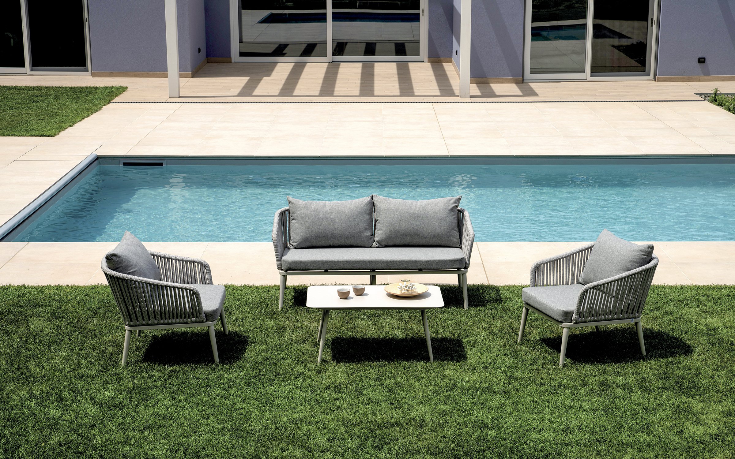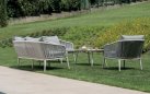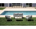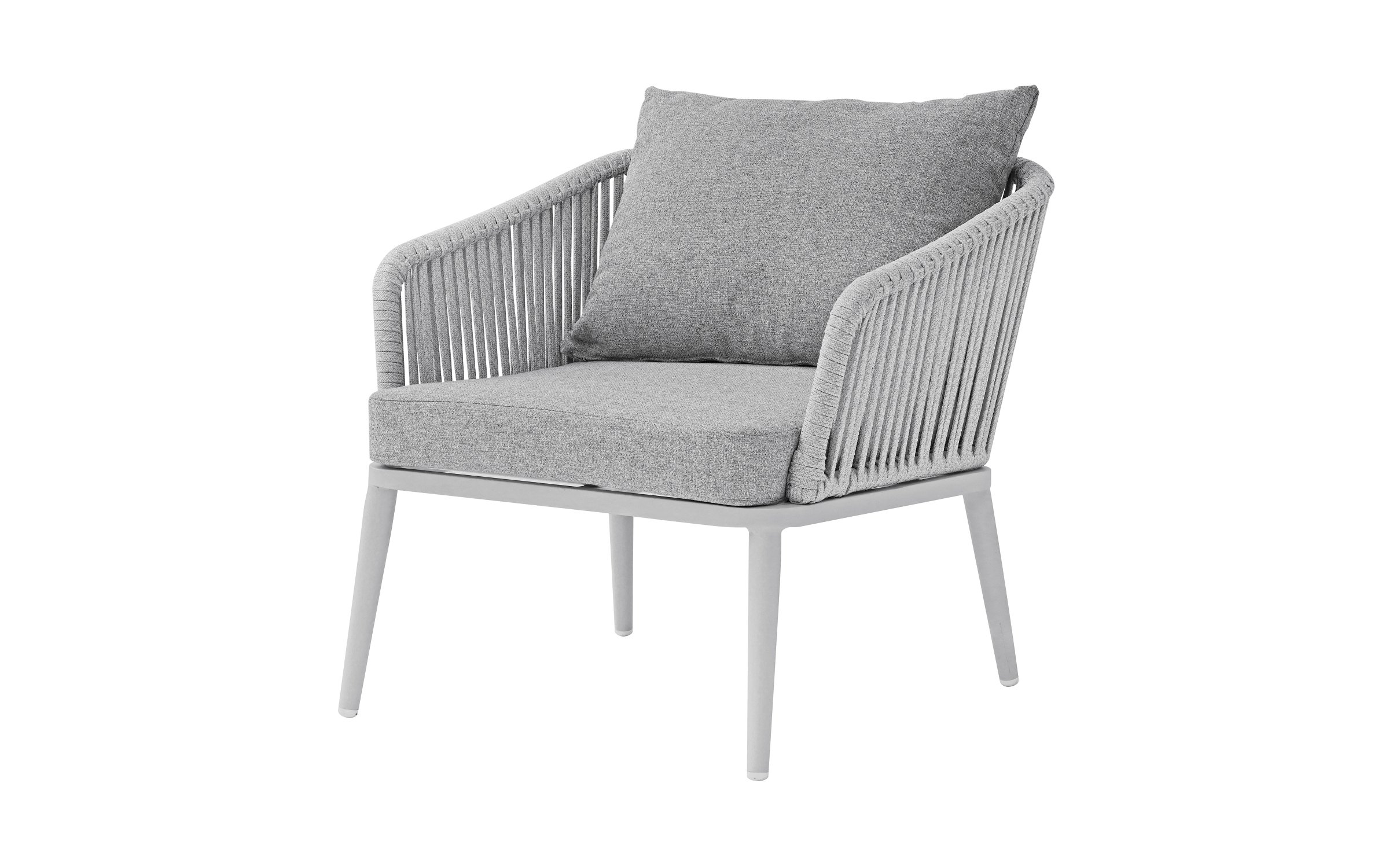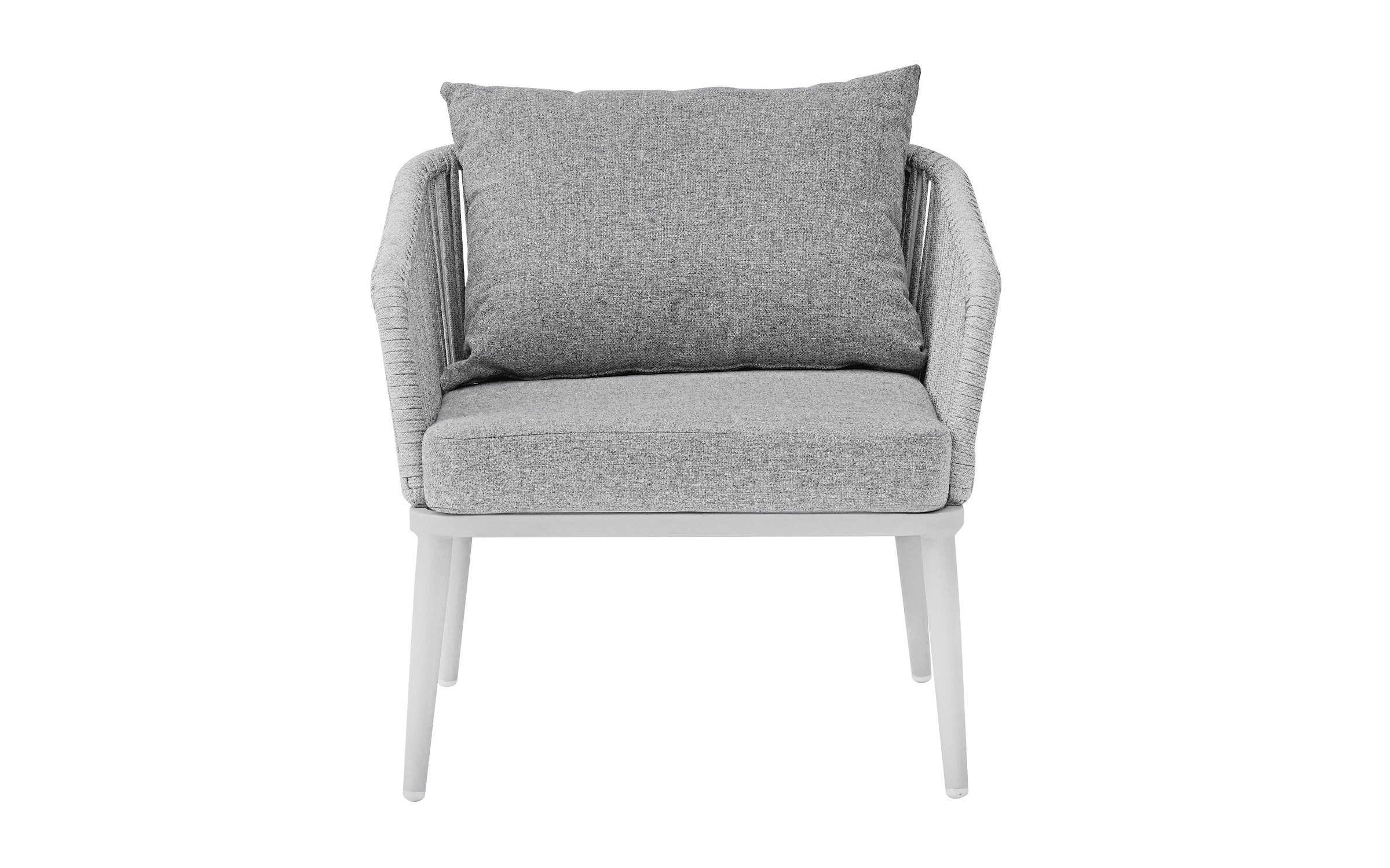 Konstrukcja z aluminium malowanego proszkowo w kolorze białym. Oparcia i boki z plecionej szarej liny. Poduszki zdejmowane w kolorze szarym, odporne na warunki atmosferyczne.