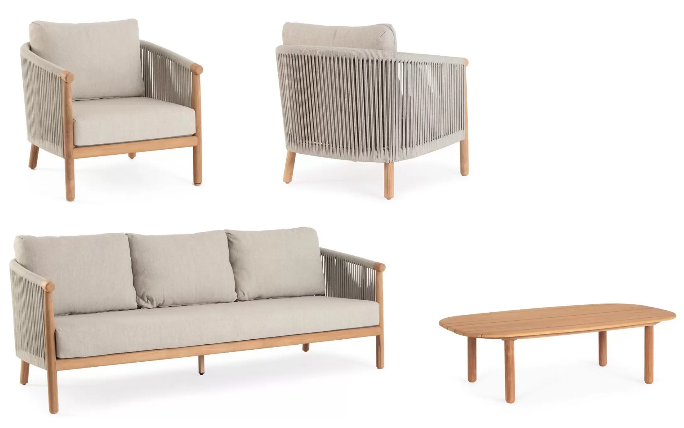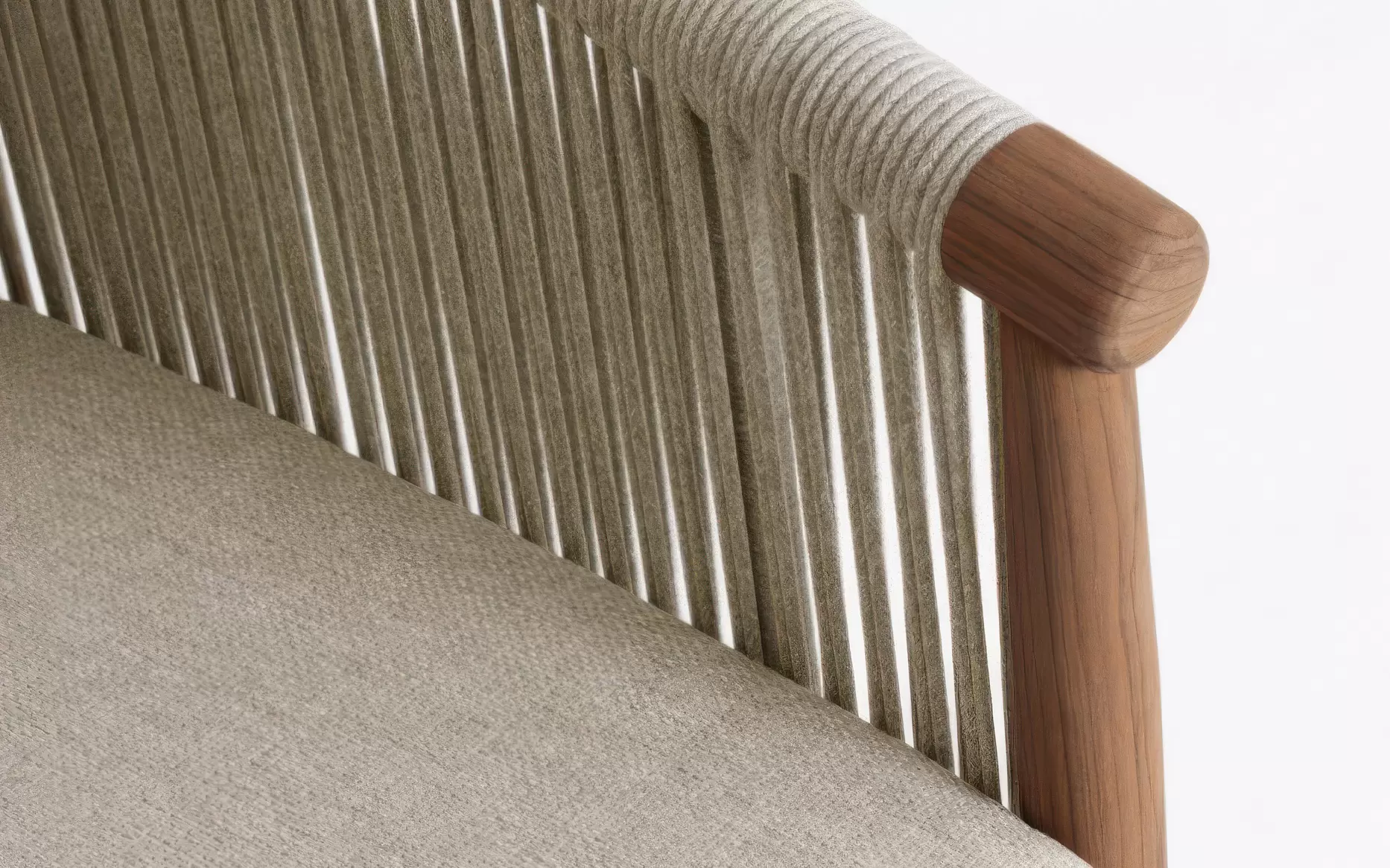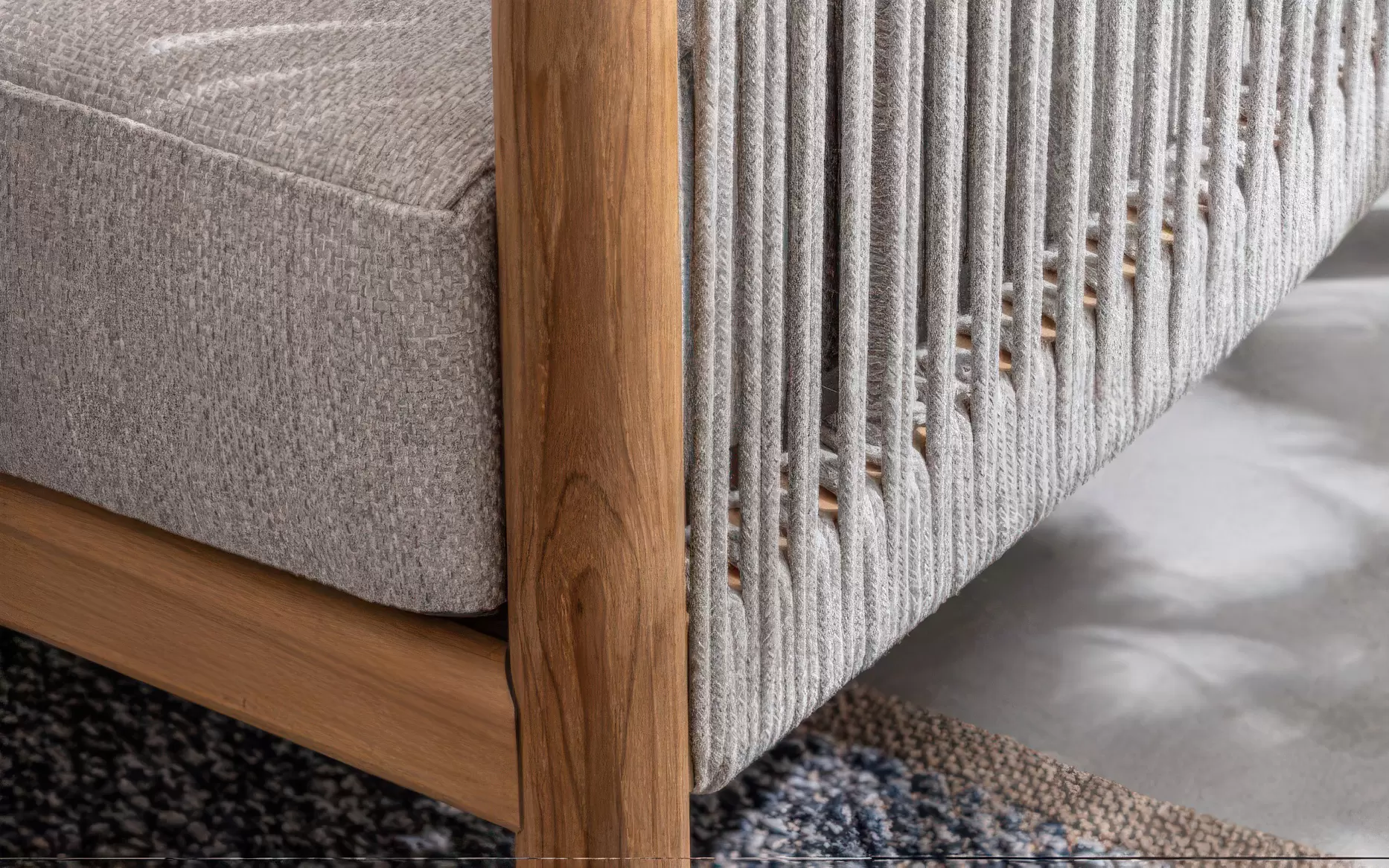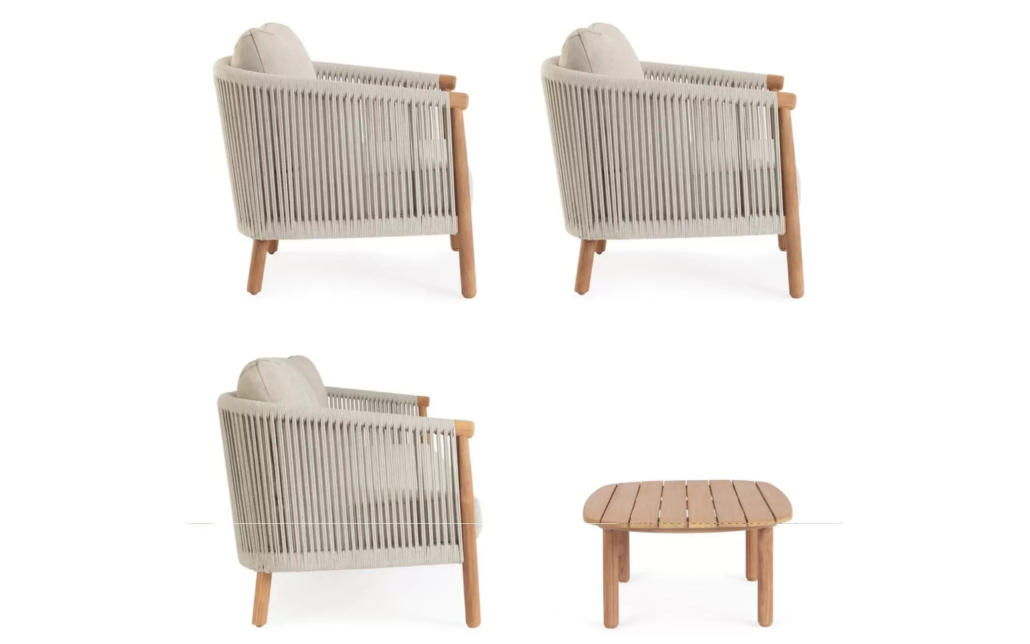 Szkielet mebli oparto na aluminium malowanym proszkowo, co gwarantuje konstrukcji lekkość oraz całkowitą niewrażliwość na procesy korozyjne. Wizualnym dopełnieniem bryły są elementy z naturalnego drewna teak, które zdobią fronty i nogi, przełamując surowość metalu i nadając całości szlachetnego, ponadczasowego wyrazu. Boki oraz oparcia wypełnia gęsty oplot z liny poliestrowej – ten designerski akcent nie tylko nadaje meblom wizualnej lekkości, ale zapewnia również ergonomiczną elastyczność i przewiewność.
