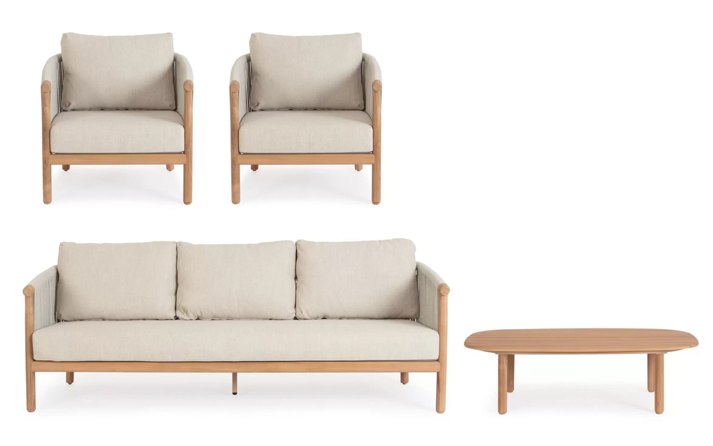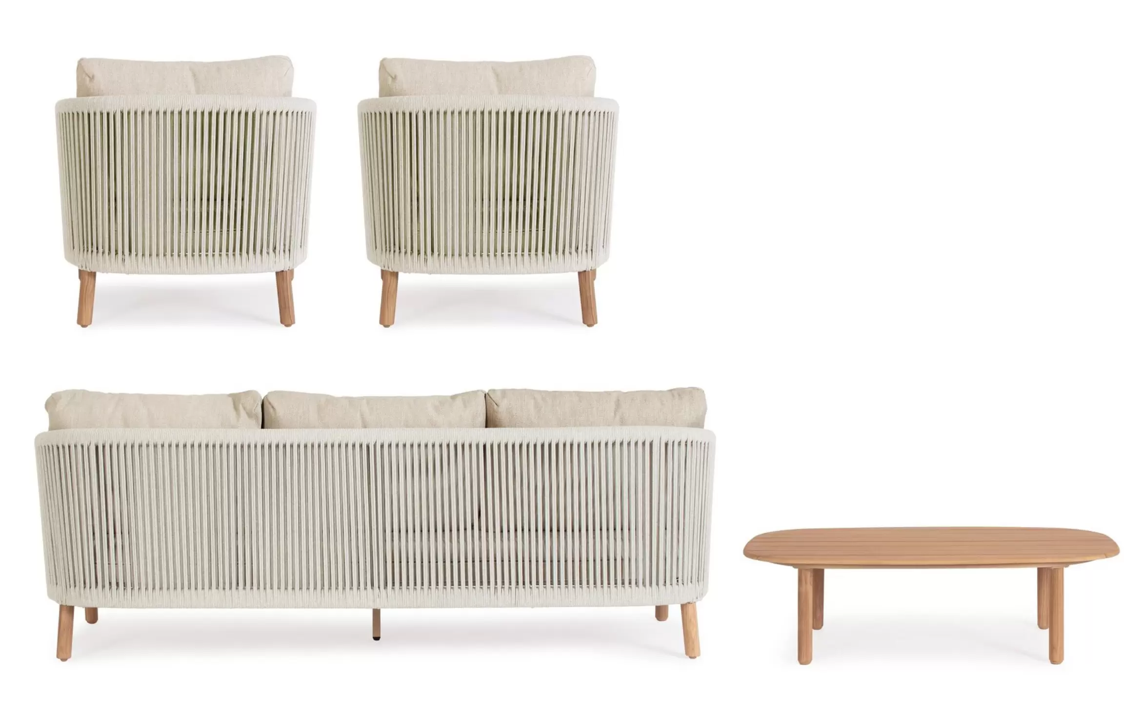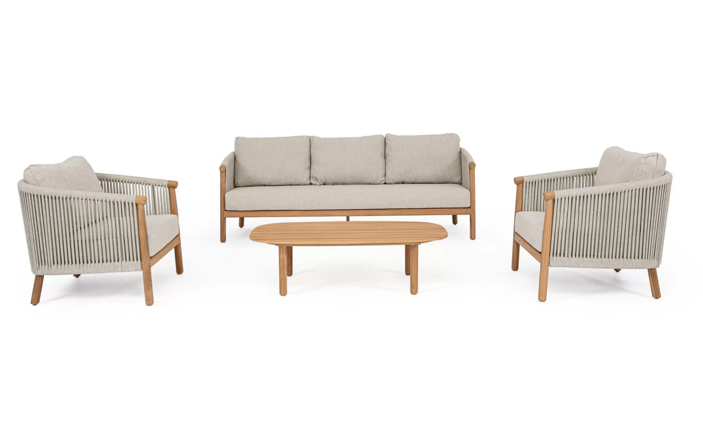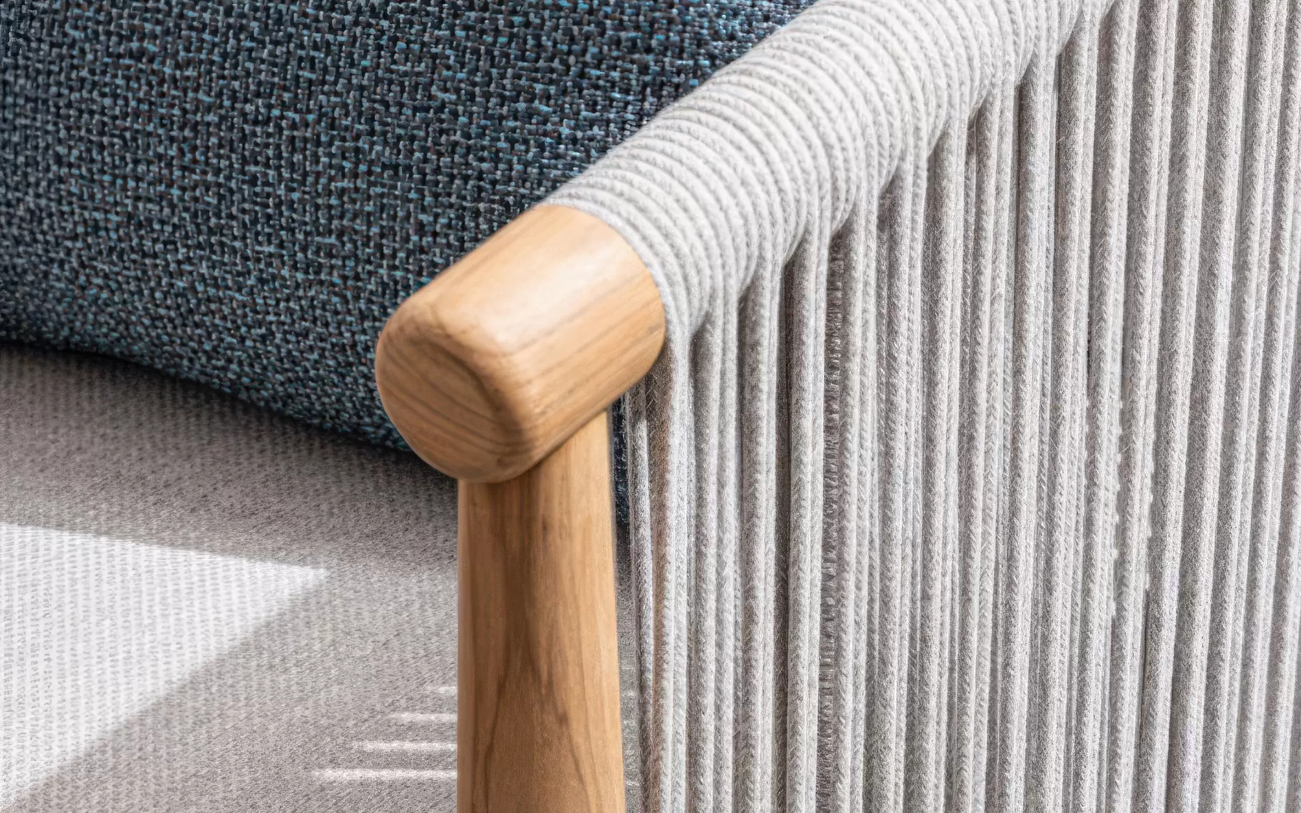 Szkielet mebli oparto na aluminium malowanym proszkowo, co gwarantuje konstrukcji lekkość oraz całkowitą niewrażliwość na procesy korozyjne. Wizualnym dopełnieniem bryły są elementy z naturalnego drewna teak, które zdobią fronty i nogi, przełamując surowość metalu i nadając całości szlachetnego, ponadczasowego wyrazu. Boki oraz oparcia wypełnia gęsty oplot z liny poliestrowej – ten designerski akcent nie tylko nadaje meblom wizualnej lekkości, ale zapewnia również ergonomiczną elastyczność i przewiewność.