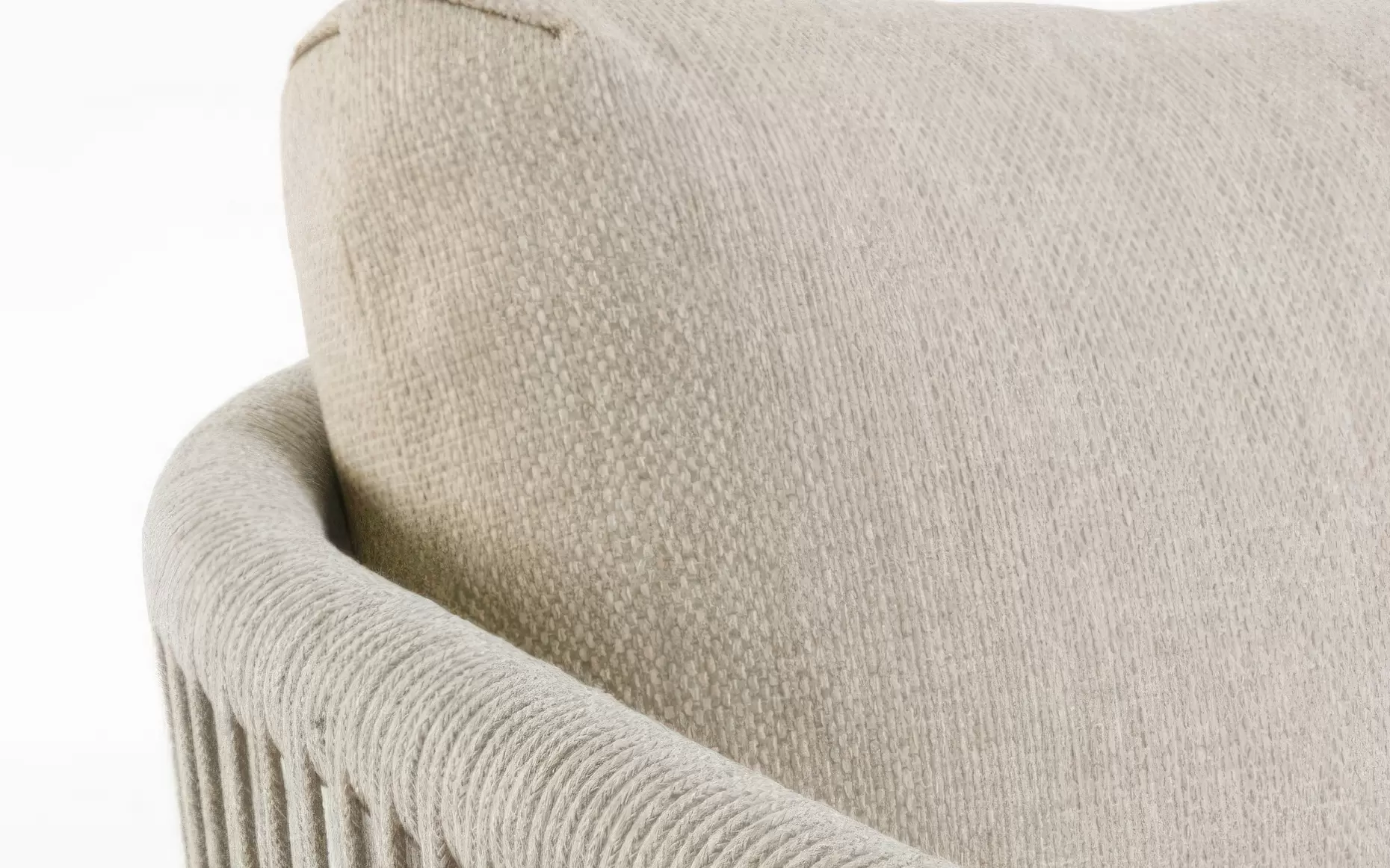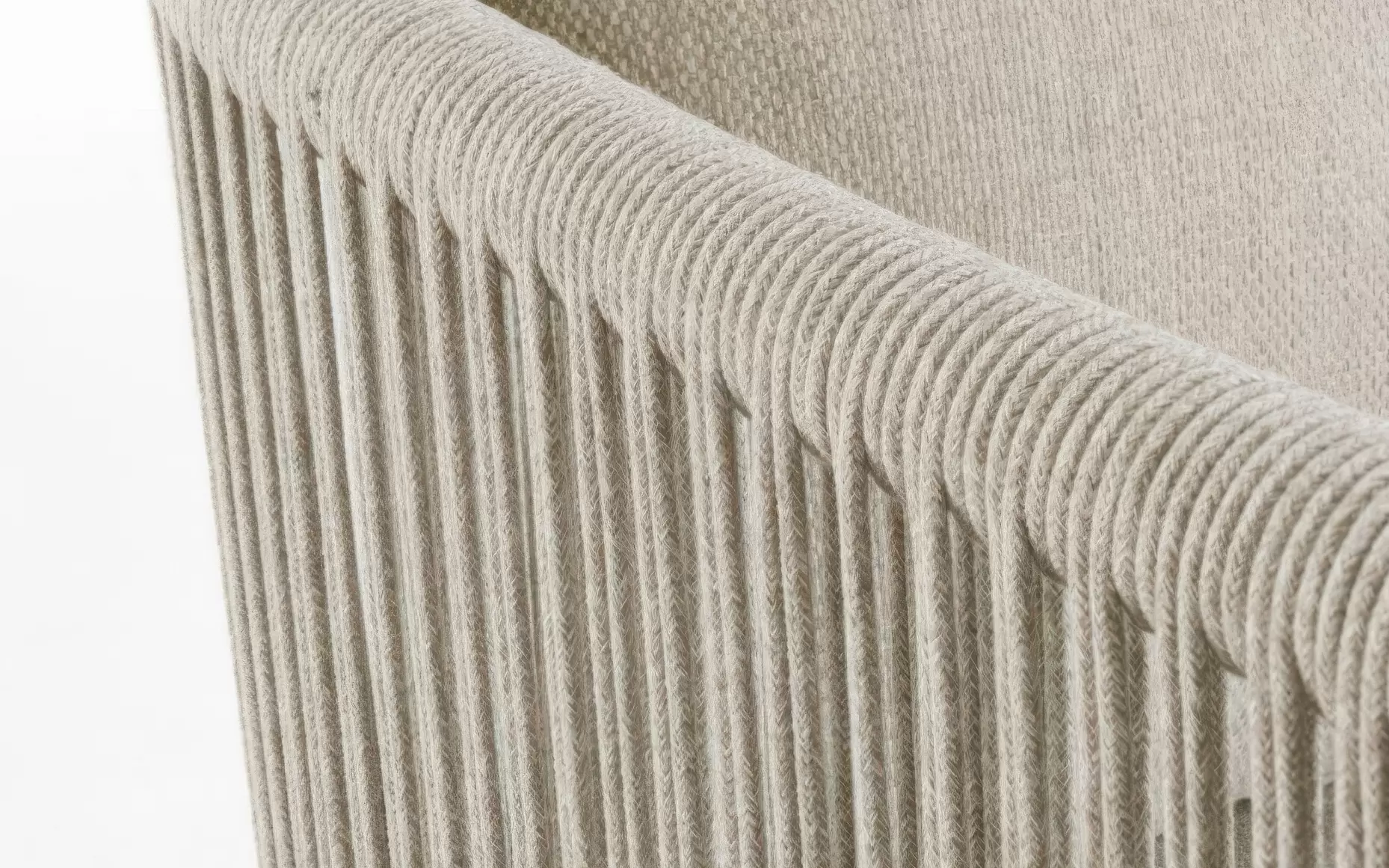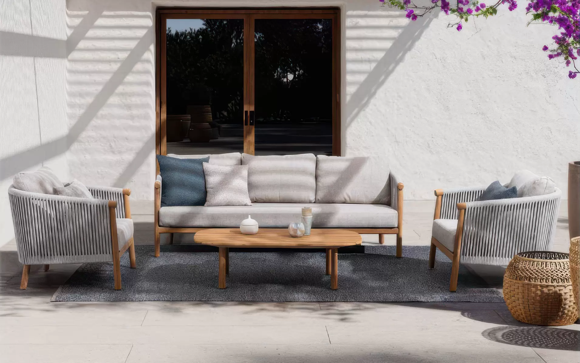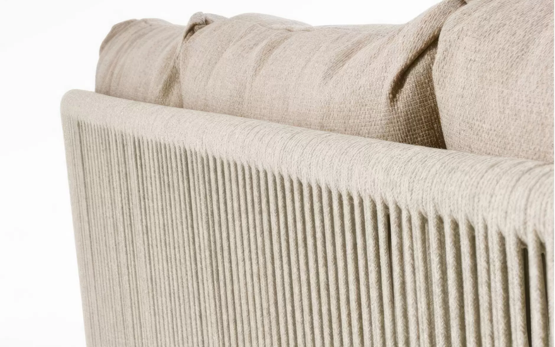 Szkielet mebli oparto na aluminium malowanym proszkowo, co gwarantuje konstrukcji lekkość oraz całkowitą niewrażliwość na procesy korozyjne. Wizualnym dopełnieniem bryły są elementy z naturalnego drewna teak, które zdobią fronty i nogi, przełamując surowość metalu i nadając całości szlachetnego, ponadczasowego wyrazu. Boki oraz oparcia wypełnia gęsty oplot z liny poliestrowej – ten designerski akcent nie tylko nadaje meblom wizualnej lekkości, ale zapewnia również ergonomiczną elastyczność i przewiewność.
