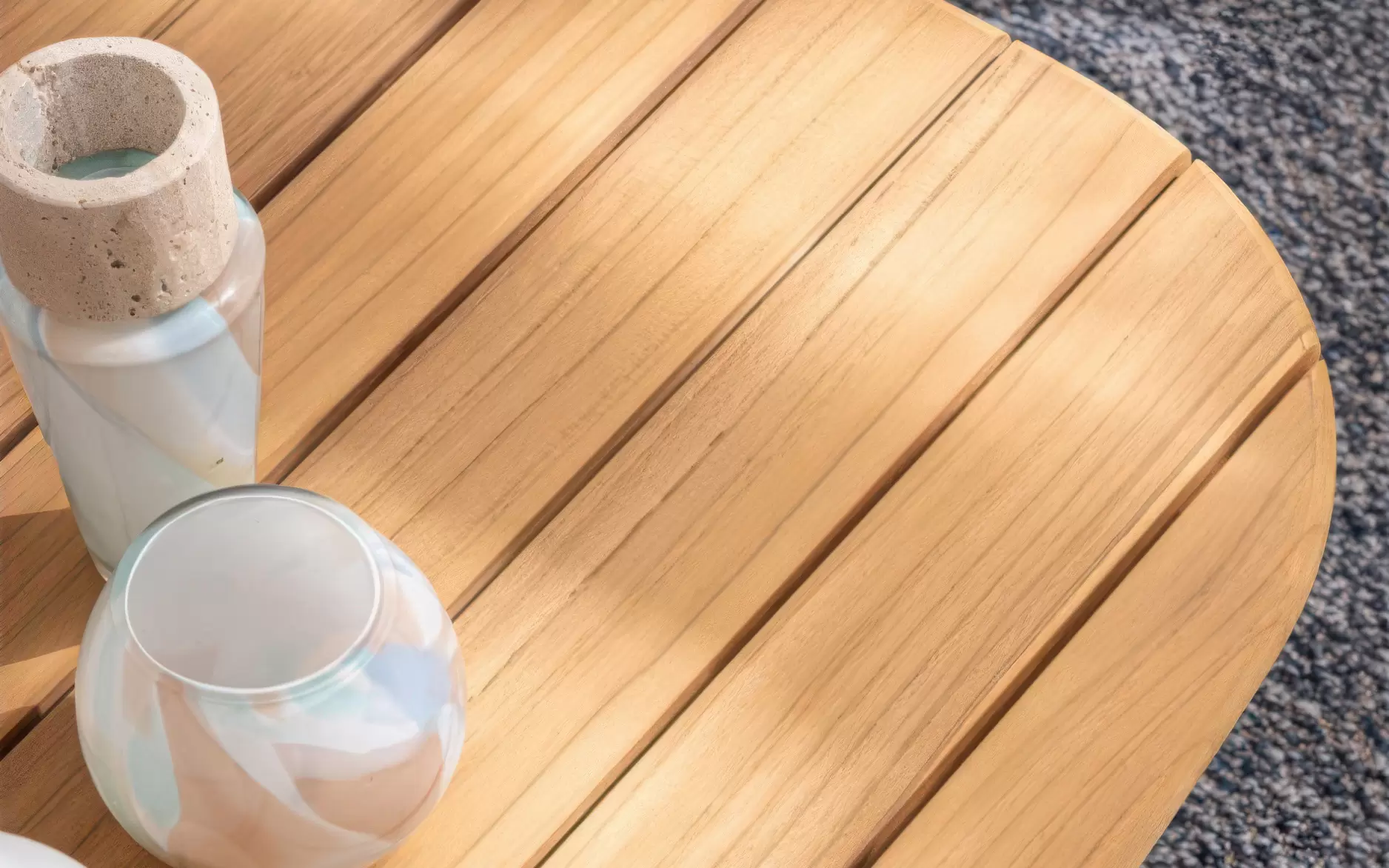Teak naturalny – drewno o legendarnych właściwościach wytrzymałościowych, nasycone naturalnymi olejami i kwasem krzemowym. Te unikalne cechy sprawiają, że surowiec jest niemal całkowicie niewrażliwy na gnicie, starzenie i pęcznienie. Z czasem teak może pokryć się srebrzystą patyną, co jest procesem naturalnym i nie wpływa na integralność strukturalną mebla.