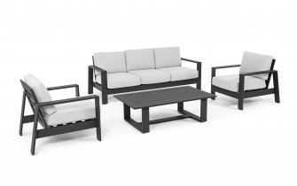 Aluminiowy zestaw wypoczynkowy z poduszkami z materialu Olefin. Powierzchnie aluminiowe pokryte trwałą powloką imitującą powłokę drewnian¹. Bardzo szeroka sofa oraz wysokiej jakości poduszki o gęstej sprężystej piance z poszewkami Olefin zapewniają ogromną wygodę na tarasie.