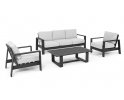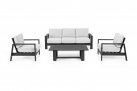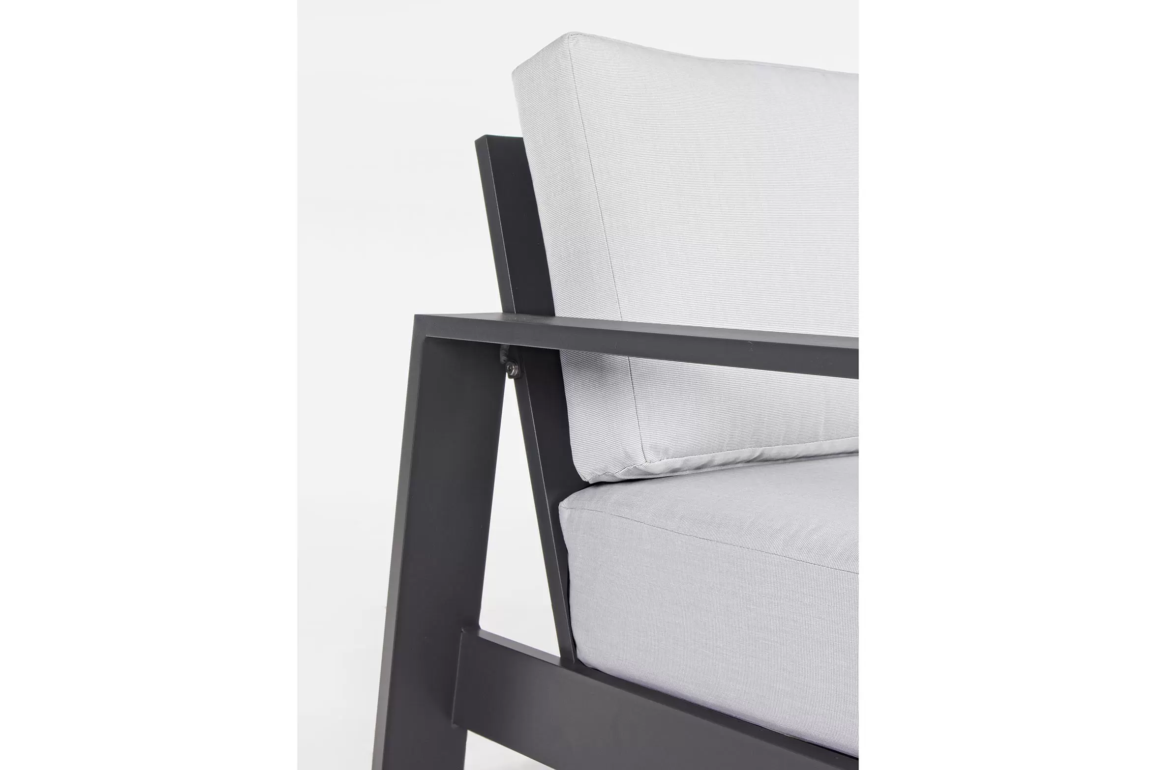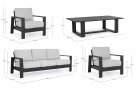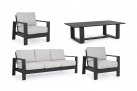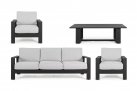 Aluminiowy zestaw wypoczynkowy z poduszkami z materiału Olefin. Bardzo szeroka sofa oraz wysokiej jakości poduszki o gęstej sprężystej piance z poszewkami Olefin zapewniają ogromną wygodę na tarasie.