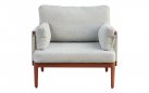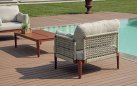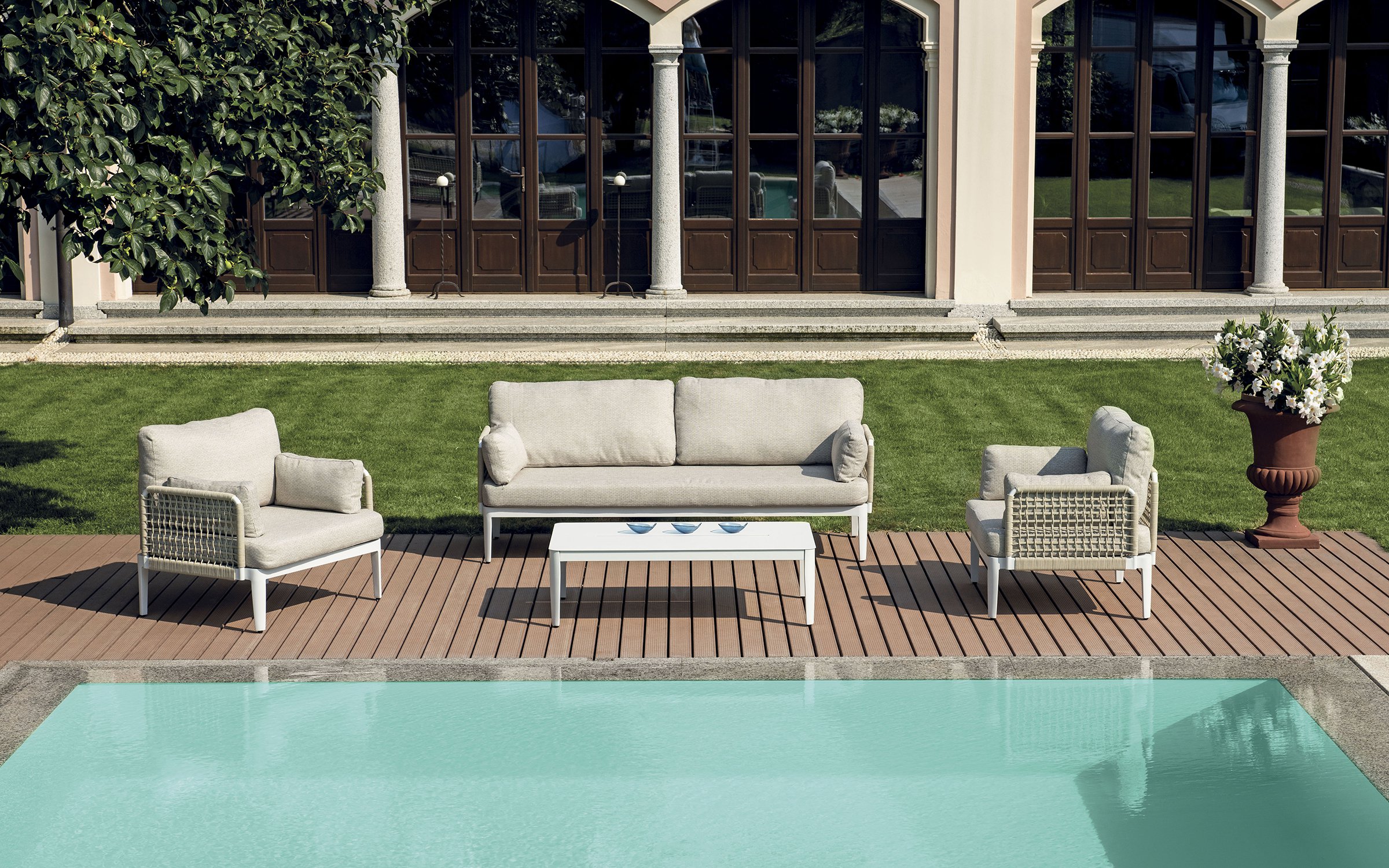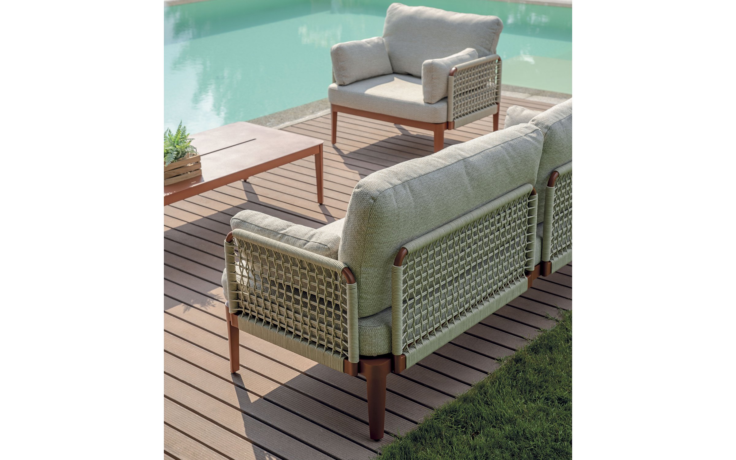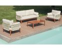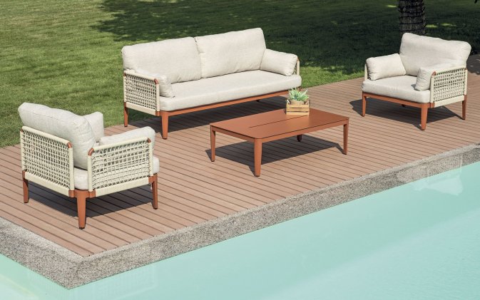 Konstrukcja z aluminium malowanego proszkowo. Oparcia z plecionej liny beżowej. Blat stolika z aluminium. Poduszki zdejmowane w kolorze beżowym, wykonane z tkaniny Olefin.