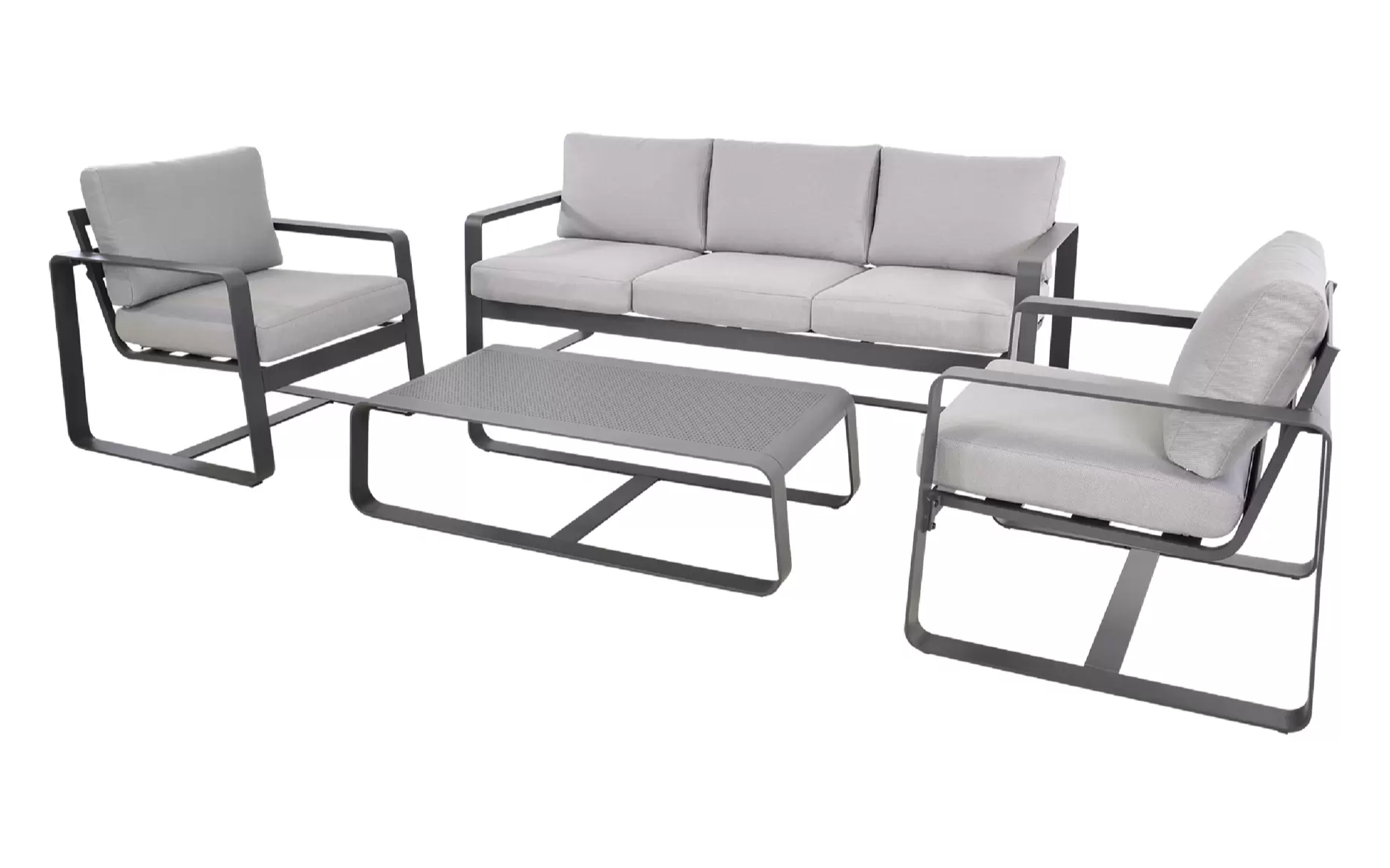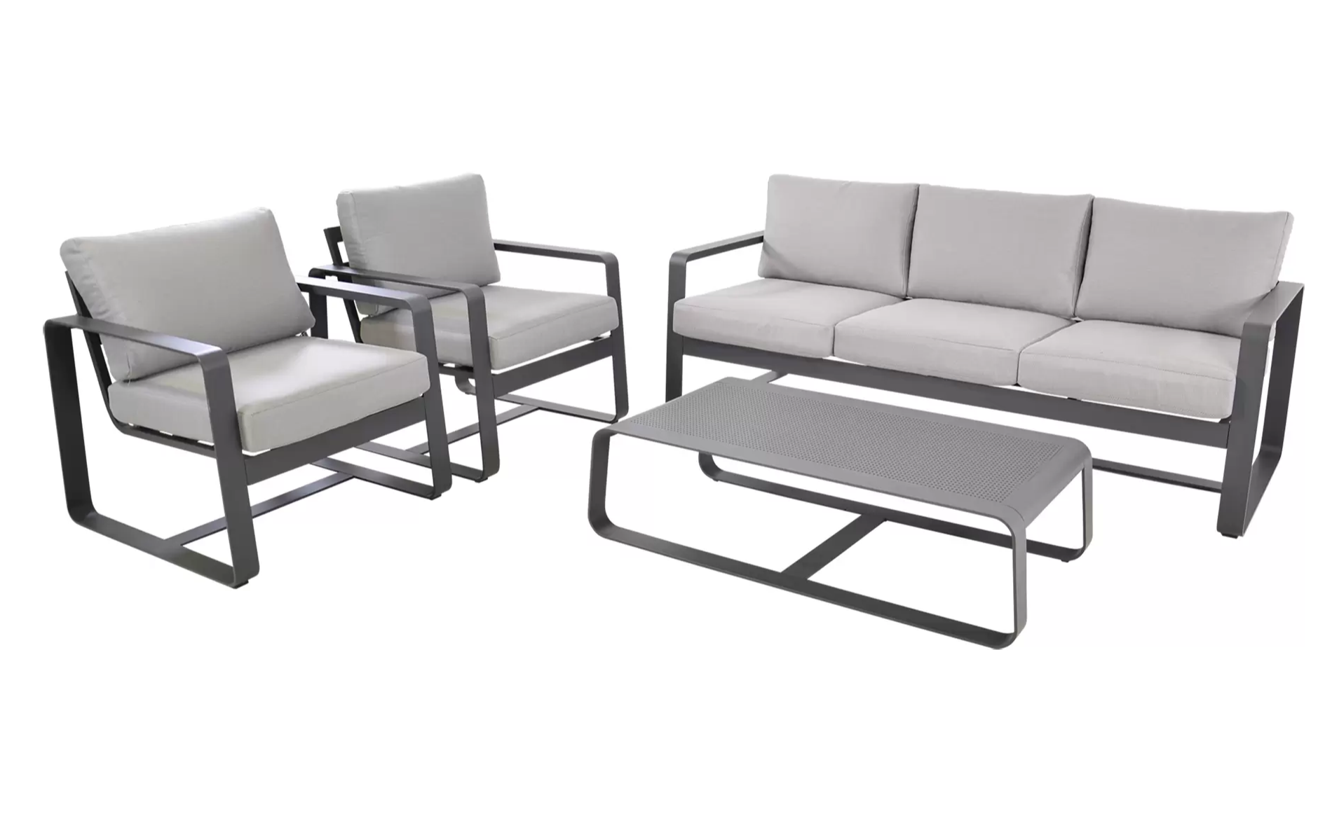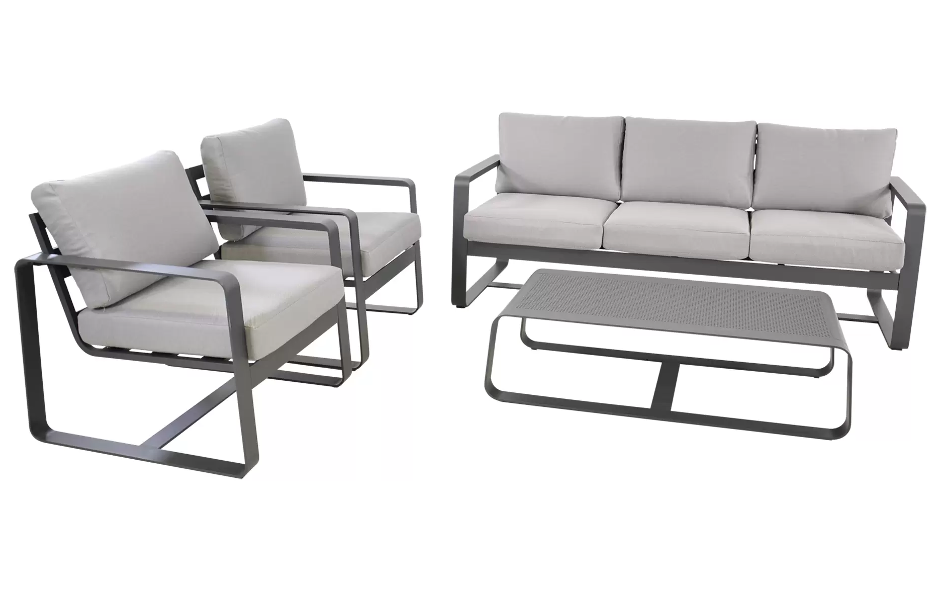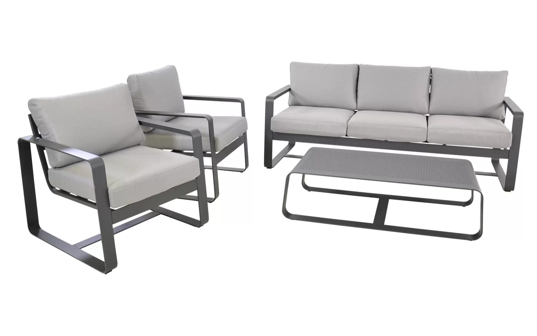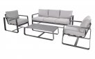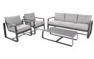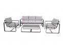 Solidna konstrukcja z aluminium malowanego proszkowo zapewnia trwałość i odporność na zmienne warunki atmosferyczne. Miękkie poduszki wykonane z tkaniny olefin o gramaturze 270 g/m² gwarantują wygodę i pełen komfort wypoczynku. W skład zestawu wchodzi przestronna sofa, dwa fotele oraz praktyczny stolik kawowy z aluminiowym blatem.