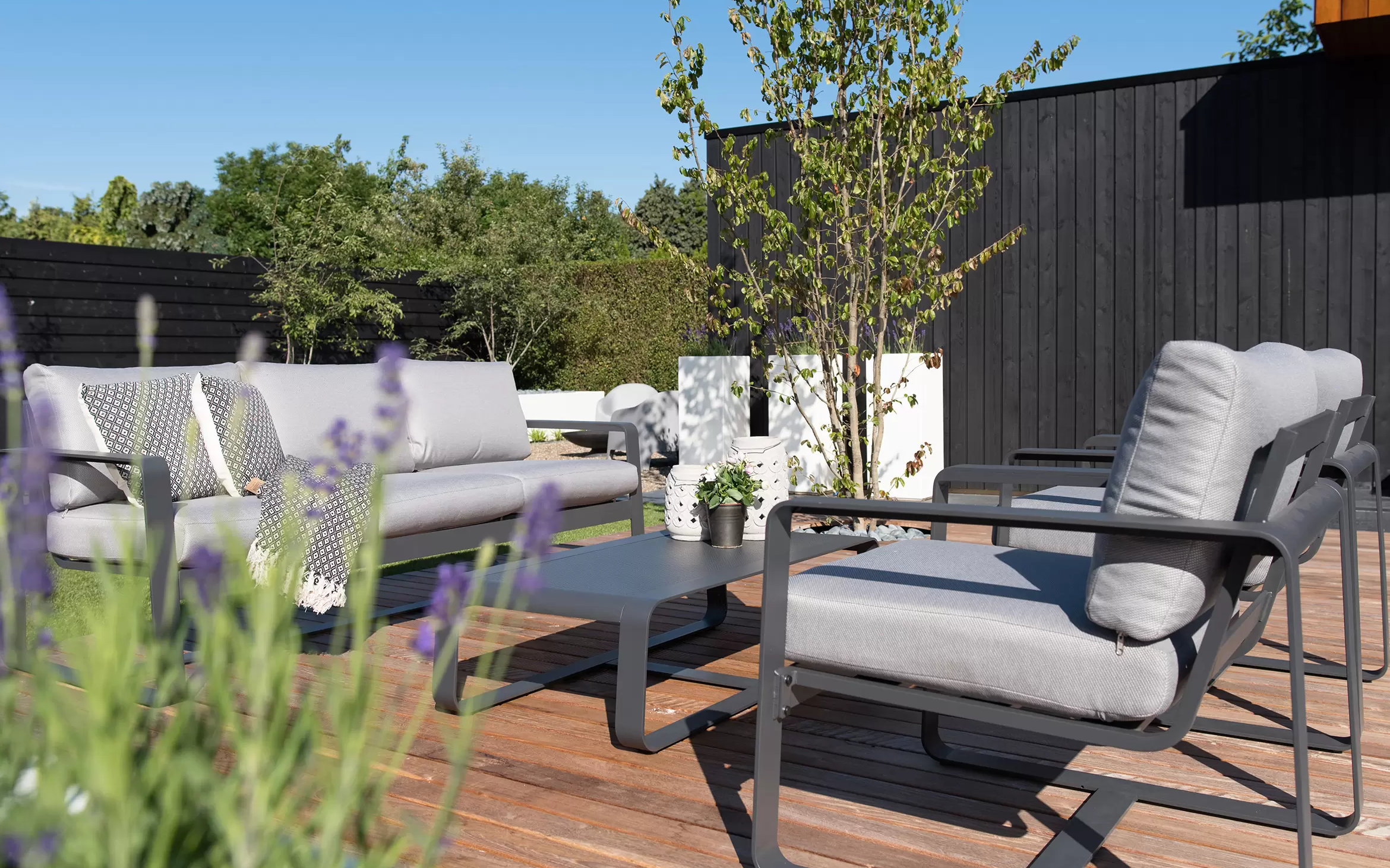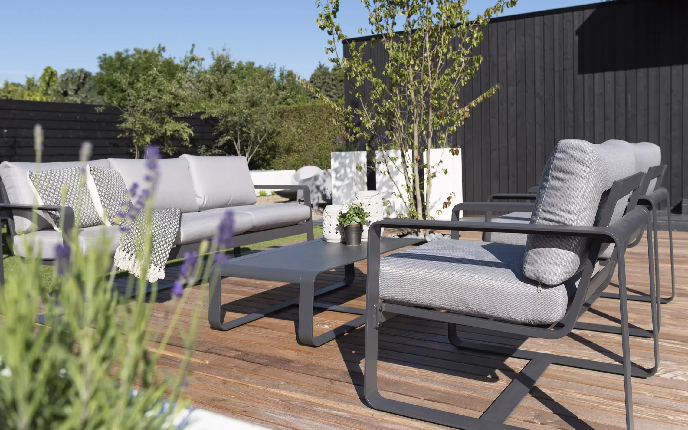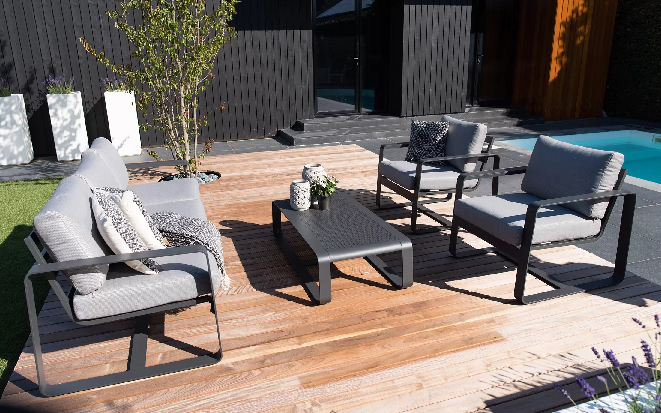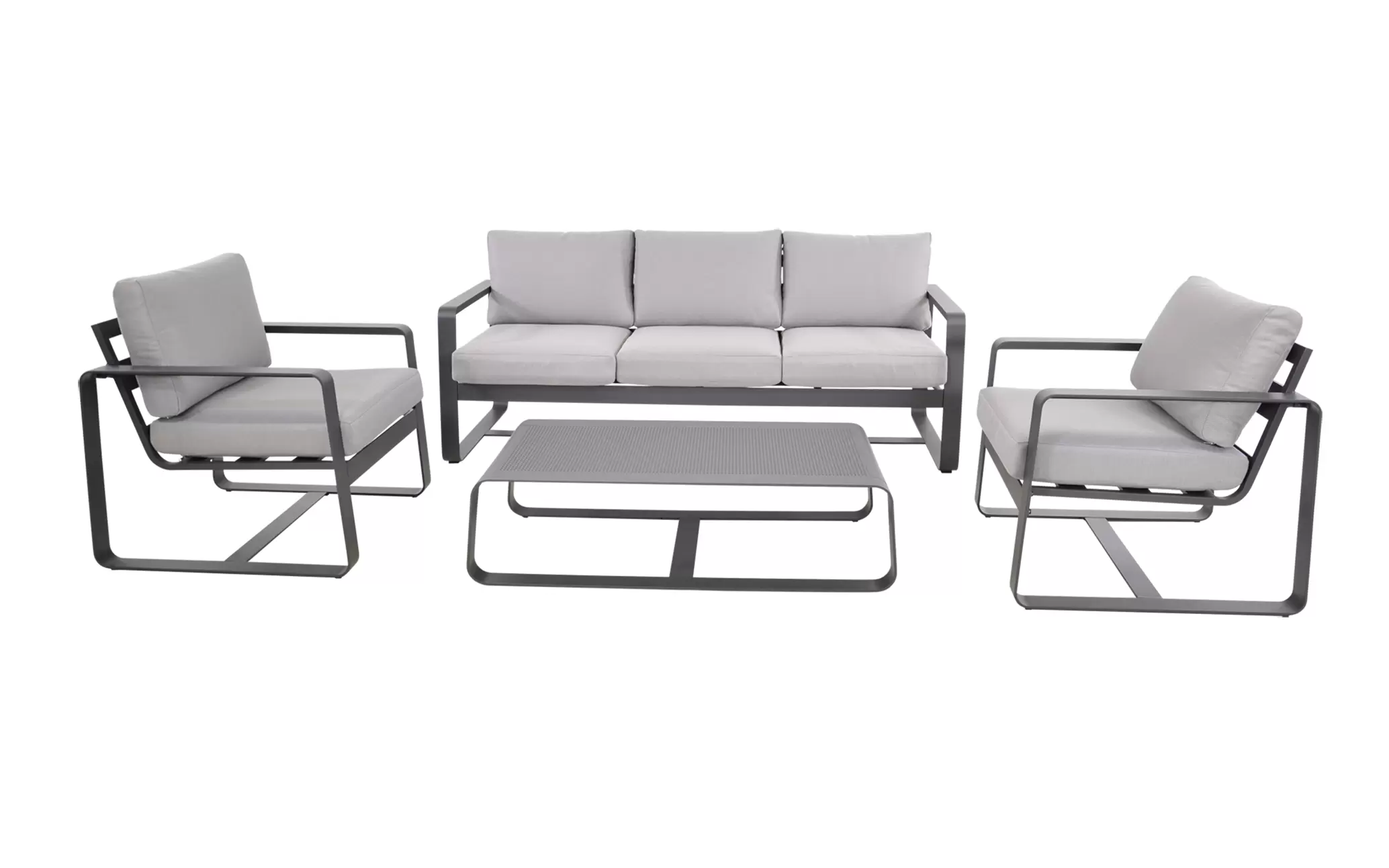 Solidna konstrukcja z aluminium malowanego proszkowo zapewnia trwałość i odporność na zmienne warunki atmosferyczne. Miękkie poduszki wykonane z tkaniny olefin o gramaturze 270 g/m² gwarantują wygodę i pełen komfort wypoczynku. W skład zestawu wchodzi przestronna sofa, dwa fotele oraz praktyczny stolik kawowy z aluminiowym blatem.