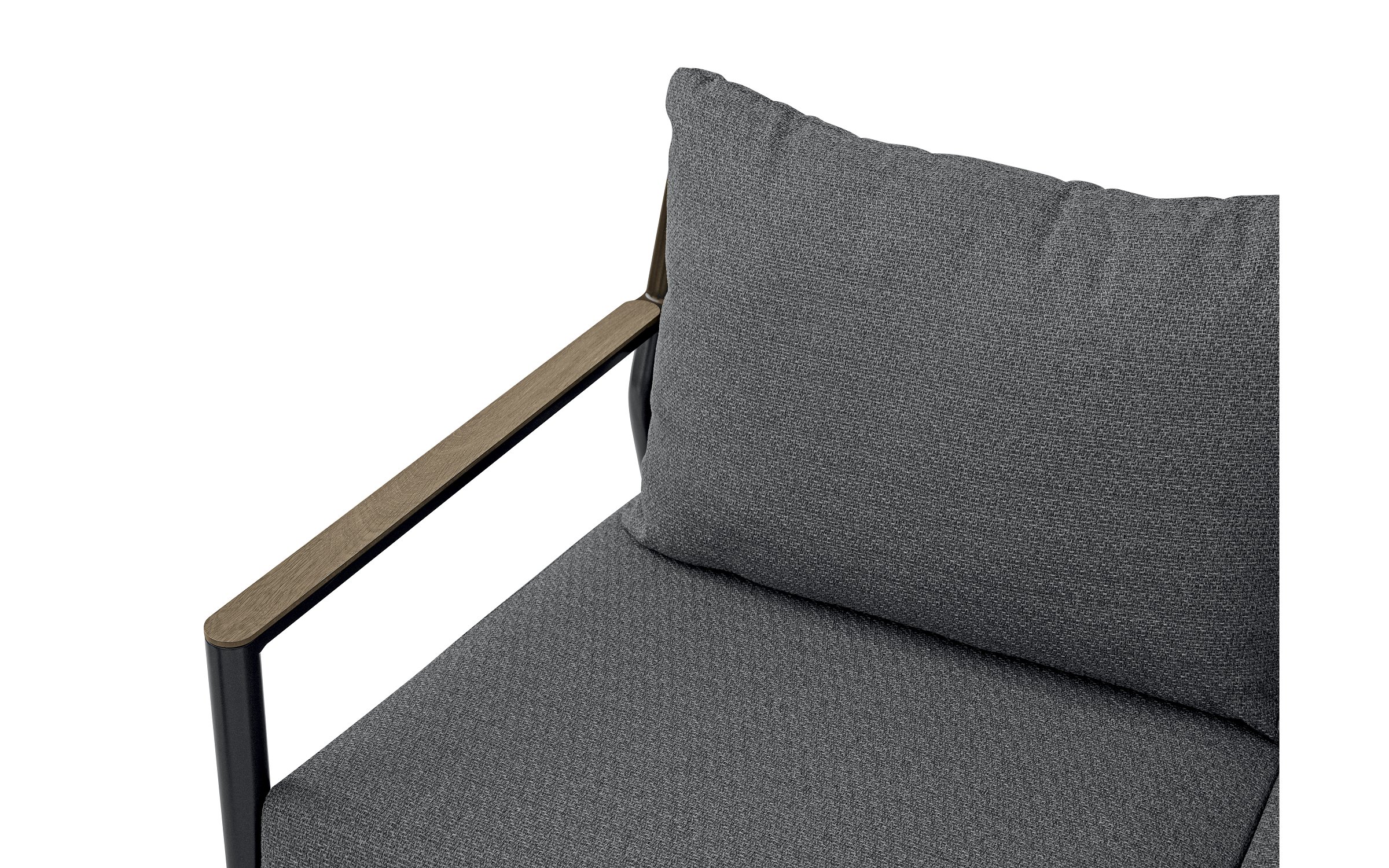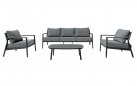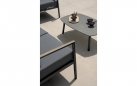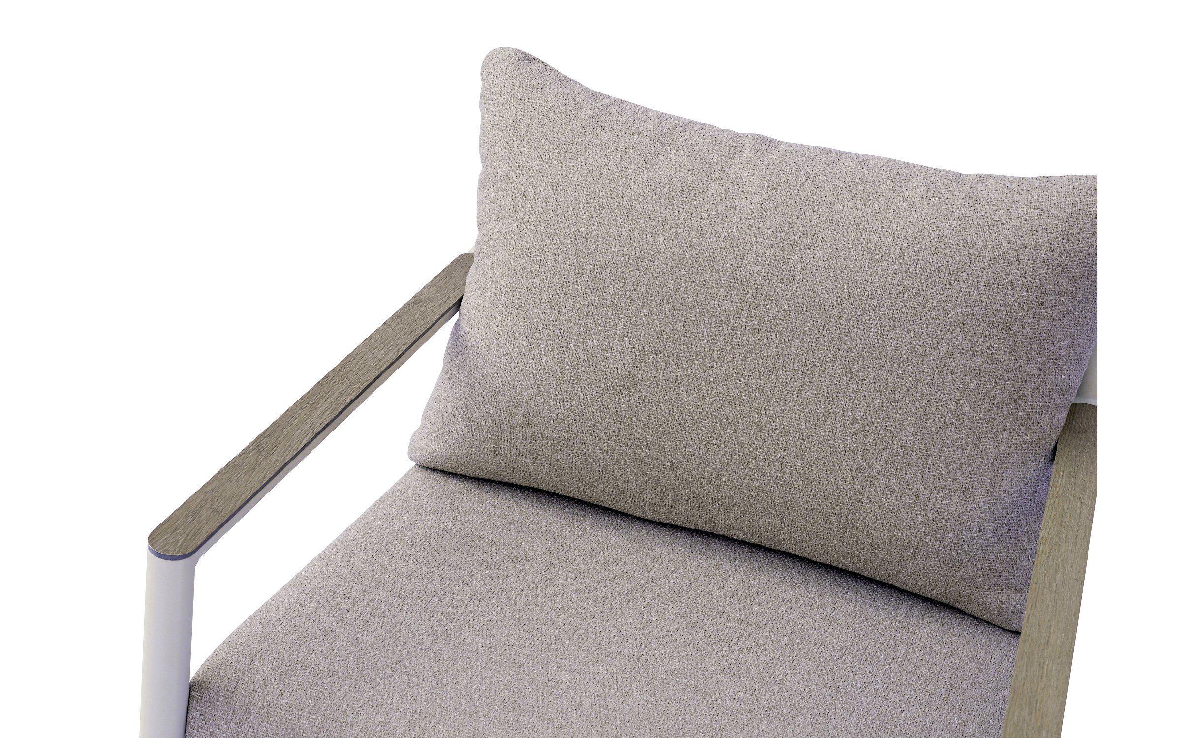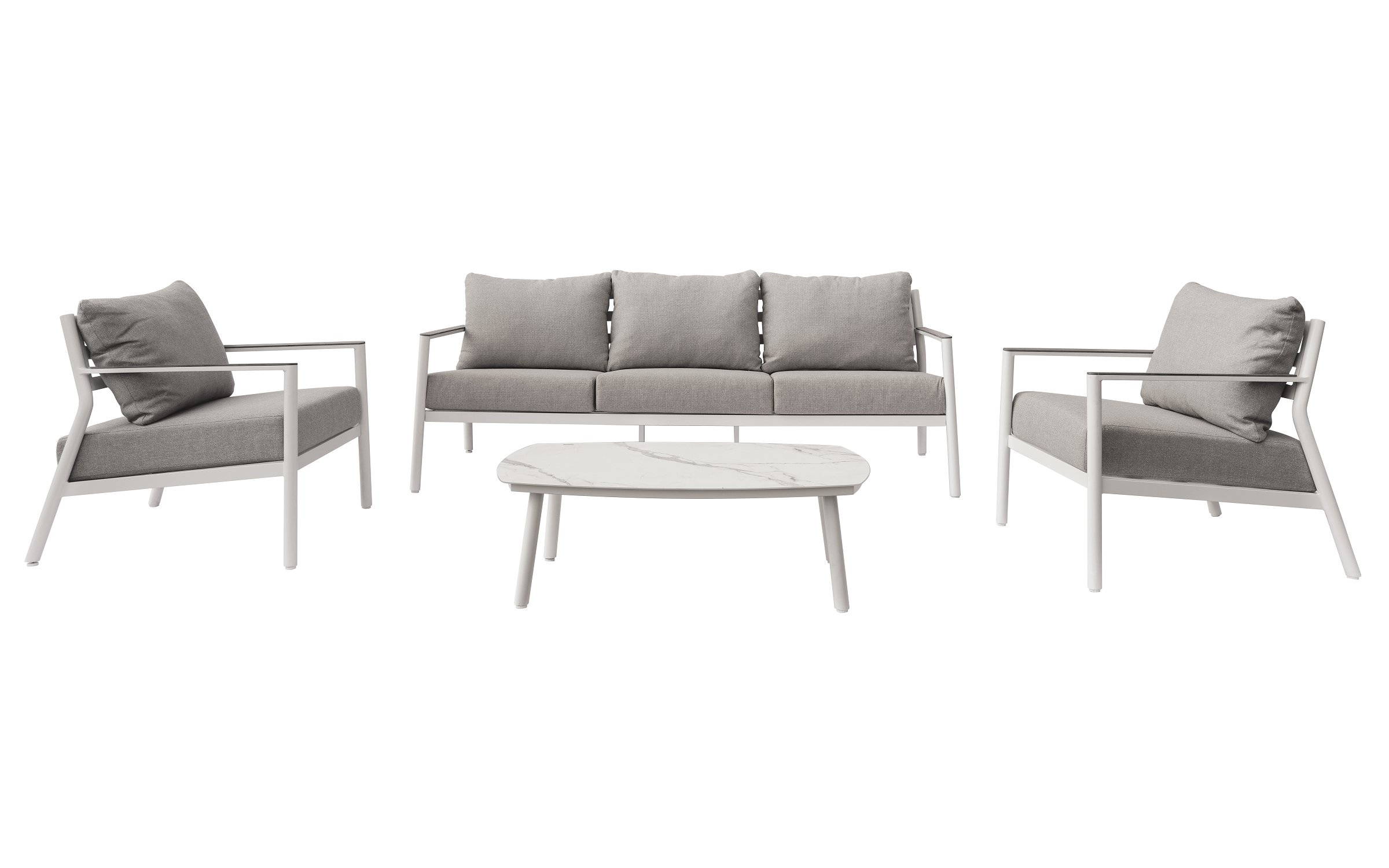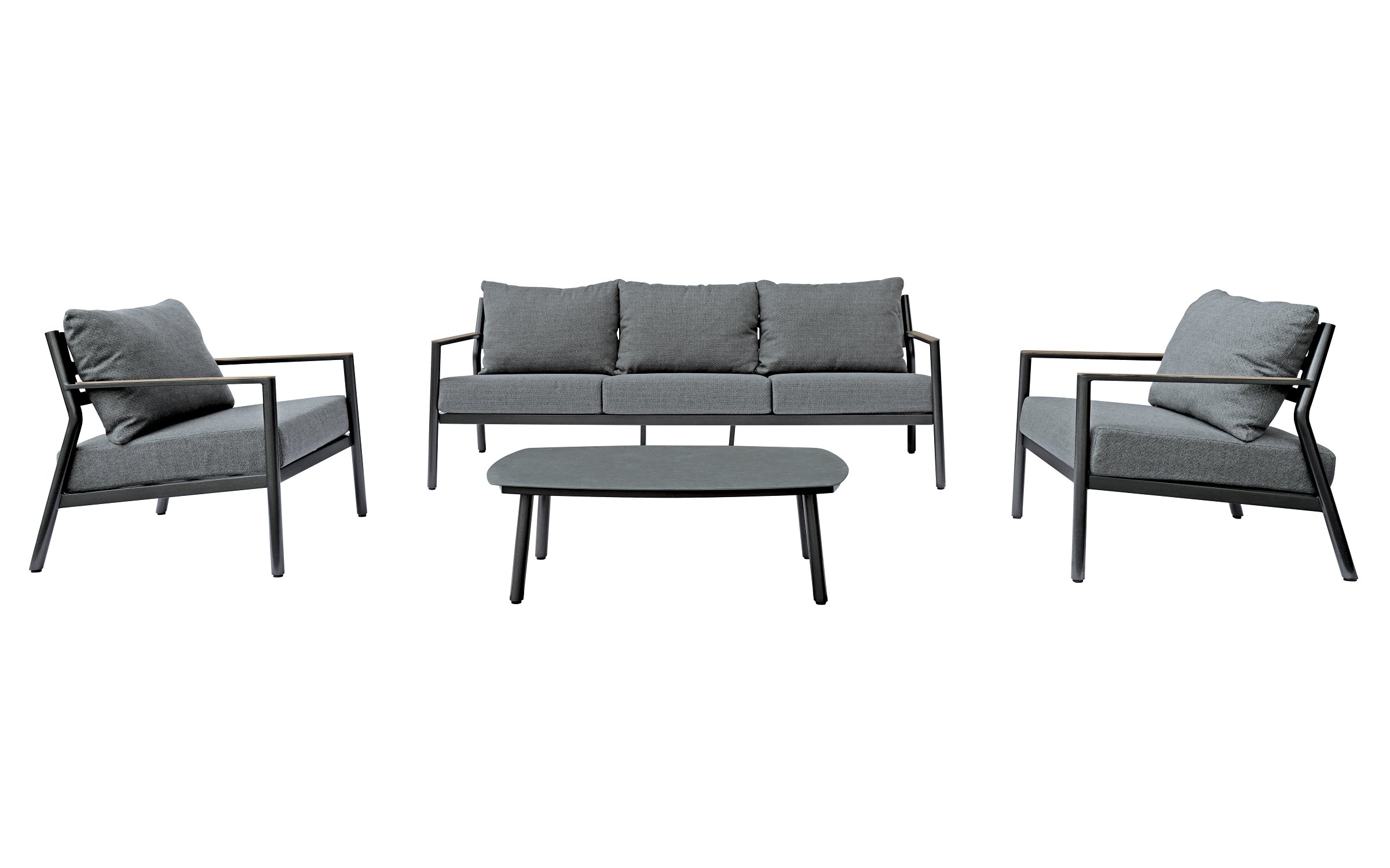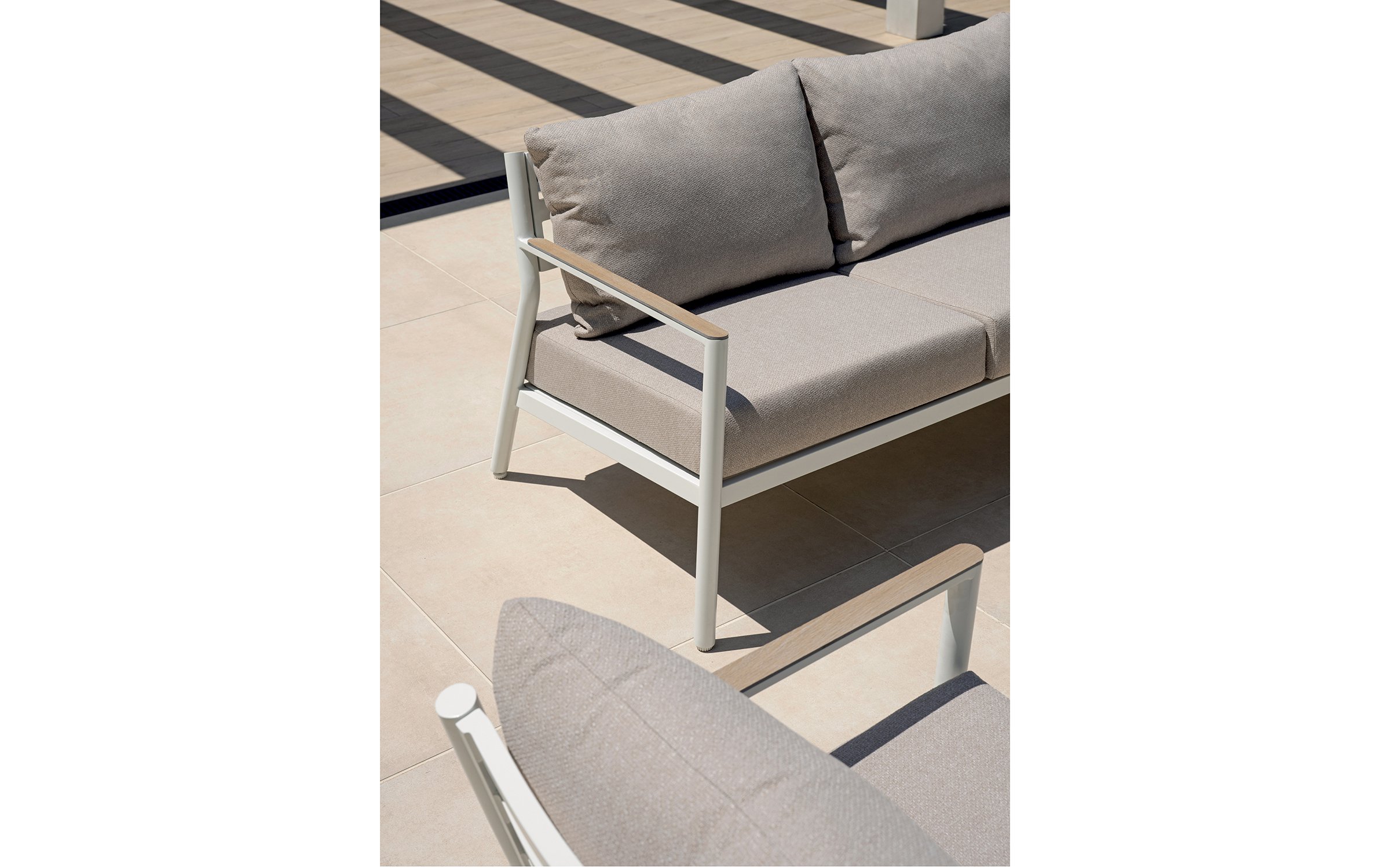 Konstrukcja z aluminium malowanego proszkowo. Podłokietniki z wykończeniem o efekcie drewna. Blat stolika z ceramiki na szkle o efekcie marmuru. Poduszki zdejmowane w kolorze ciemnoszarym lub beżowym.
