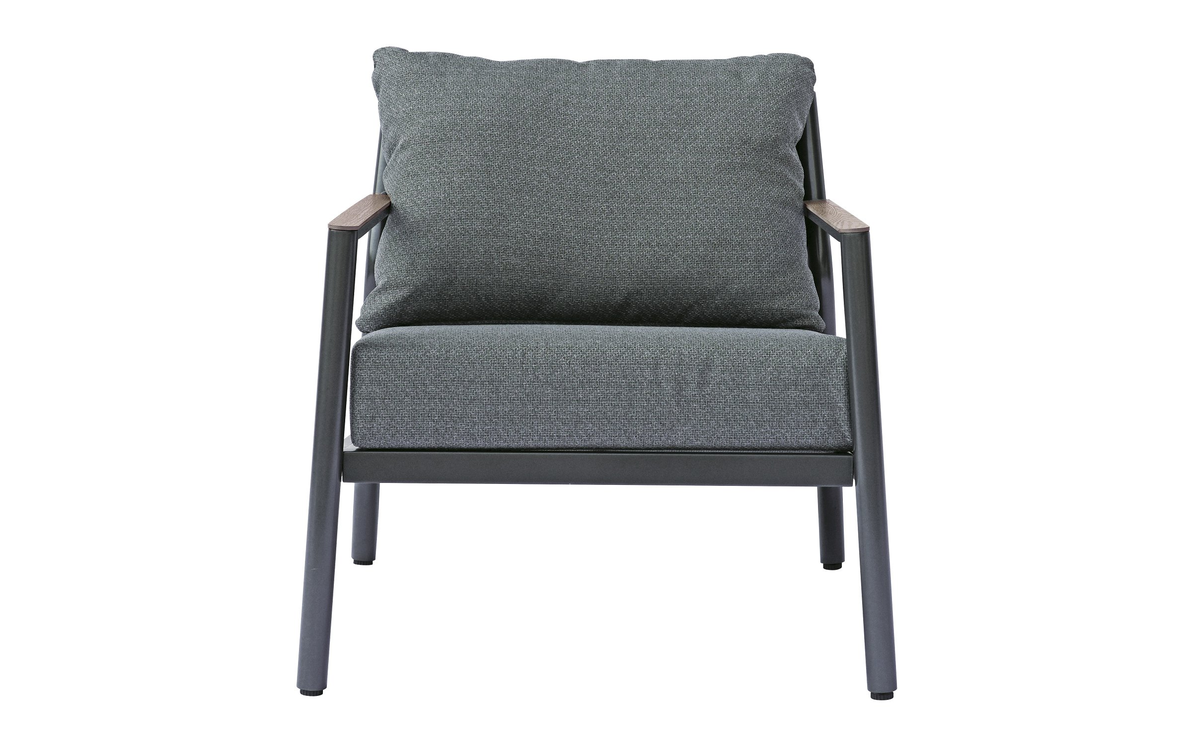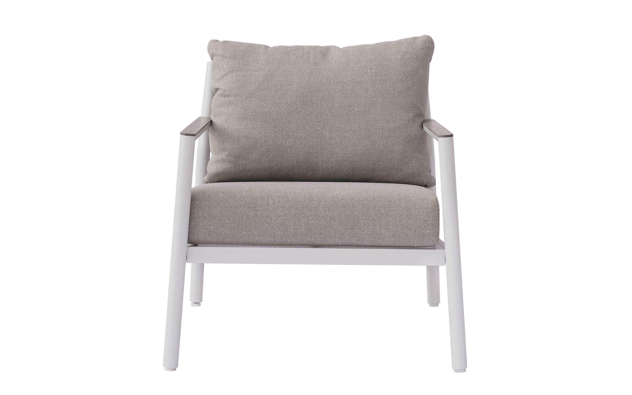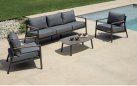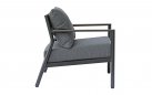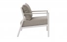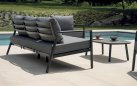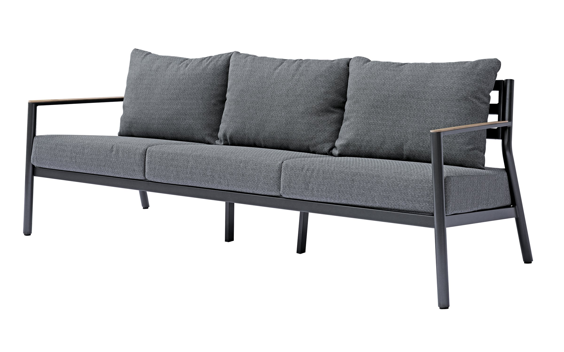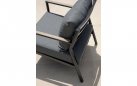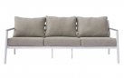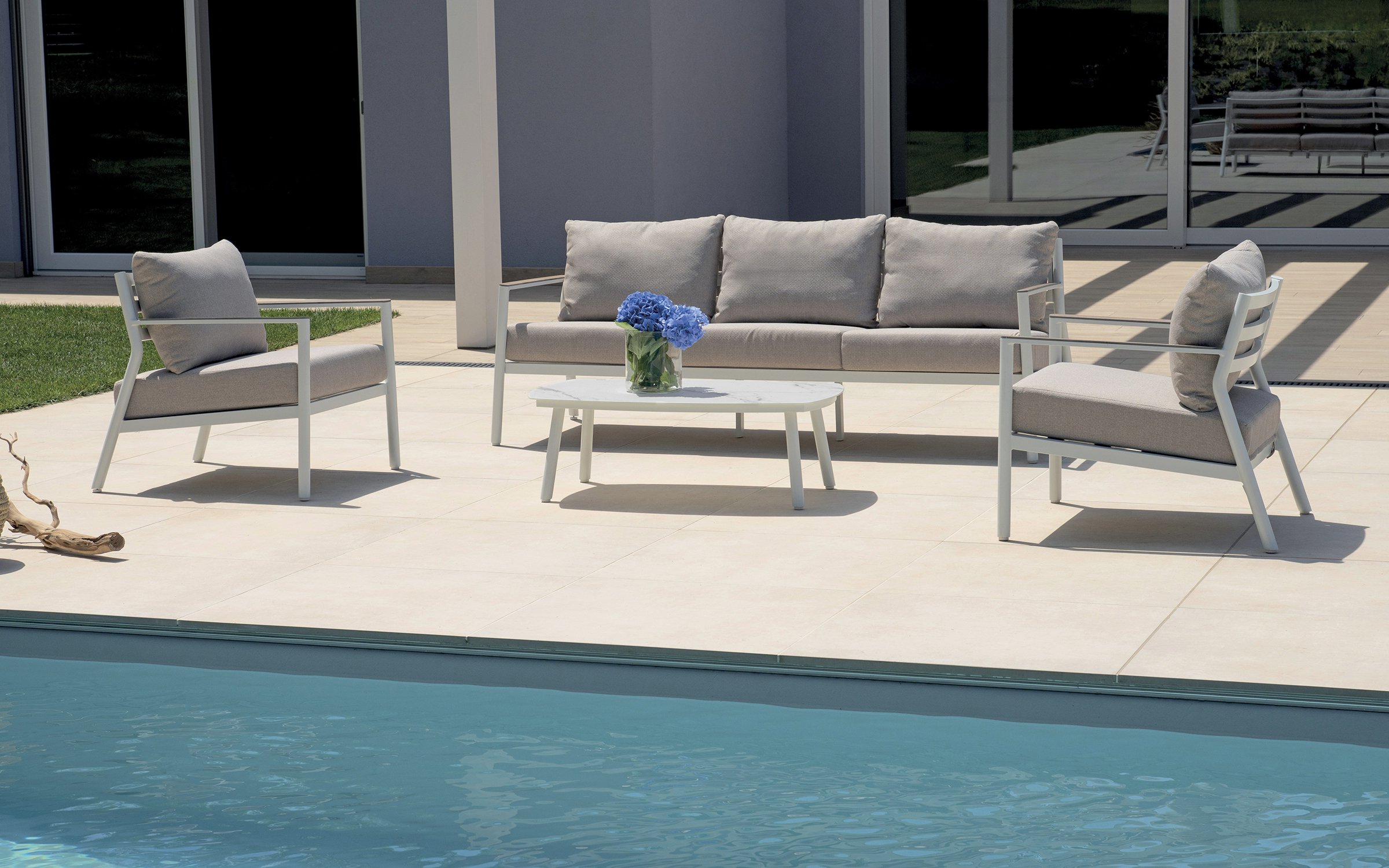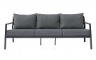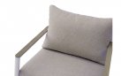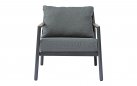 Konstrukcja z aluminium malowanego proszkowo. Podłokietniki z wykończeniem o efekcie drewna. Blat stolika z ceramiki na szkle o efekcie marmuru. Poduszki zdejmowane w kolorze ciemnoszarym lub beżowym.