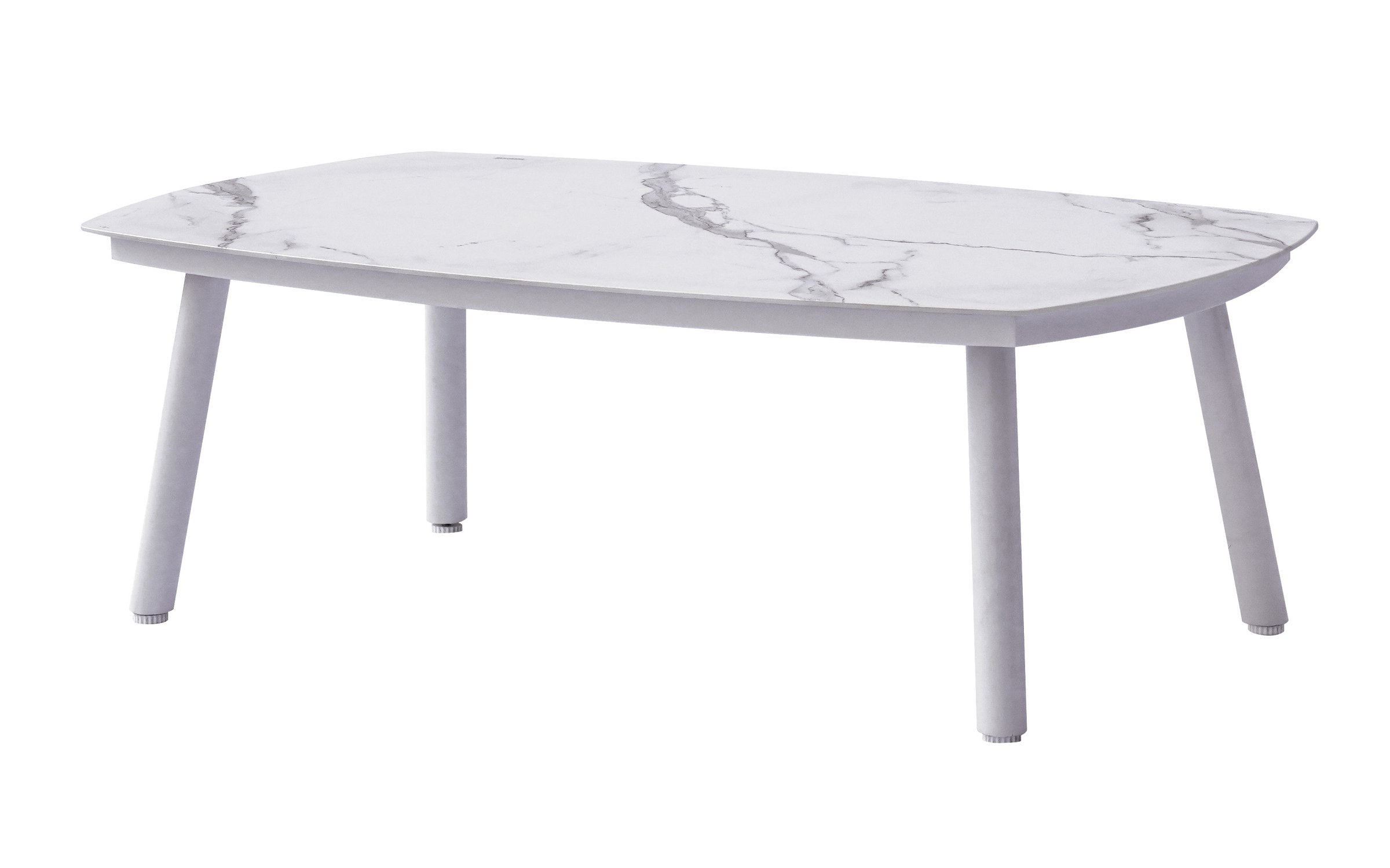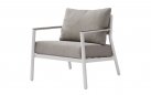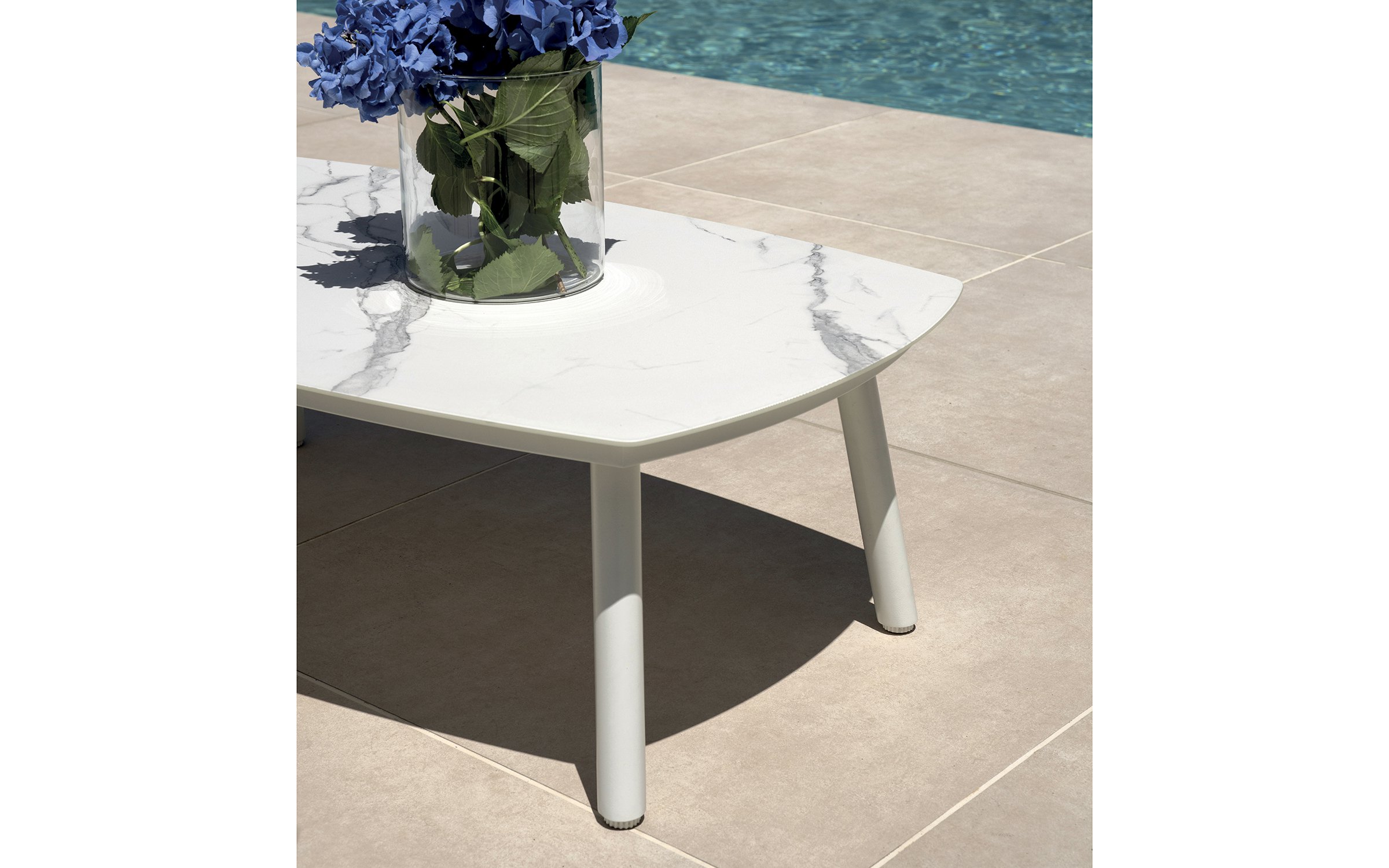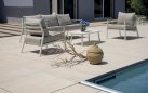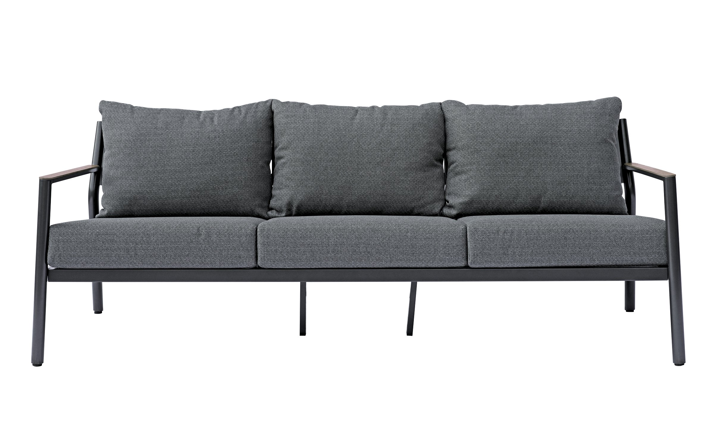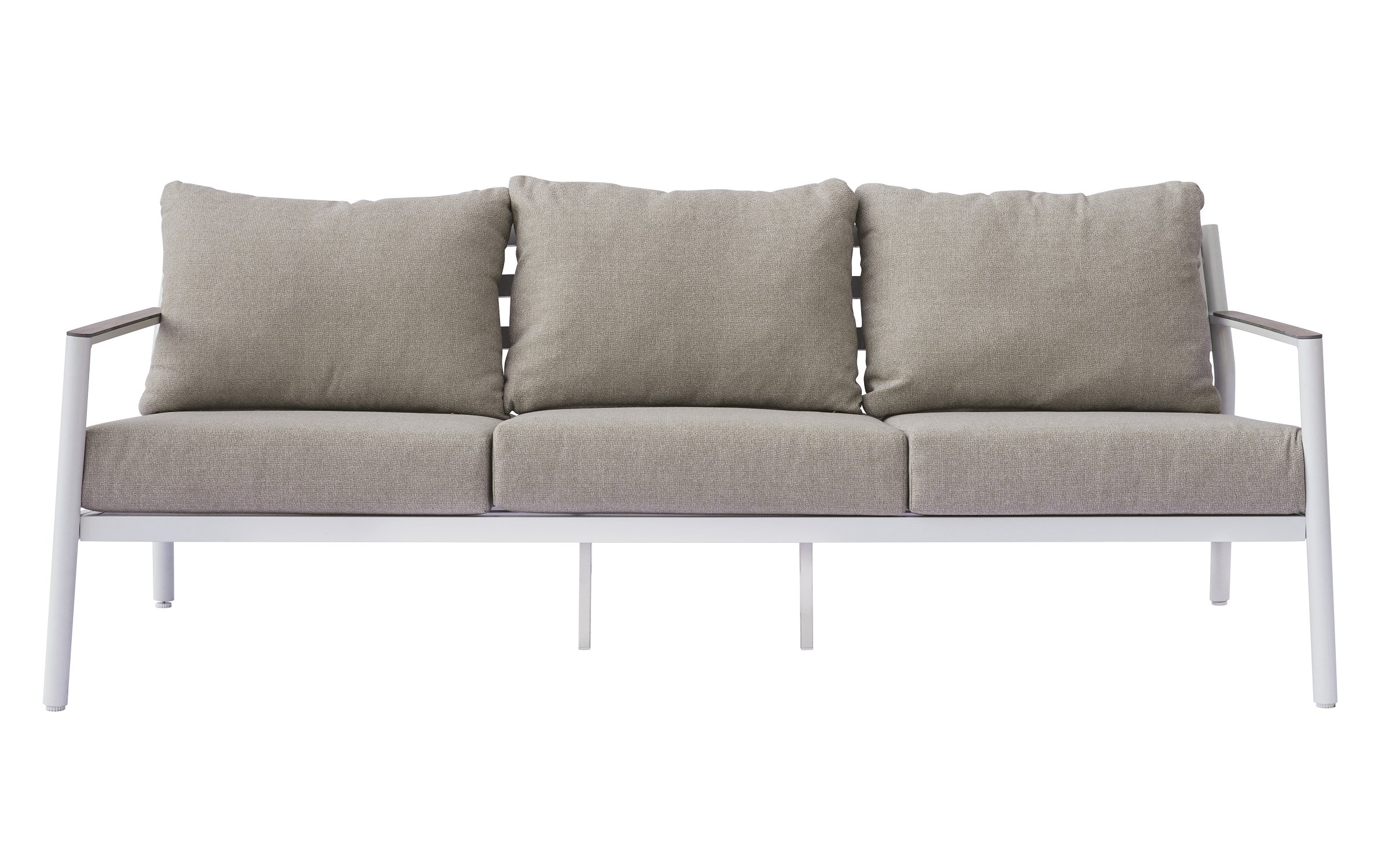 Konstrukcja z aluminium malowanego proszkowo. Podłokietniki z wykończeniem o efekcie drewna. Blat stolika z ceramiki na szkle o efekcie marmuru. Poduszki zdejmowane w kolorze ciemnoszarym lub beżowym.