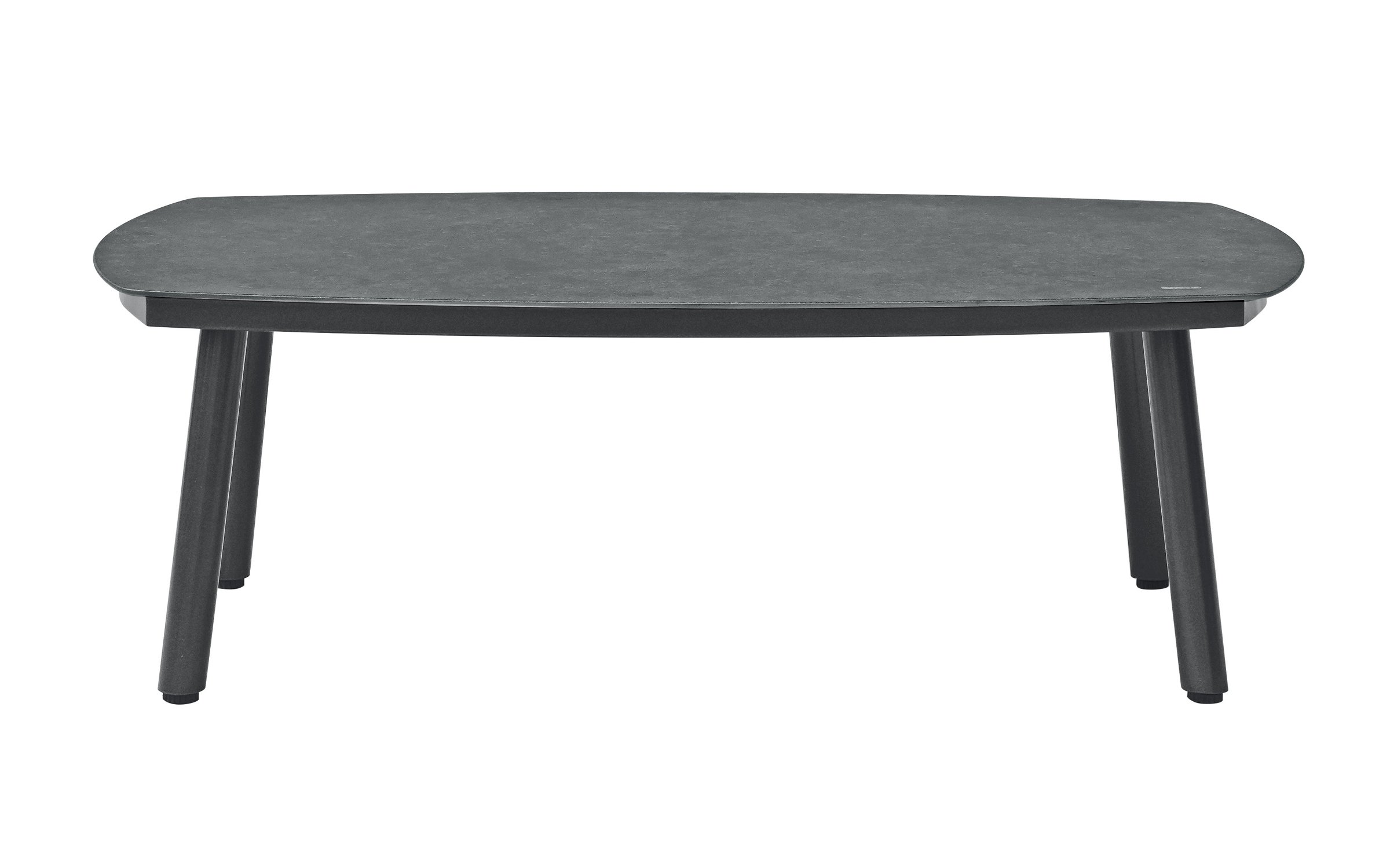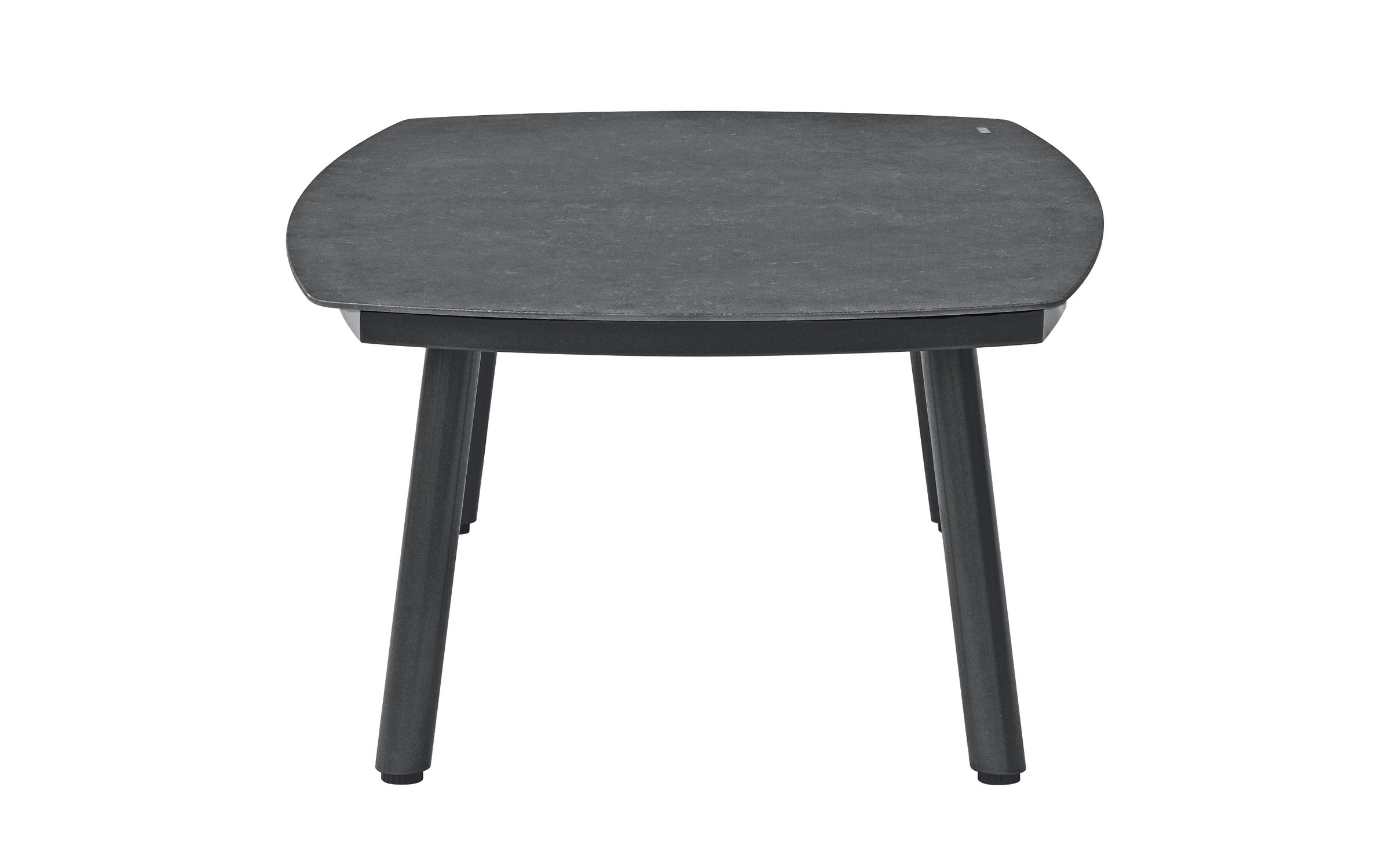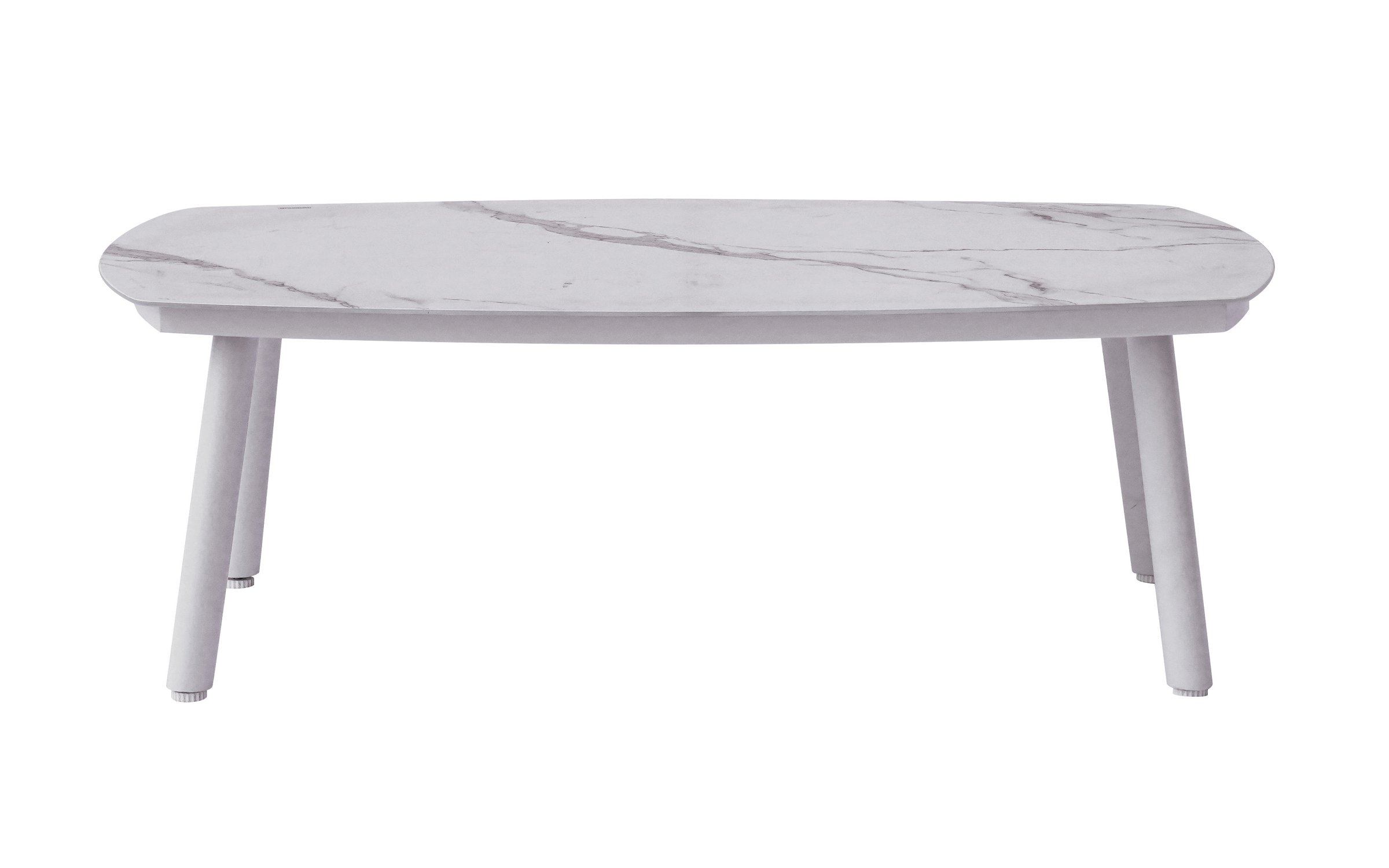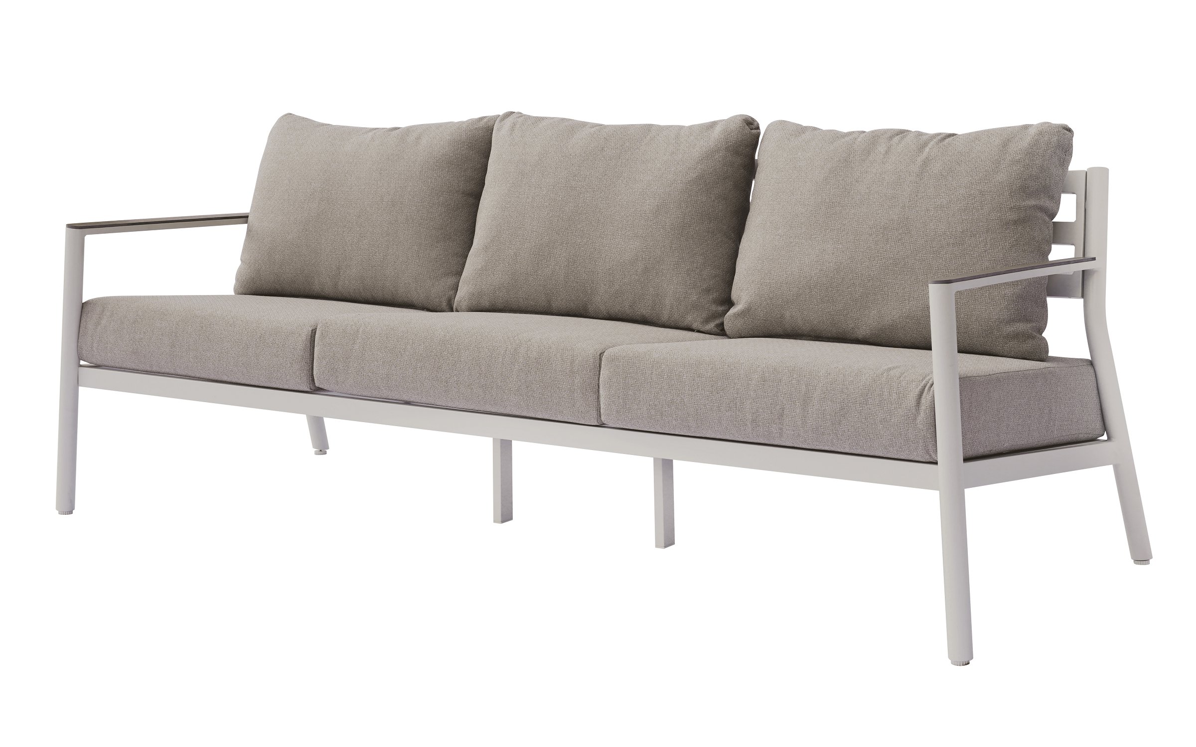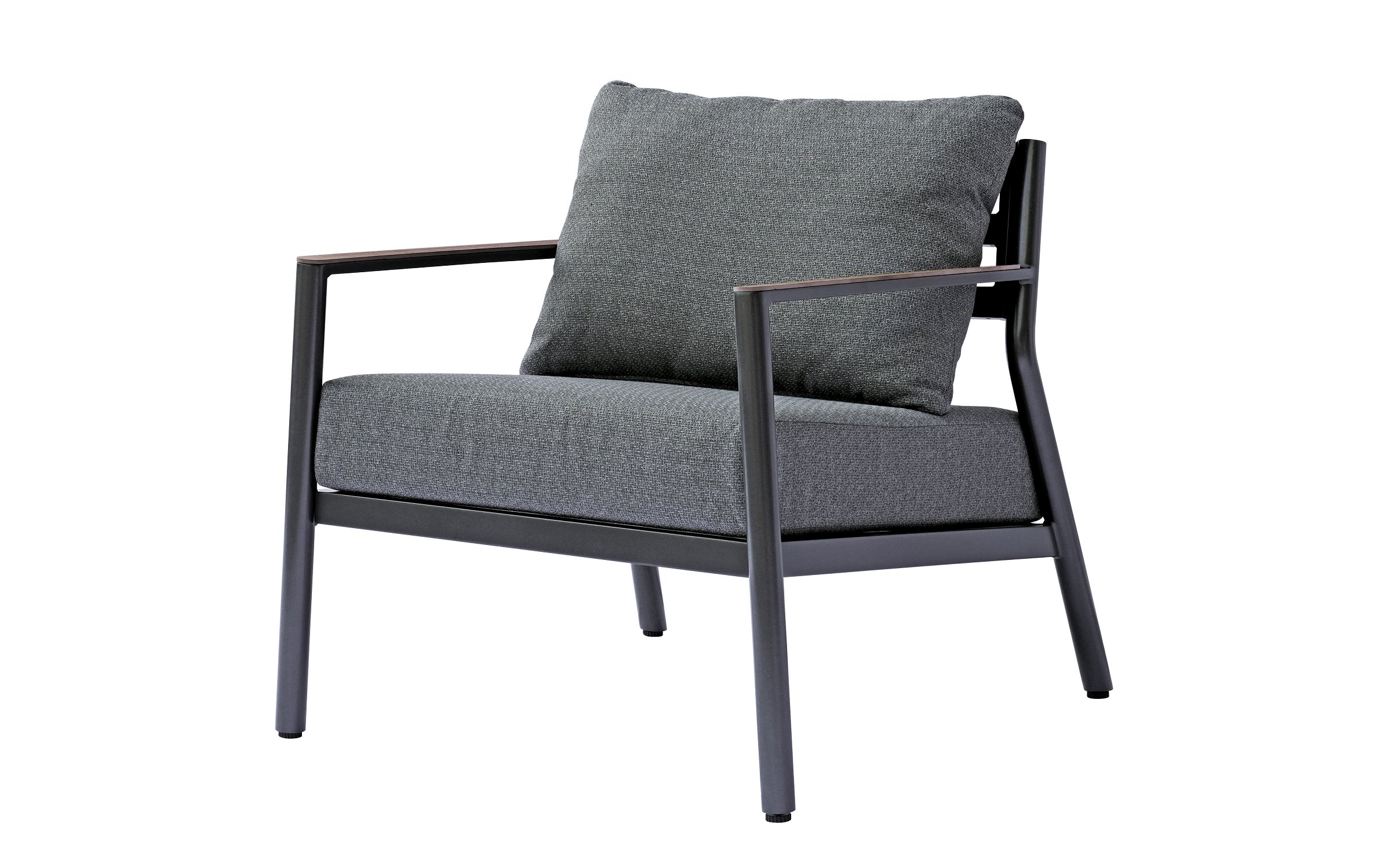 Konstrukcja z aluminium malowanego proszkowo. Podłokietniki z wykończeniem o efekcie drewna. Blat stolika z ceramiki na szkle o efekcie marmuru. Poduszki zdejmowane w kolorze ciemnoszarym lub beżowym.