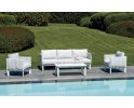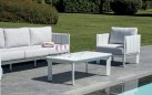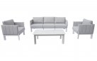 Zestaw wypoczynkowy CANNES to elegancka propozycja do aranżacji przestrzeni ogrodowej, tarasu lub balkonu. Wykonany z aluminiowej konstrukcji malowanej proszkowo w kolorze białym, z bocznymi panelami z jasnoszarej tkaniny odpornej na warunki atmosferyczne. Stolik kawowy posiada blat ze szkła hartowanego o efekcie marmuru – trwały i estetyczny.