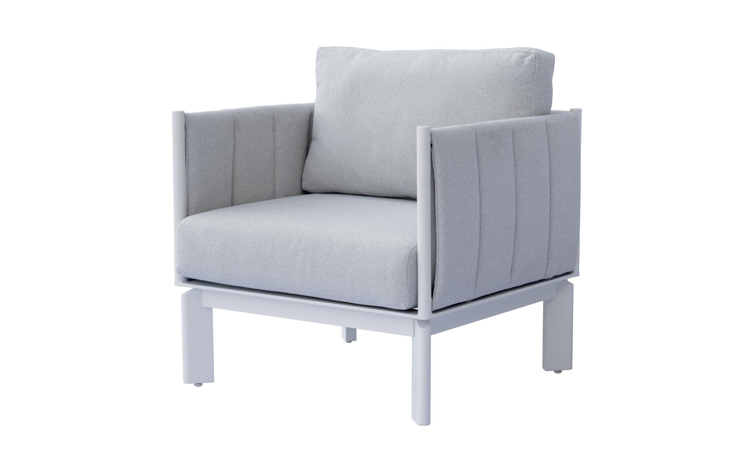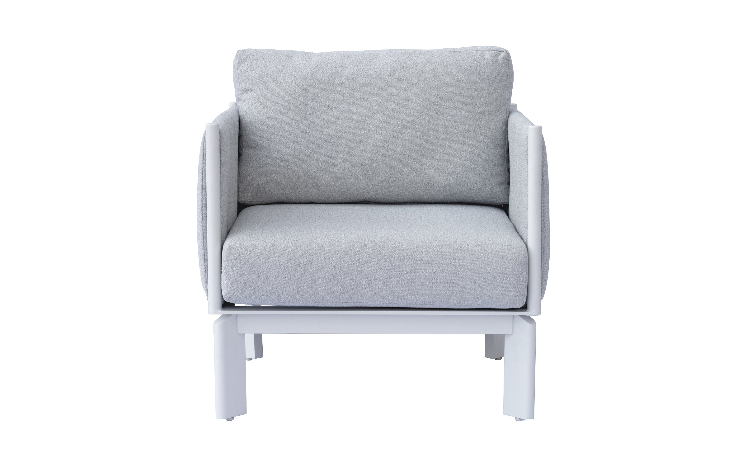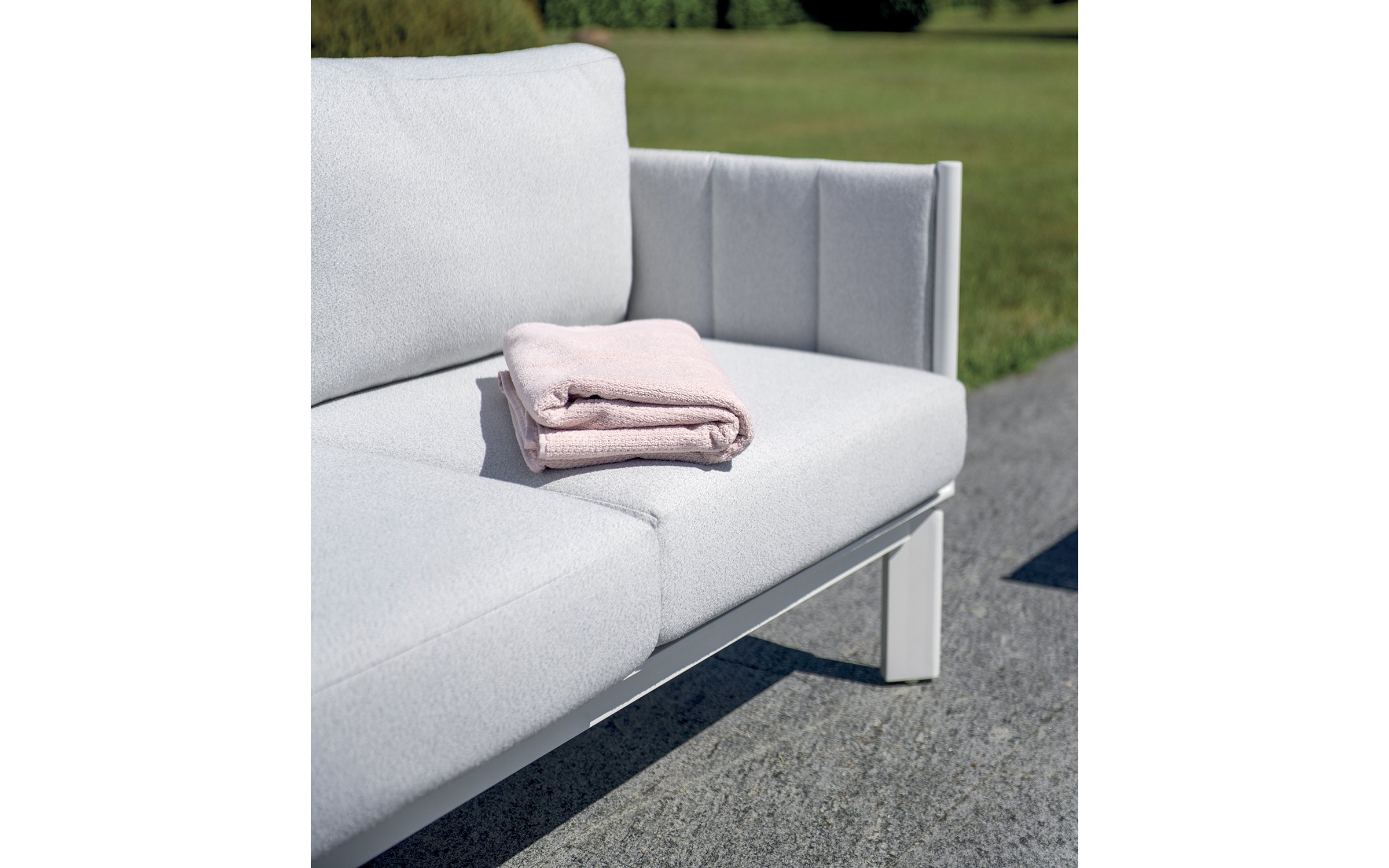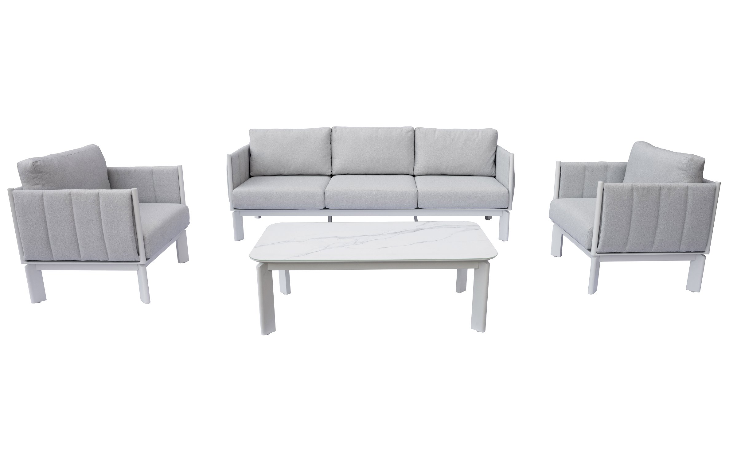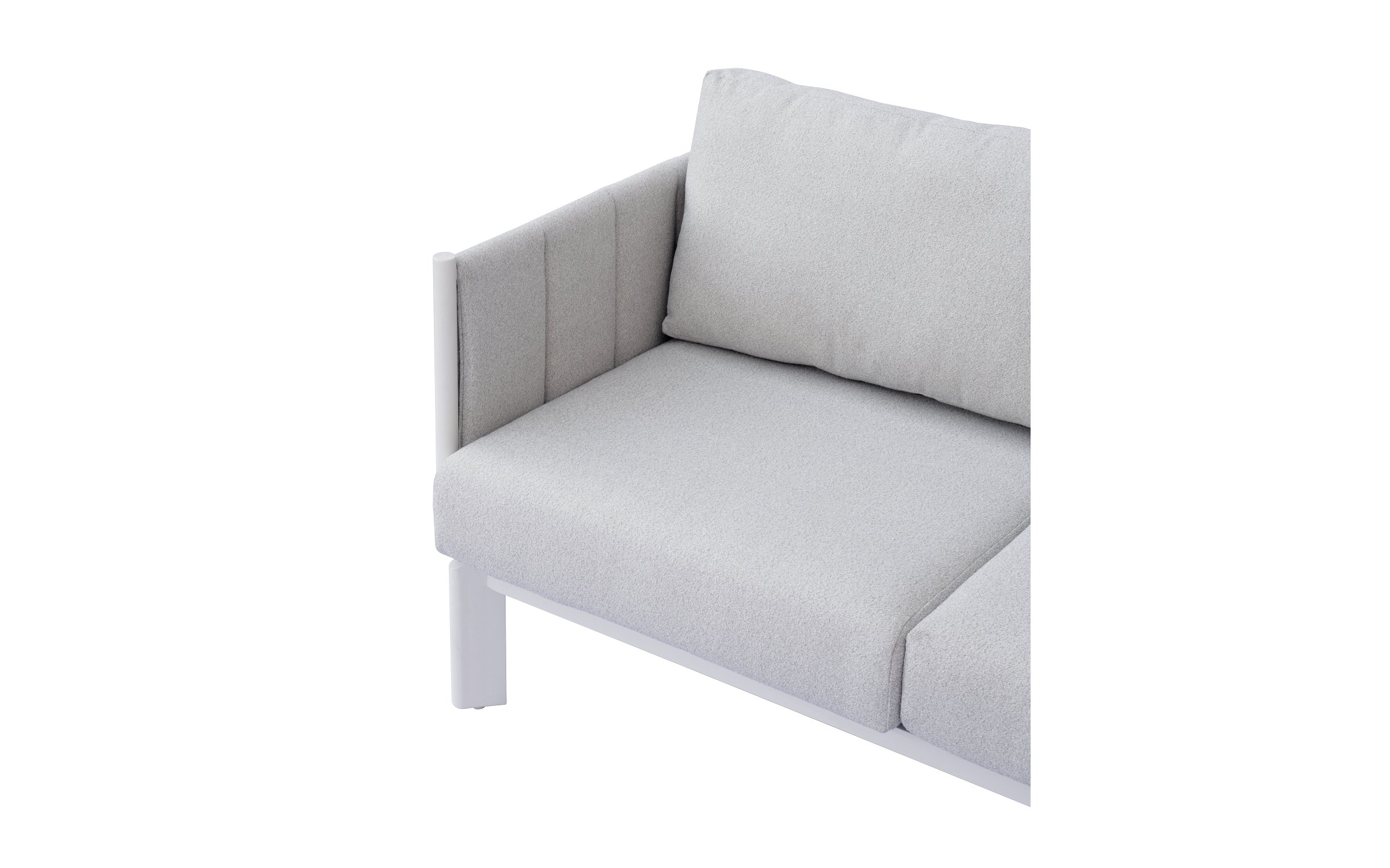 Konstrukcja z aluminium malowanego proszkowo w kolorze białym. Boki siedzisk wykończone tkaniną w kolorze jasnoszarym. Blat stolika ze szkła hartowanego o efekcie marmuru. Poduszki zdejmowane z tkaniny odpornej na warunki atmosferyczne.