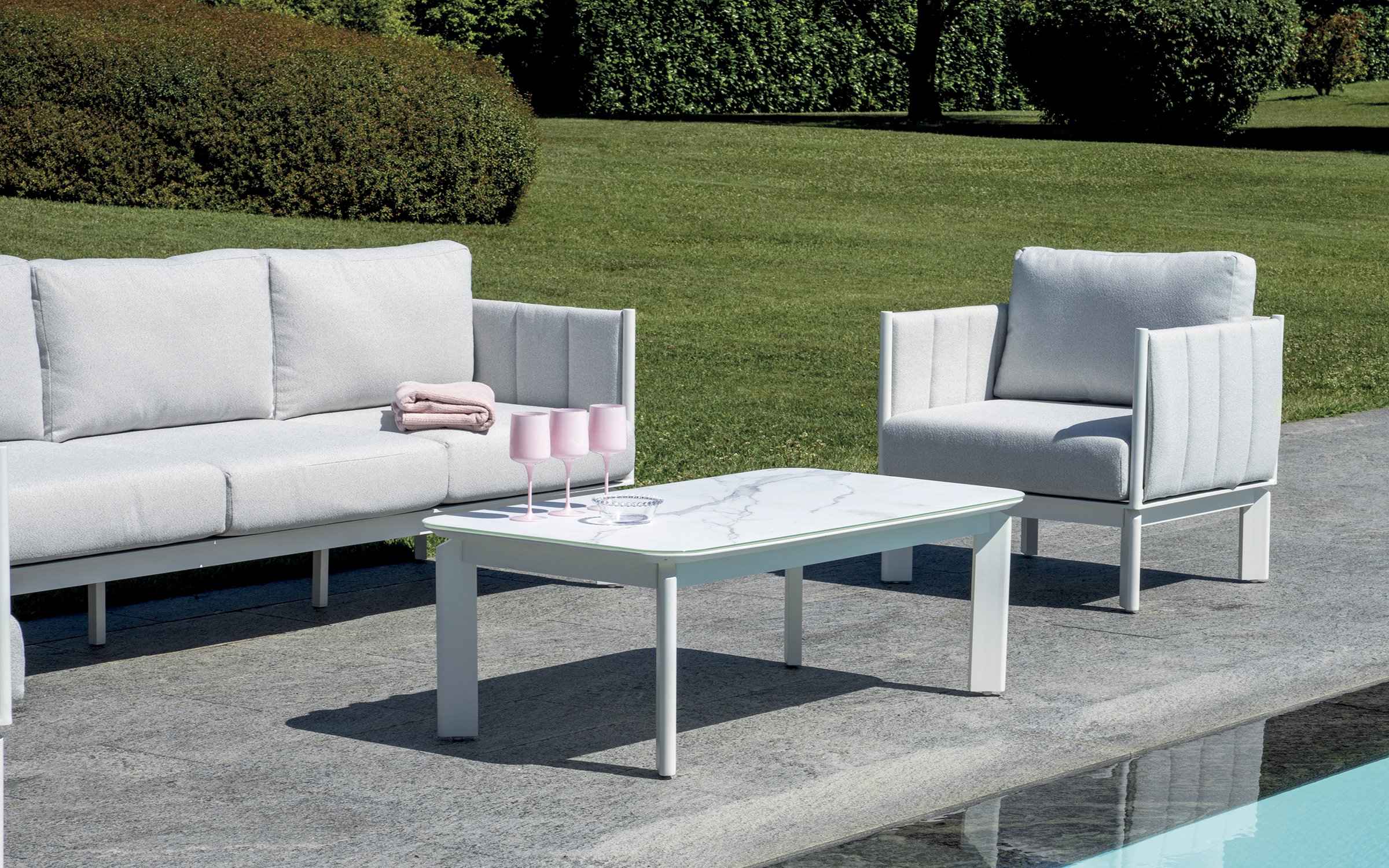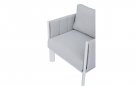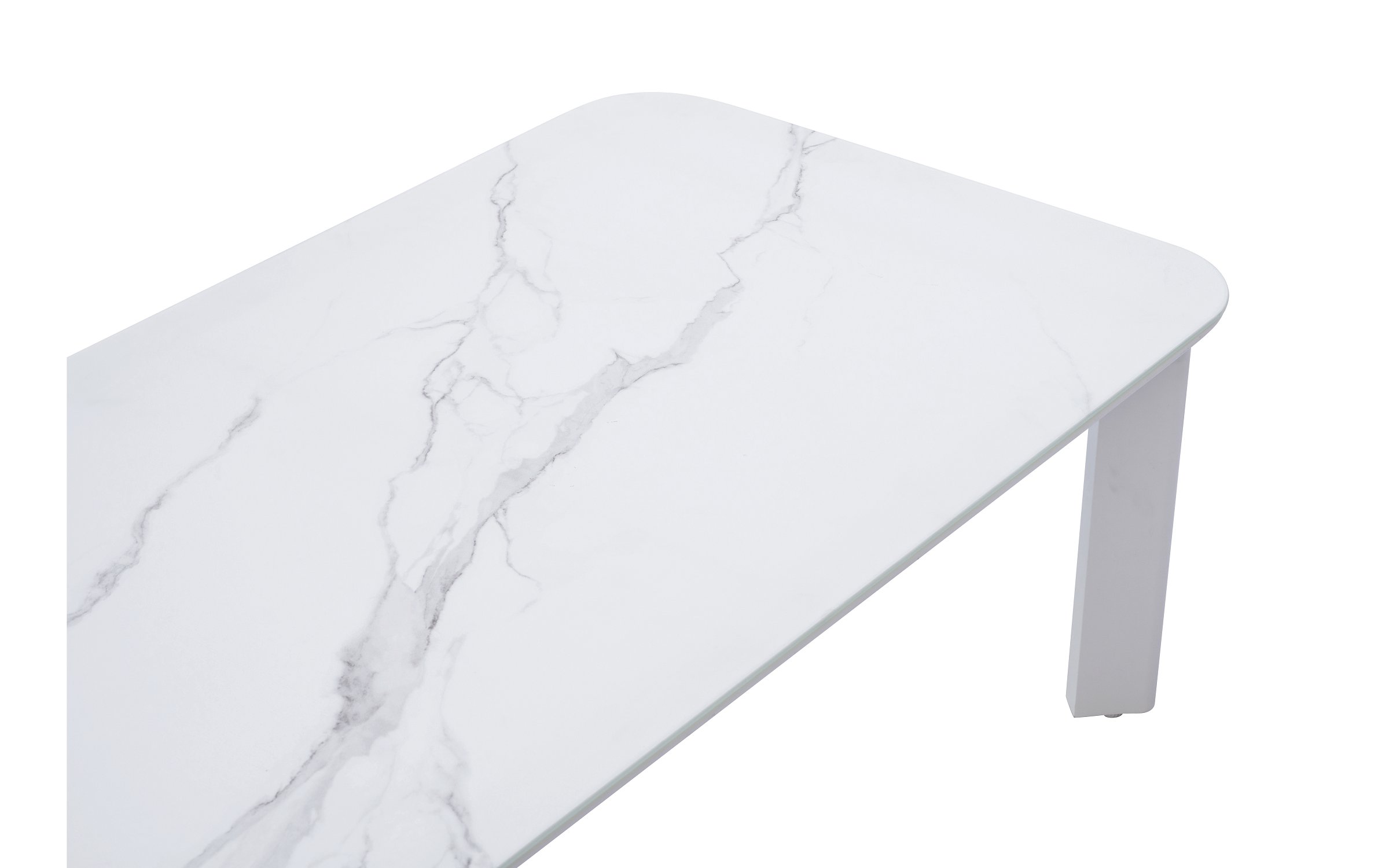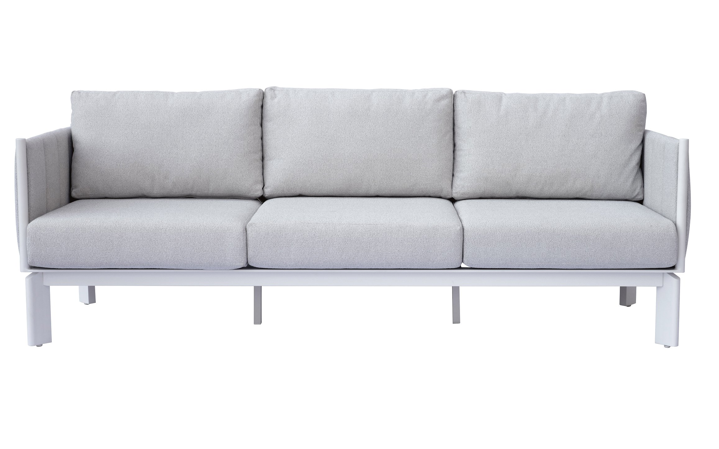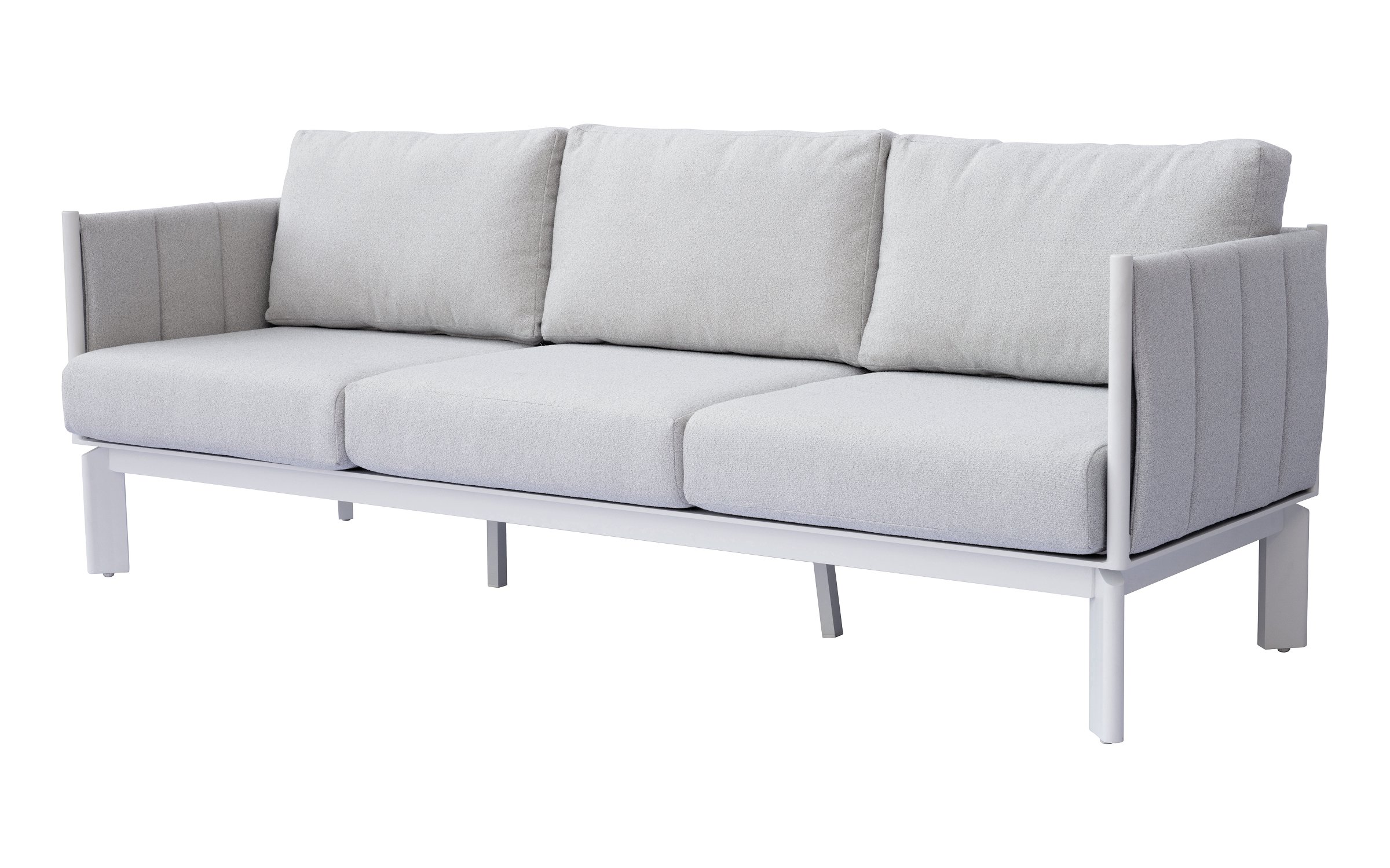 Konstrukcja z aluminium malowanego proszkowo w kolorze białym. Boki siedzisk wykończone tkaniną w kolorze jasnoszarym. Blat stolika ze szkła hartowanego o efekcie marmuru. Poduszki zdejmowane z tkaniny odpornej na warunki atmosferyczne.