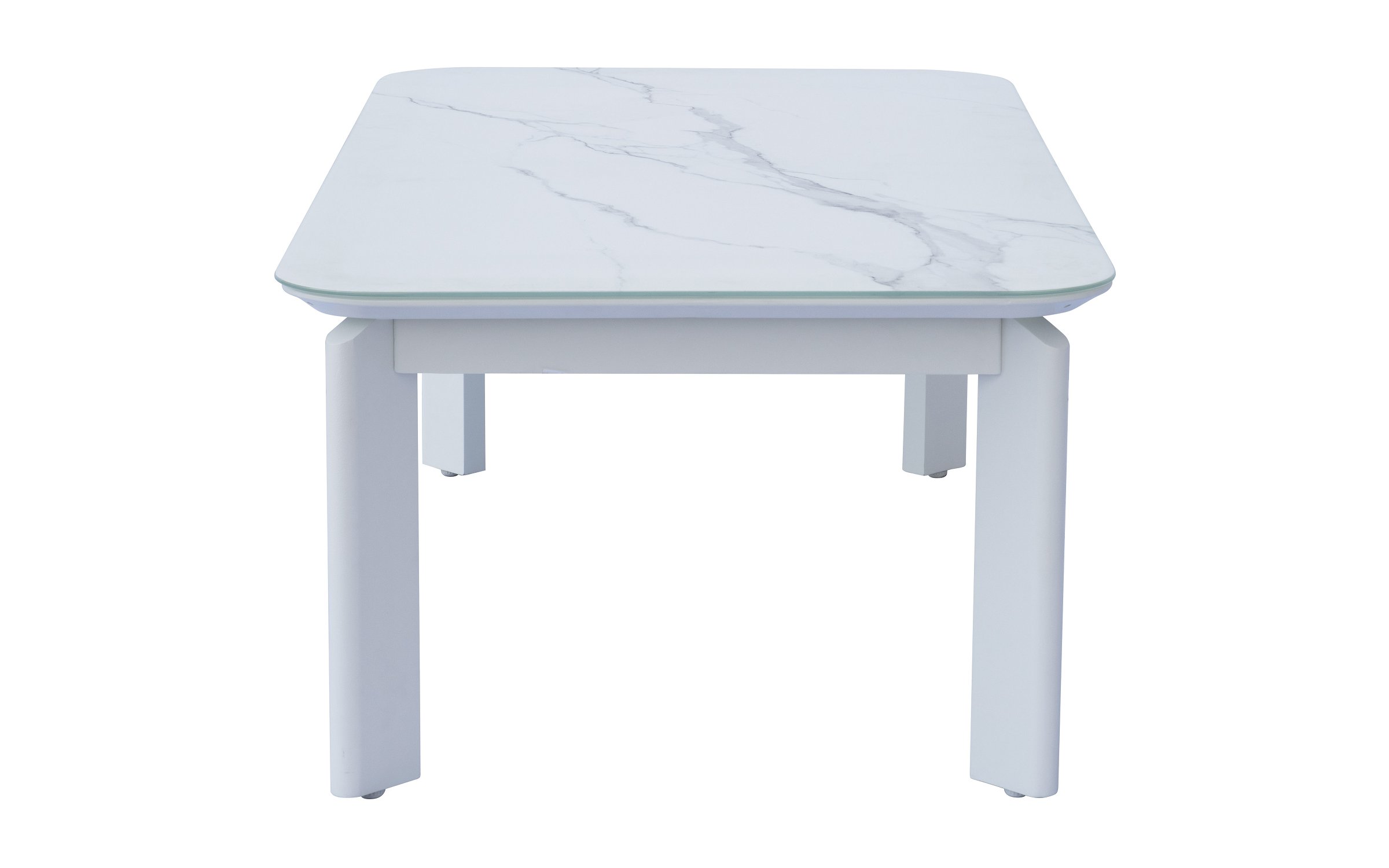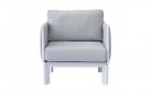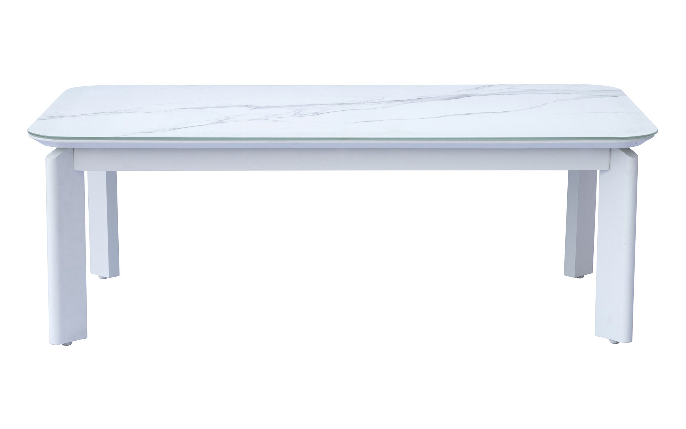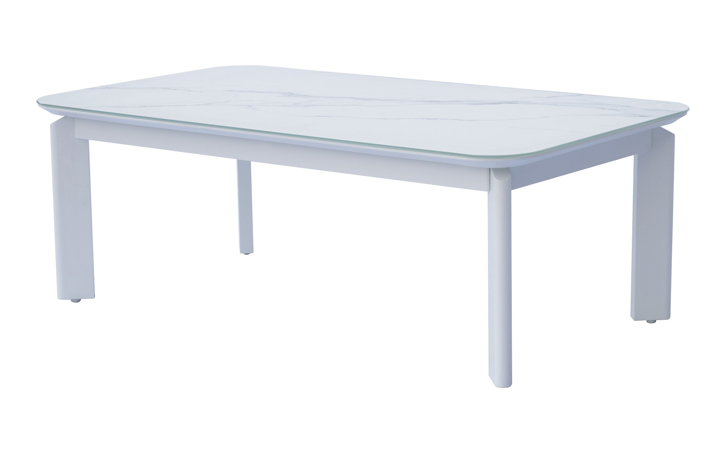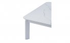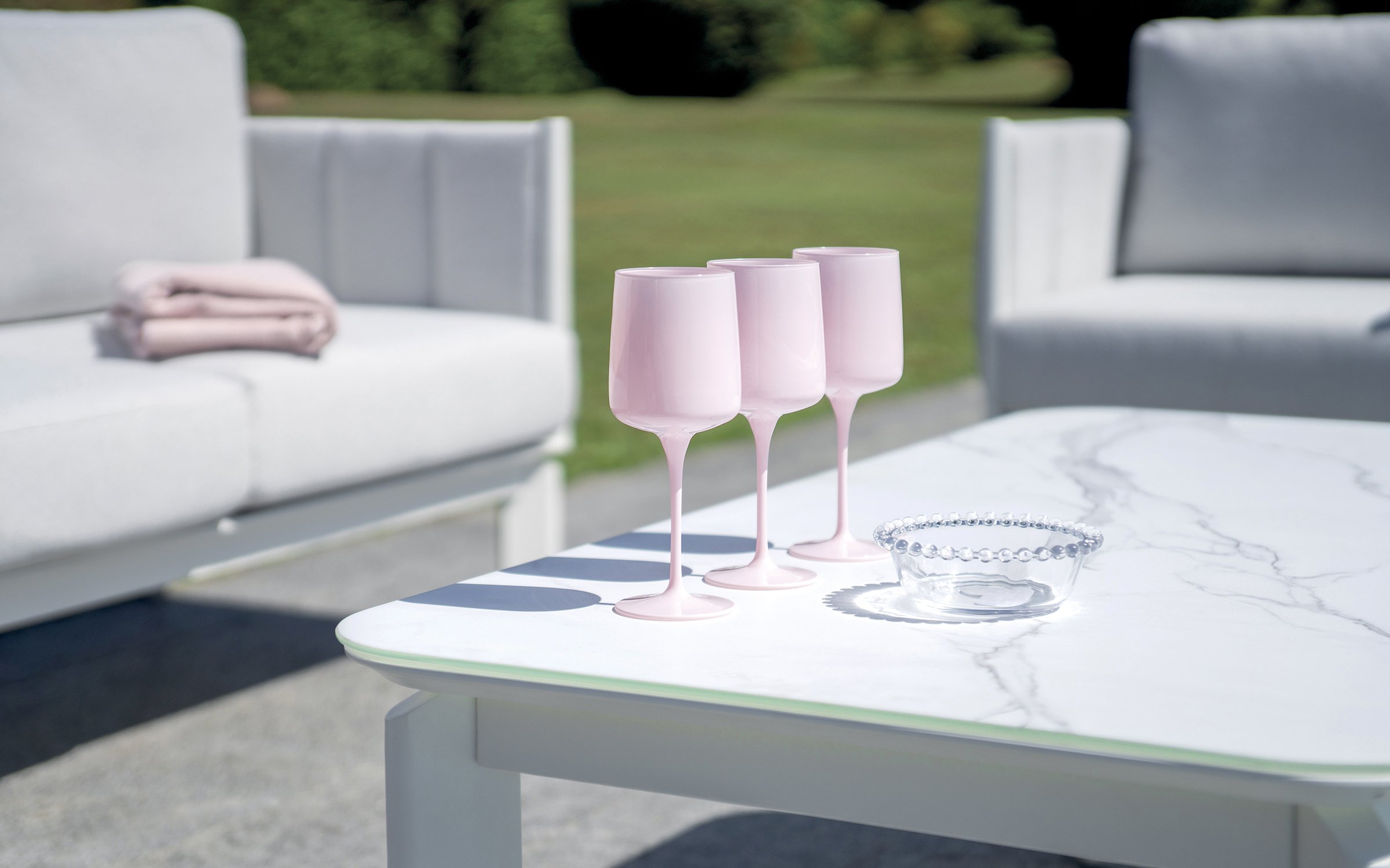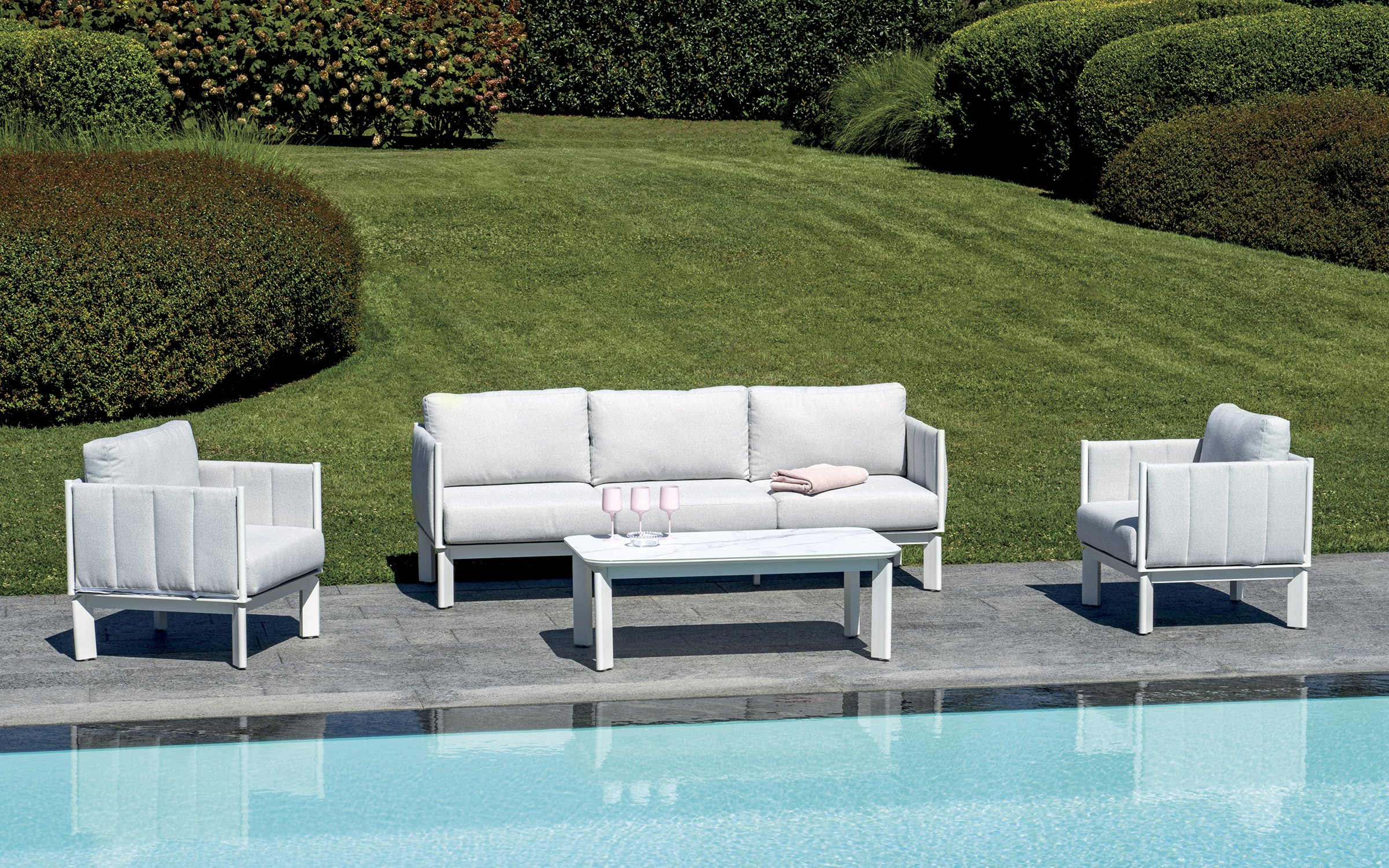 Konstrukcja z aluminium malowanego proszkowo w kolorze białym. Boki siedzisk wykończone tkaniną w kolorze jasnoszarym. Blat stolika ze szkła hartowanego o efekcie marmuru. Poduszki zdejmowane z tkaniny odpornej na warunki atmosferyczne.