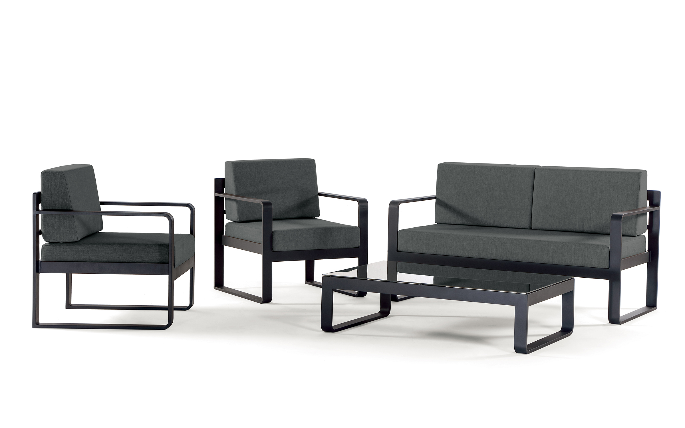 Dwuosobowa sofa ogrodowa i dwa fotele, osadzone na solidnych, aluminiowych ramach w kolorze antracytu, gwarantujących pełną odporność na warunki atmosferyczne i lata użytkowania. Uzupełniają je miękkie poduszki pokryte dopasowaną, ciemnoszarą tkaniną, zapraszające do długich chwil wypoczynku pod gołym niebem.