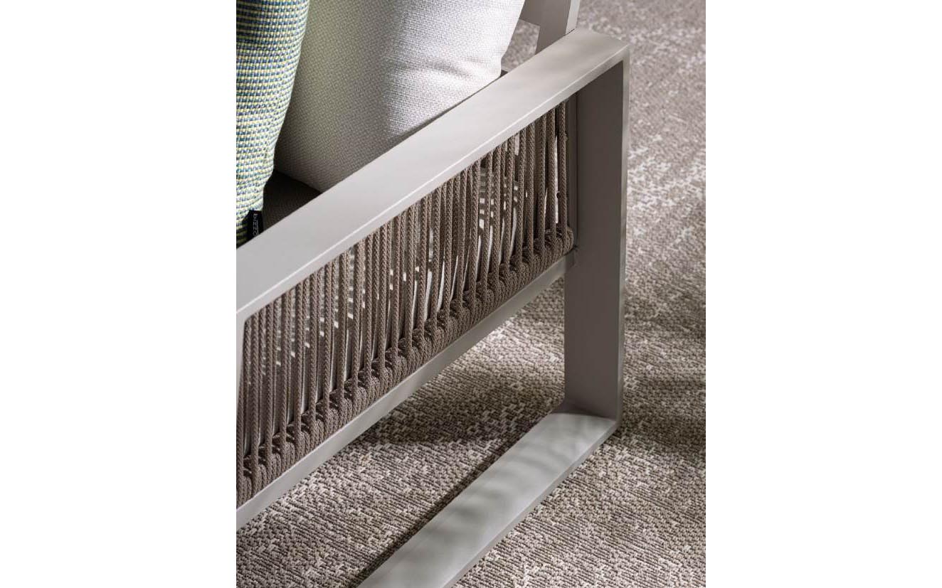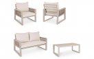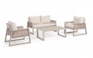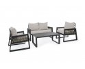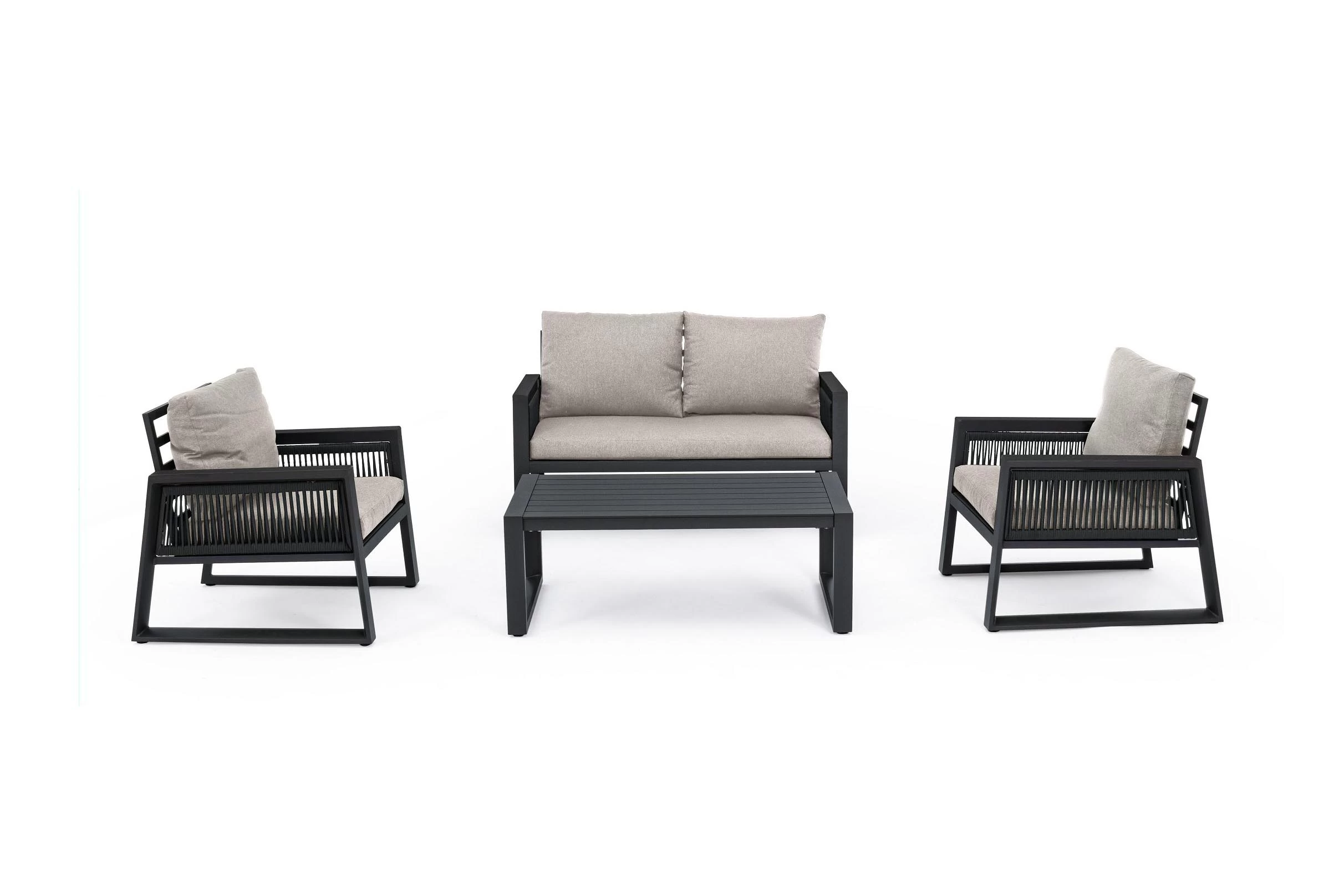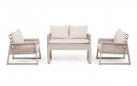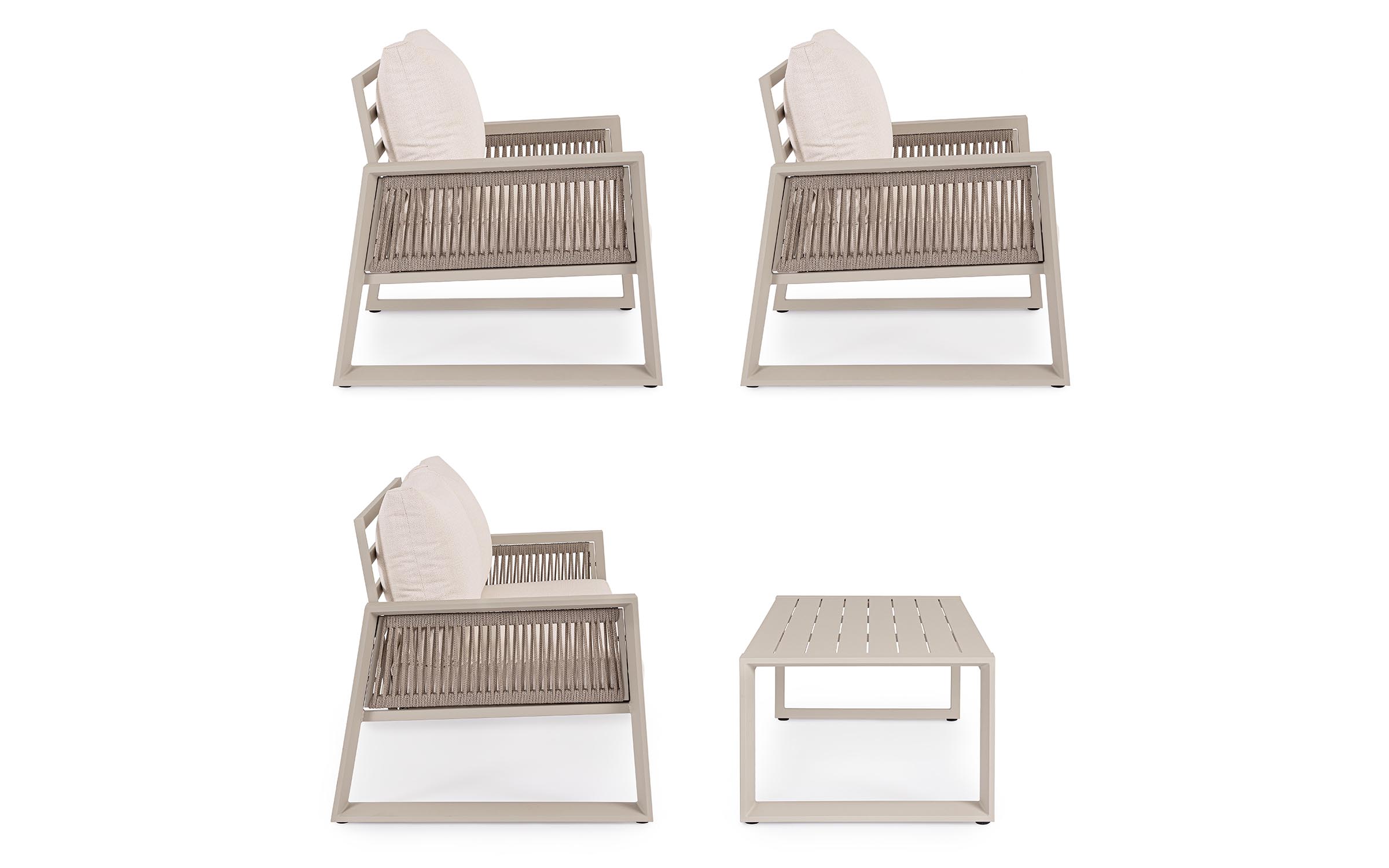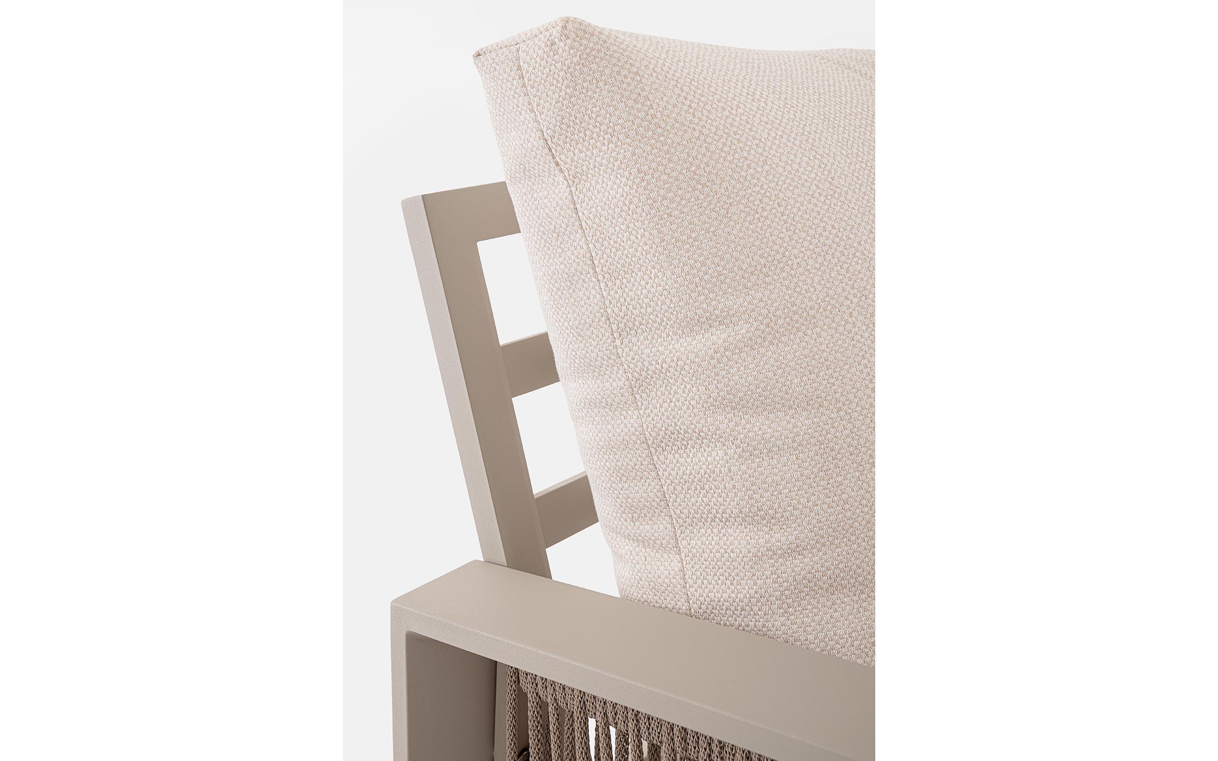 Nowoczesny komplet wypoczynkowy kawowy z ergonomicznej aluminiowej konstrukcji z wygodnymi poduszkami z materiału poliestrowego. Boki mebli wykonane z liny tekstylinowej.