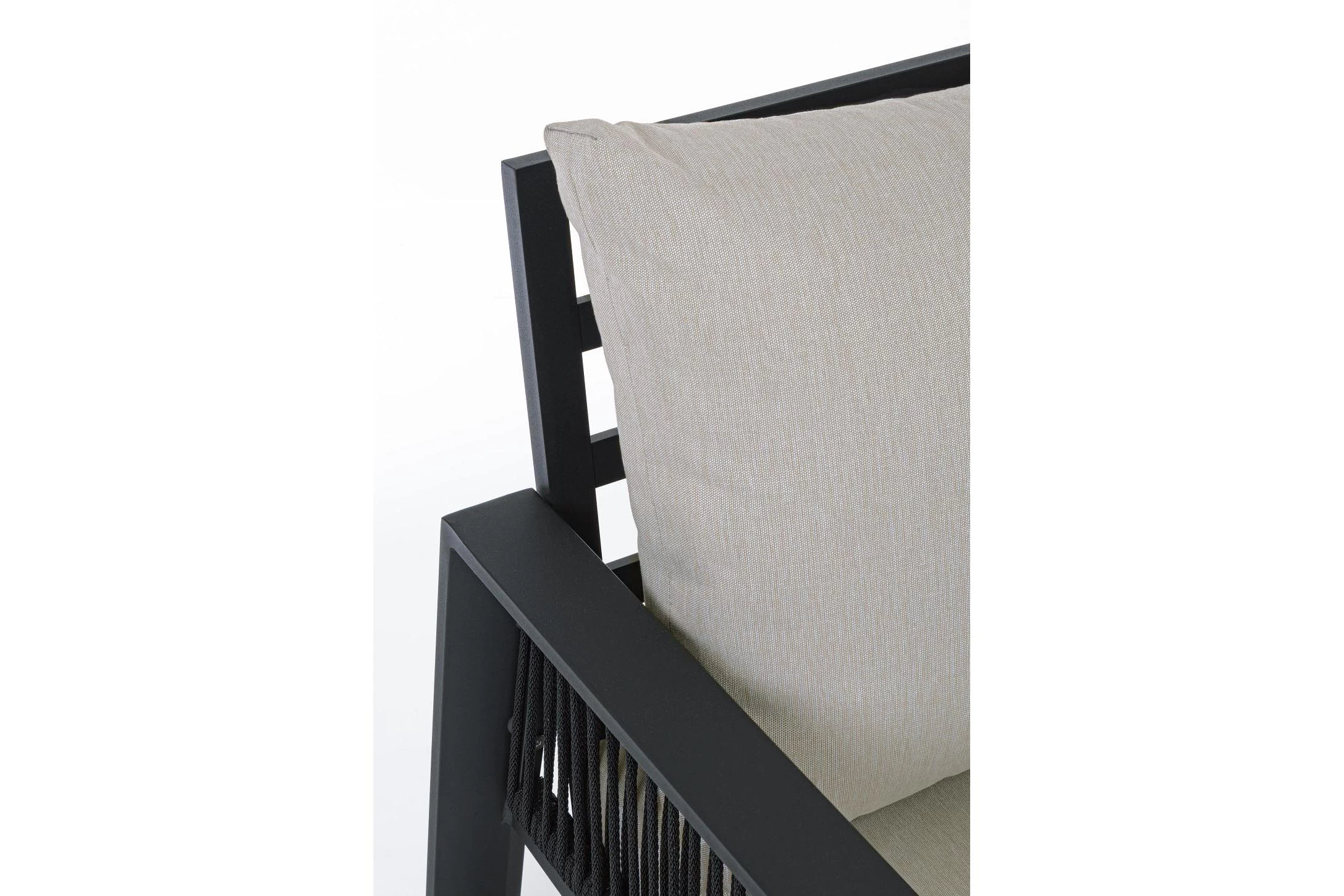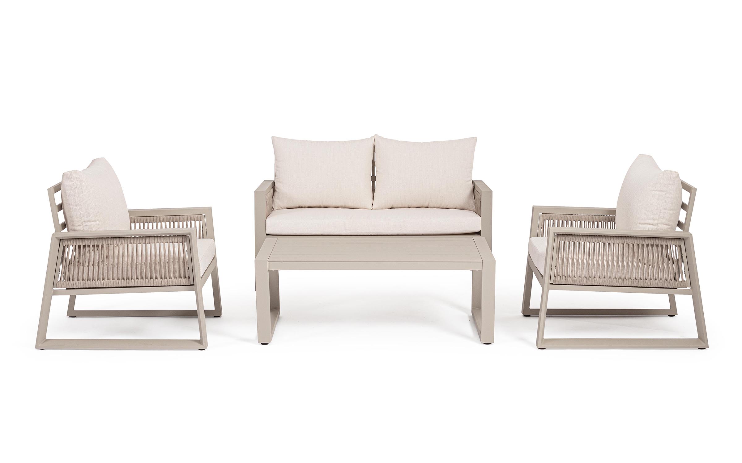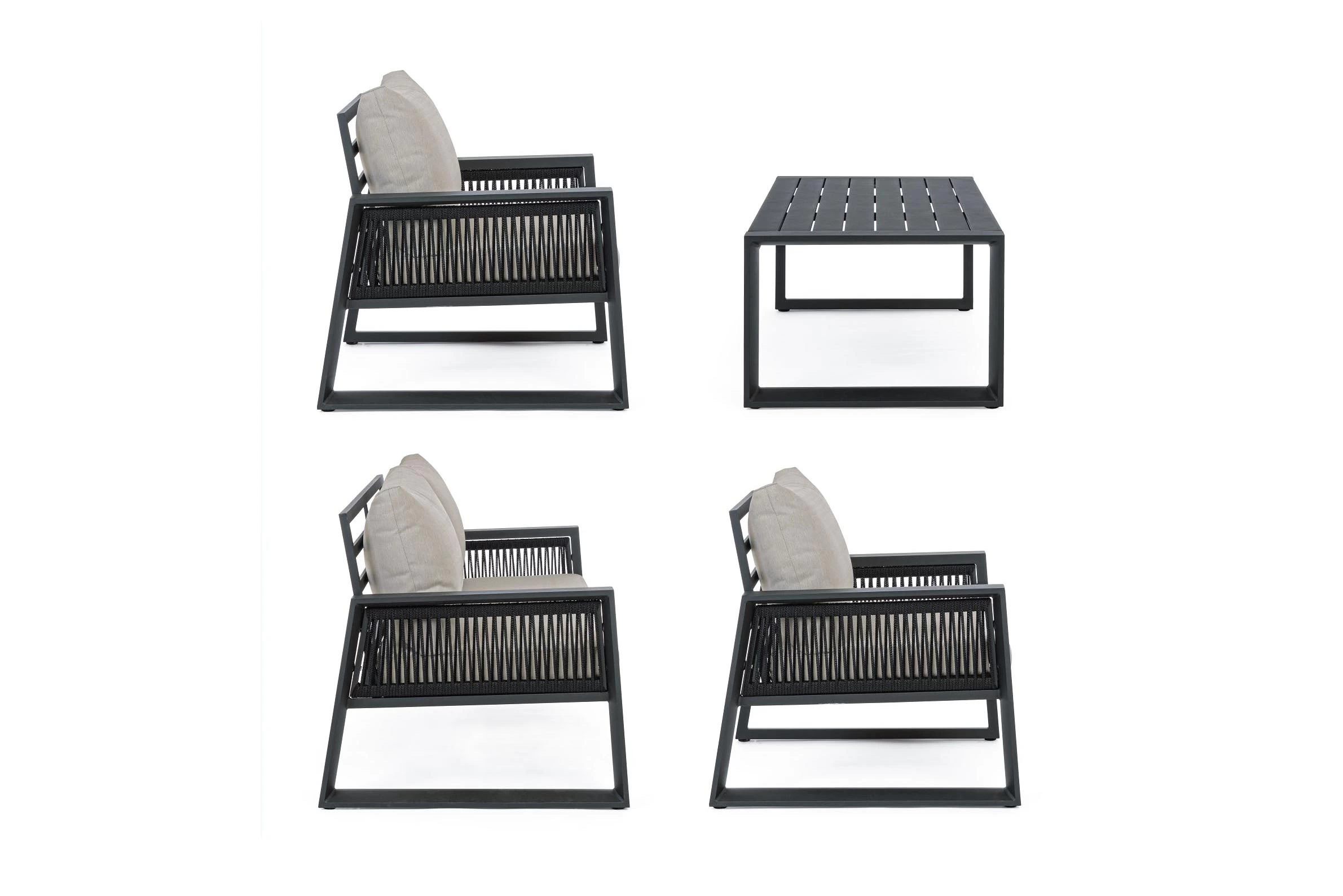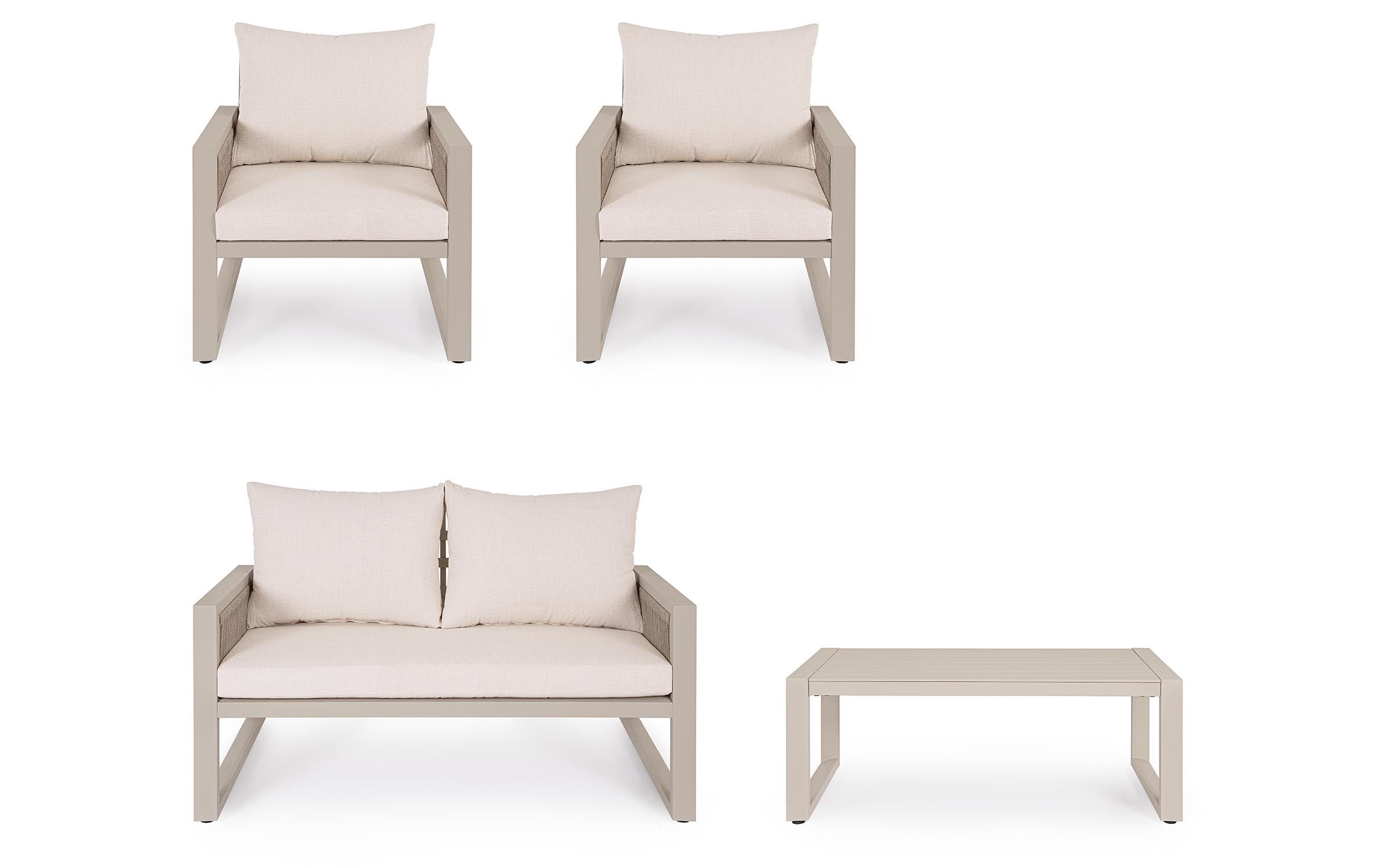 Nowoczesny komplet wypoczynkowy kawowy z ergonomicznej aluminiowej konstrukcji z wygodnymi poduszkami z materiału poliestrowego. Boki mebli wykonane z liny tekstylinowej.