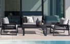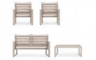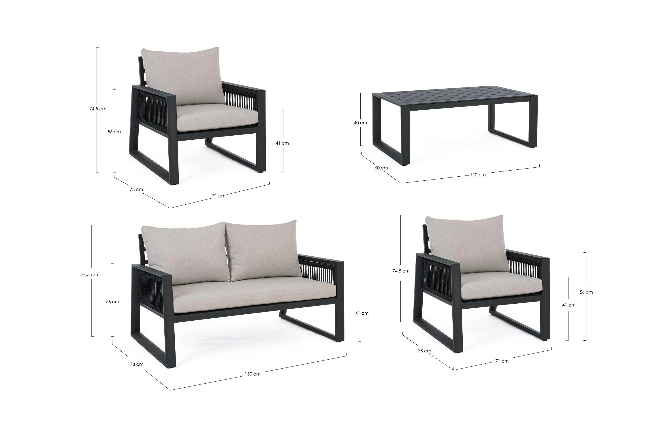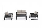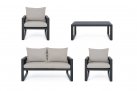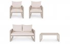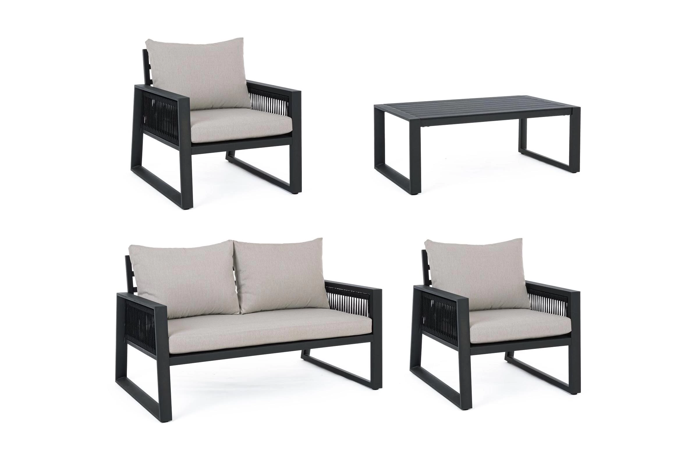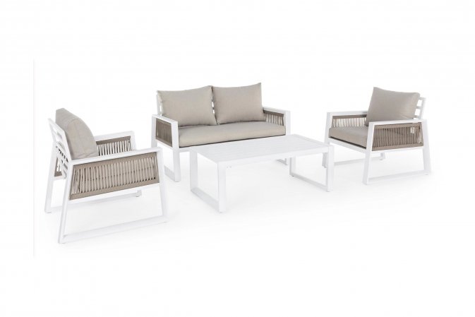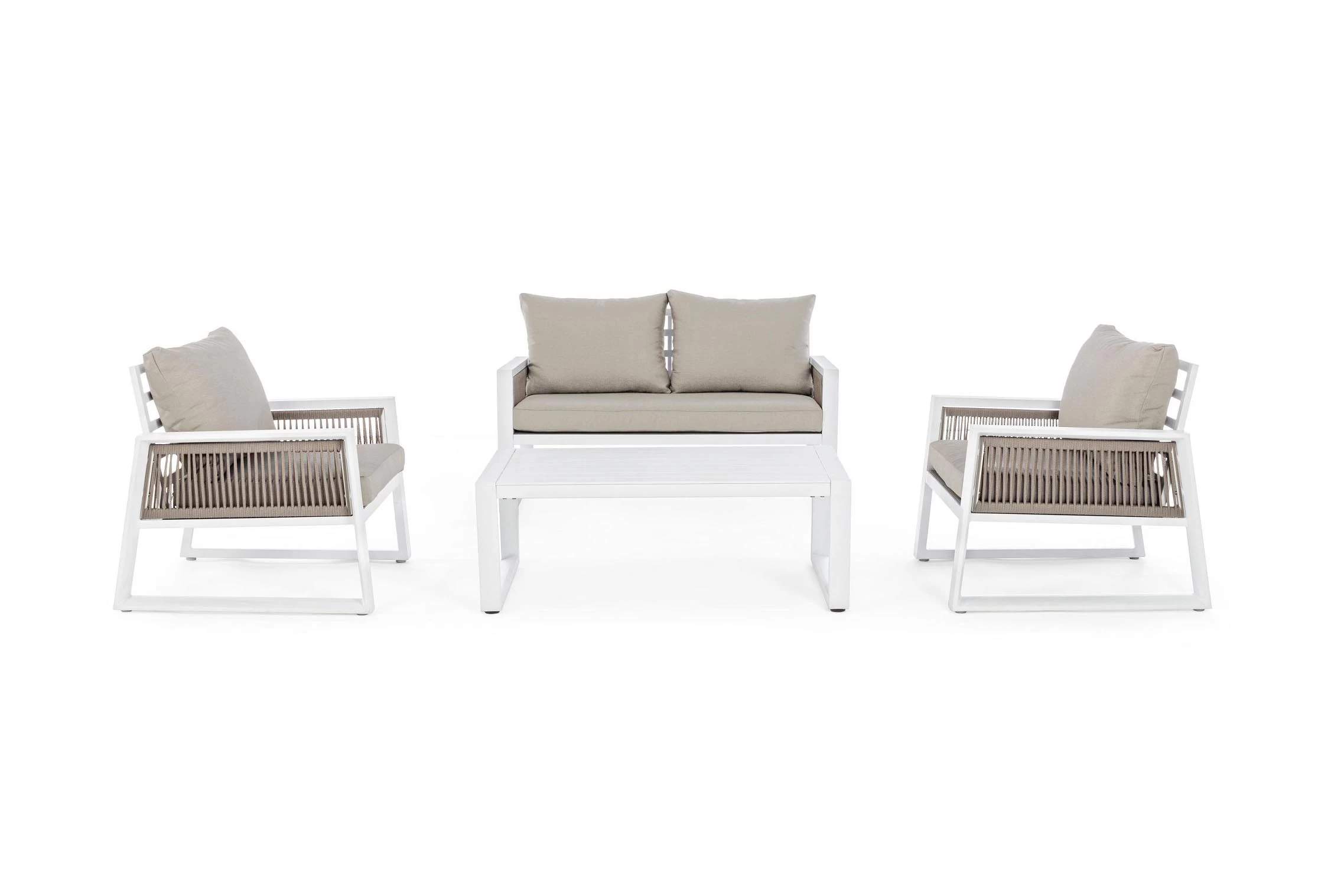 Nowoczesny komplet wypoczynkowy kawowy z ergonomicznej aluminiowej konstrukcji z wygodnymi poduszkami z materiału poliestrowego. Boki mebli wykonane z liny tekstylinowej.