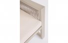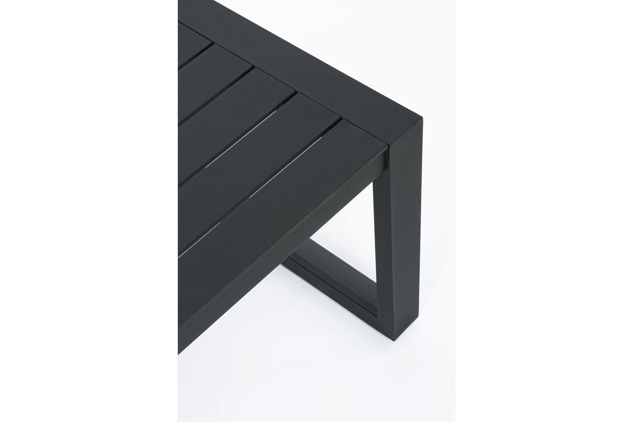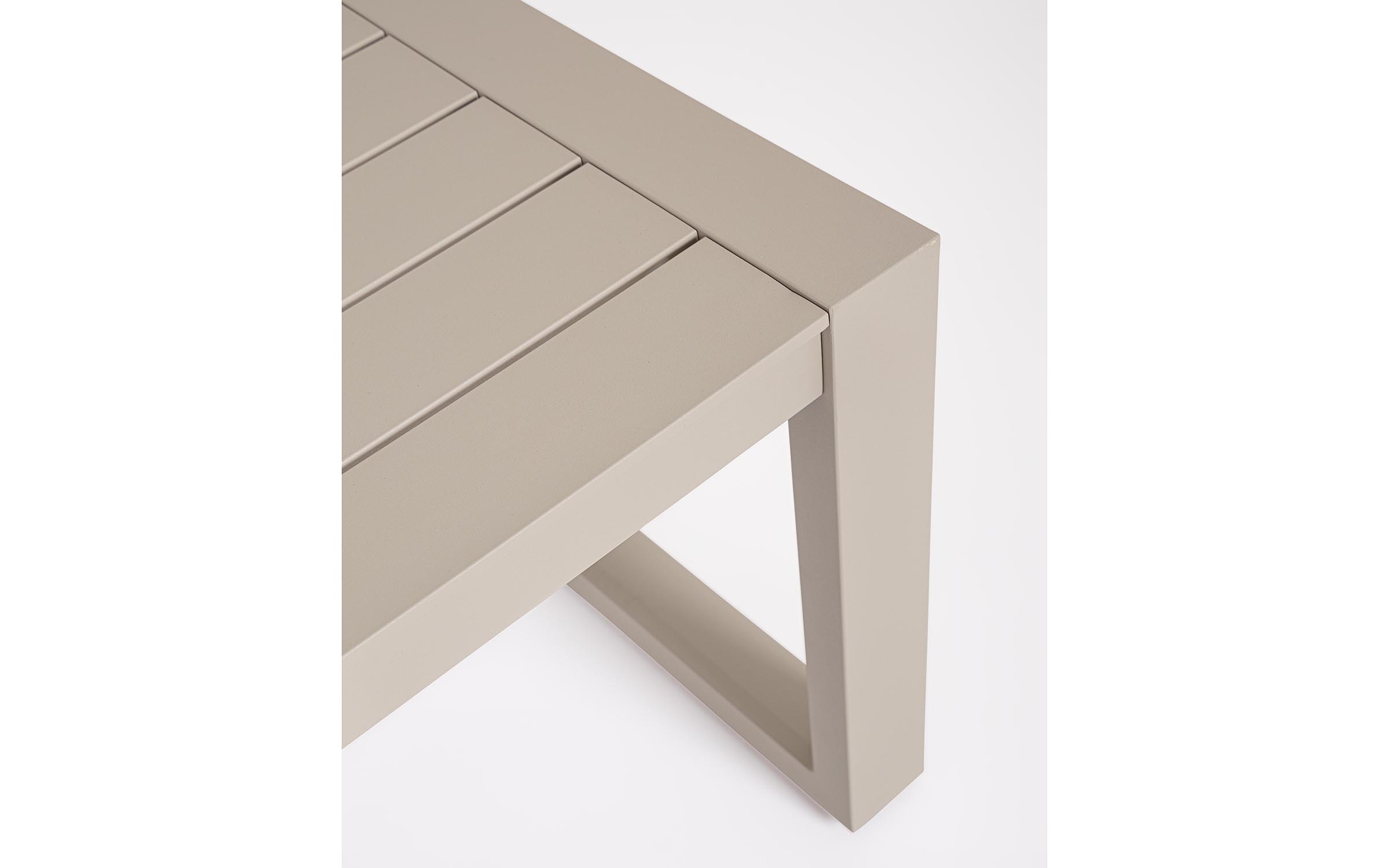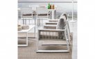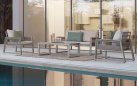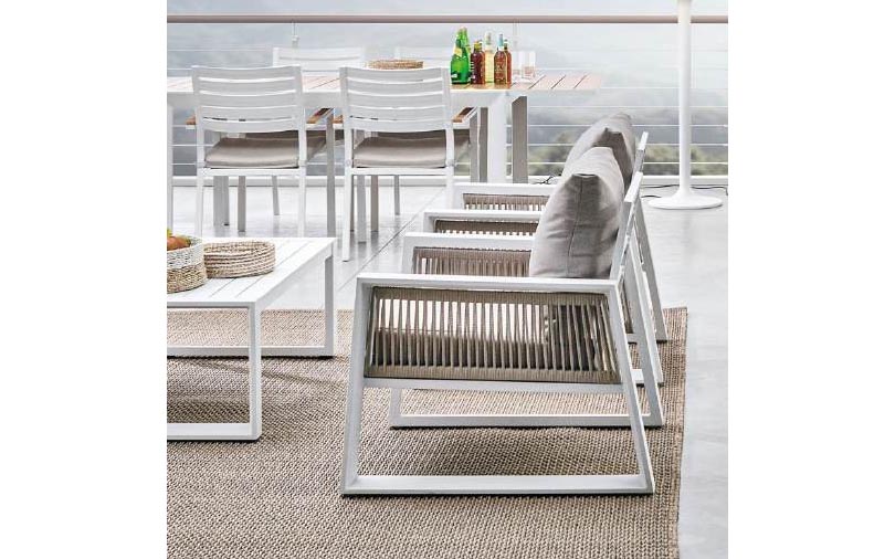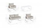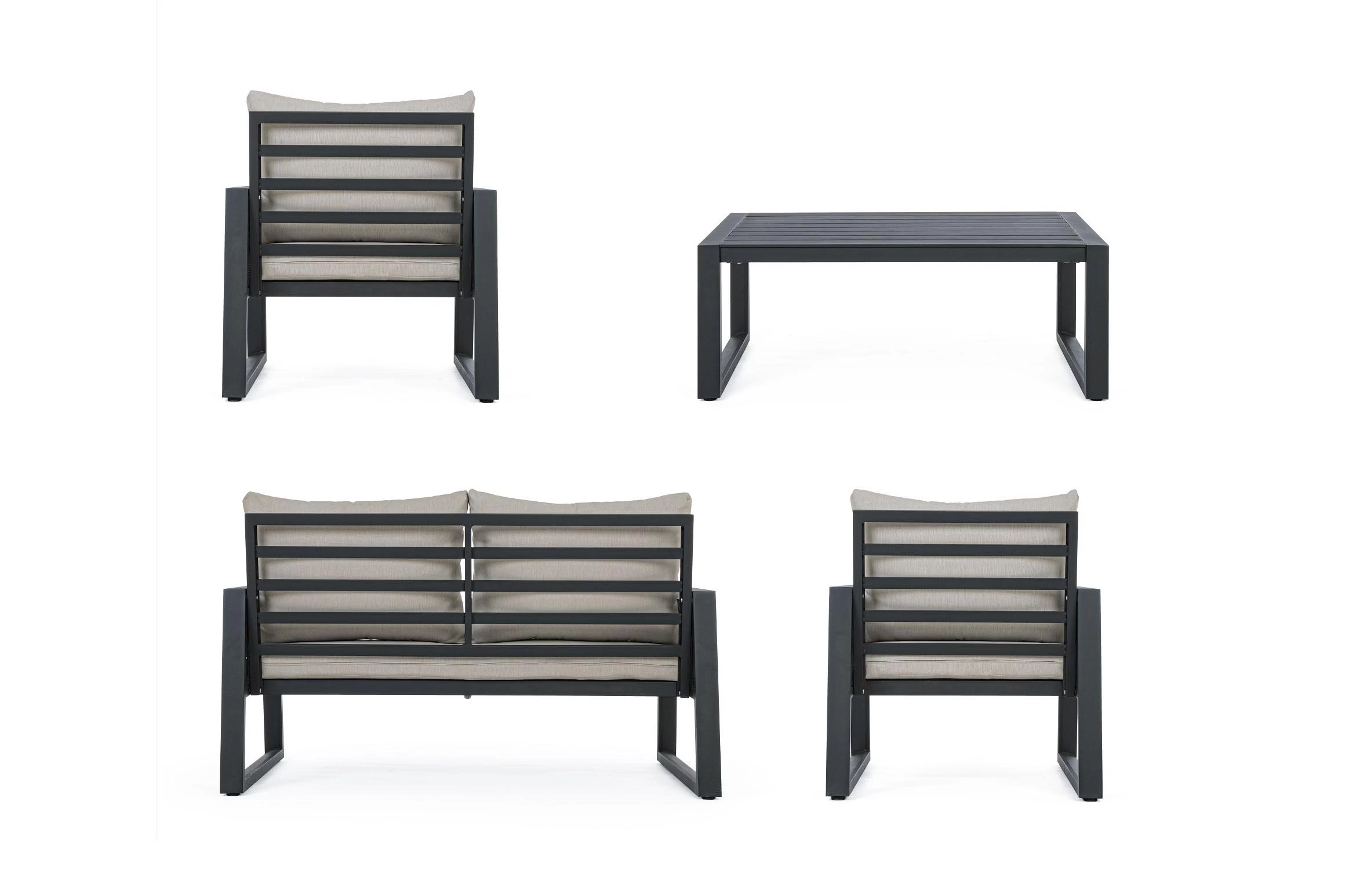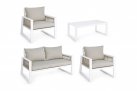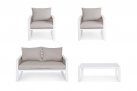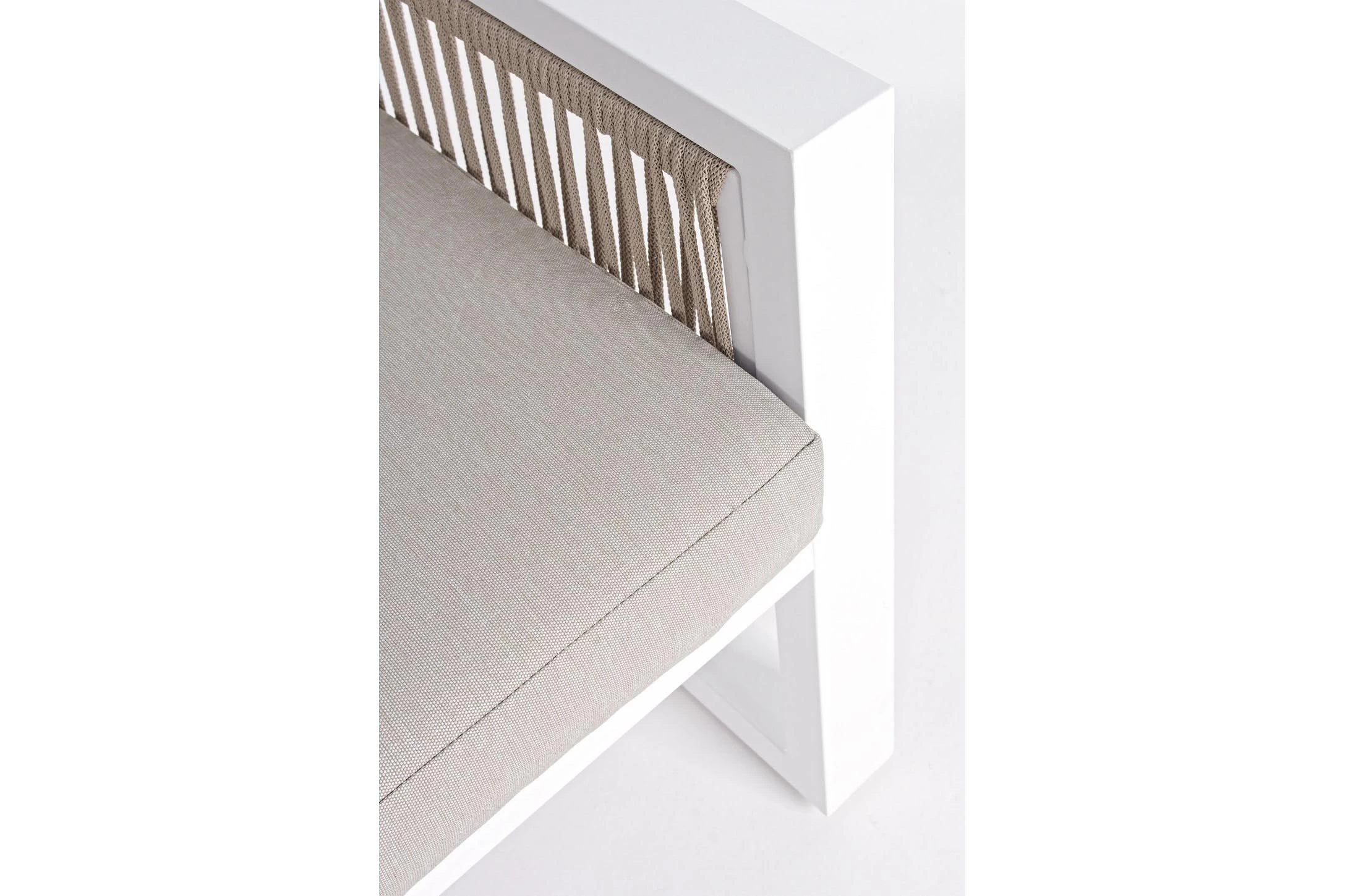 Nowoczesny komplet wypoczynkowy kawowy z ergonomicznej aluminiowej konstrukcji z wygodnymi poduszkami z materiału poliestrowego. Boki mebli wykonane z liny tekstylinowej.