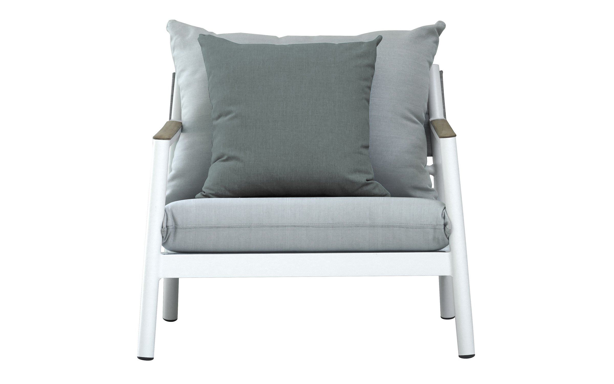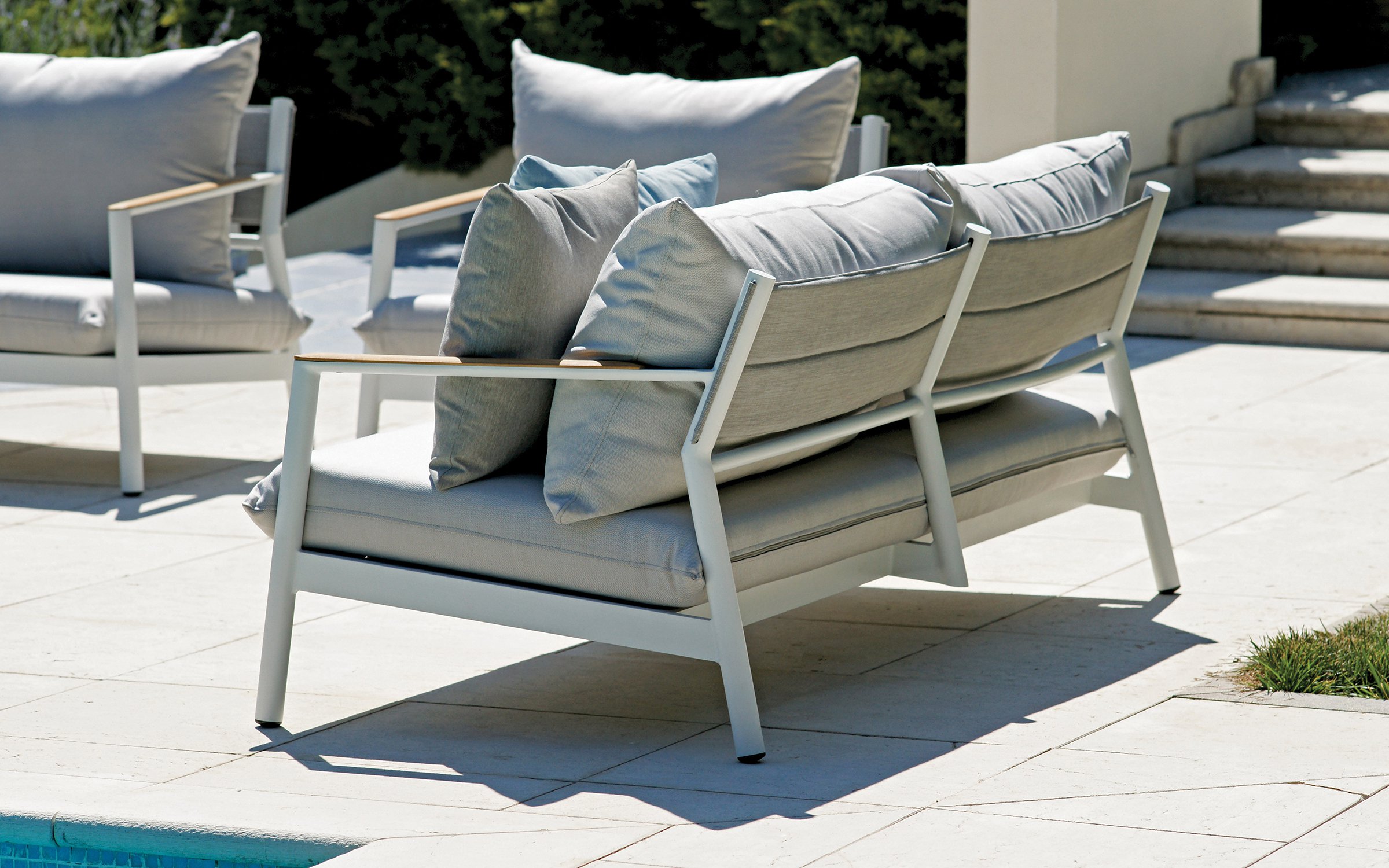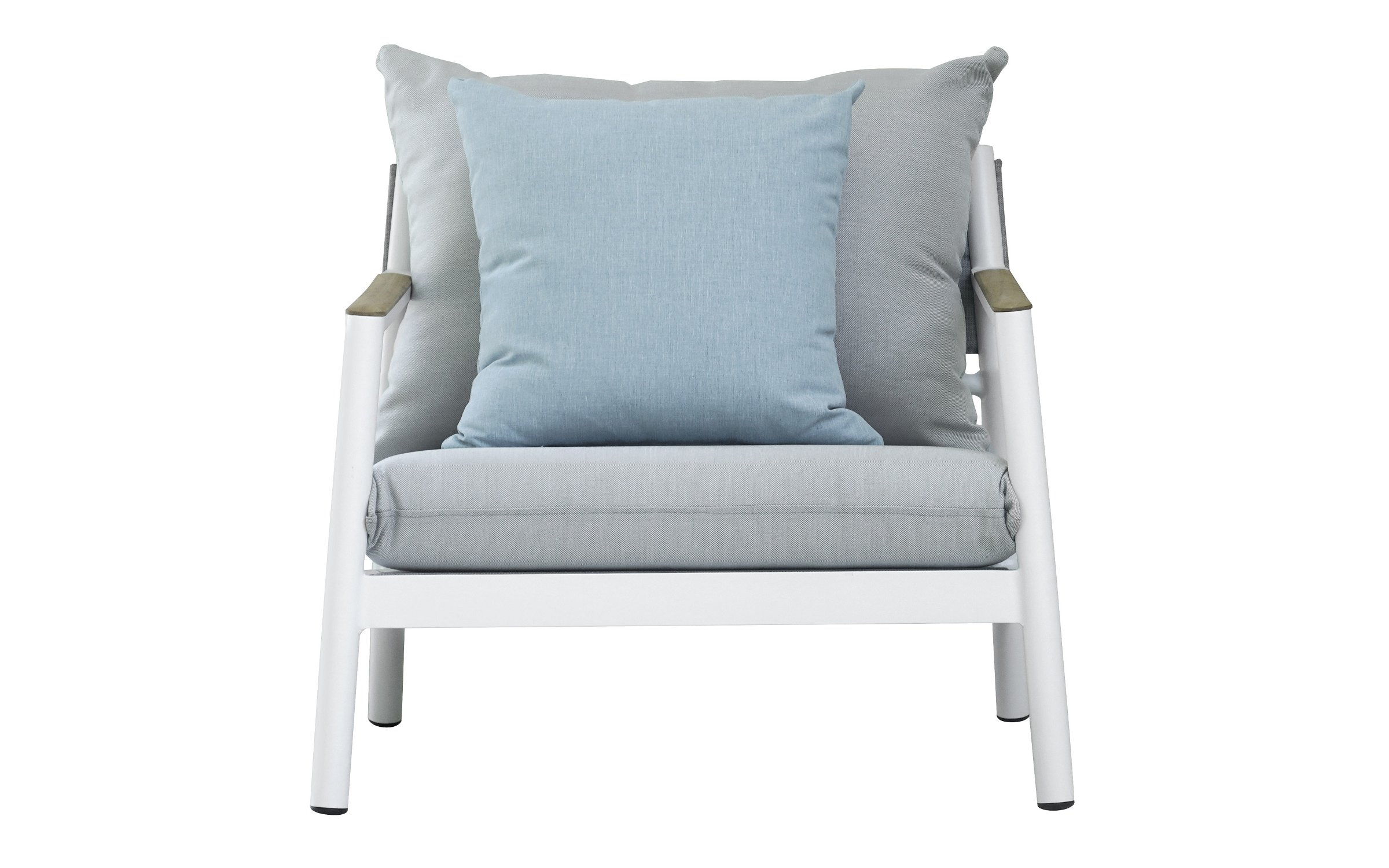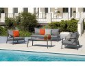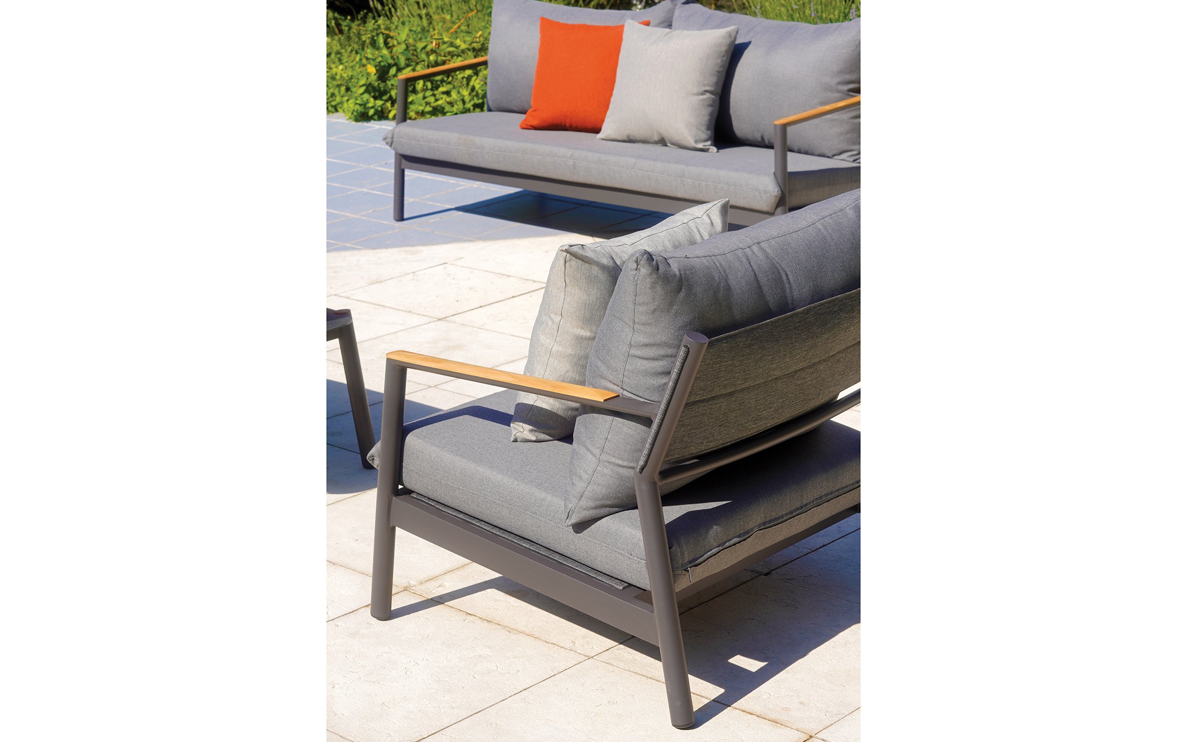 Konstrukcja z aluminium malowanego proszkowo. Podłokietniki z drewna teak. Blat stolika z ceramic glass o efekcie cementu lub łupka. Poduszki zdejmowane w kolorze piaskowym lub szarym, pillow dekoracyjne w zestawie.