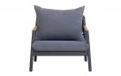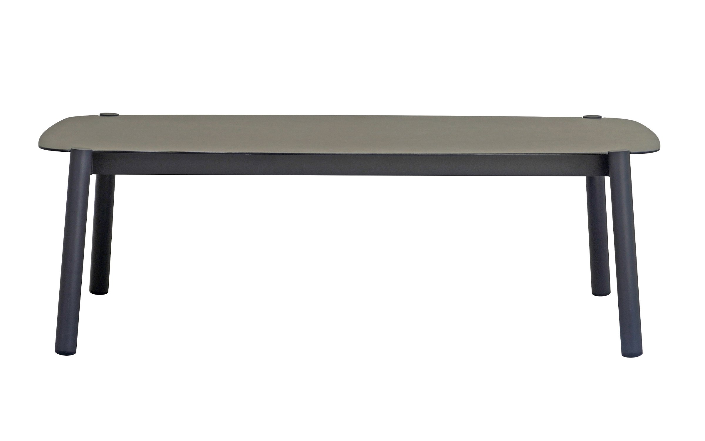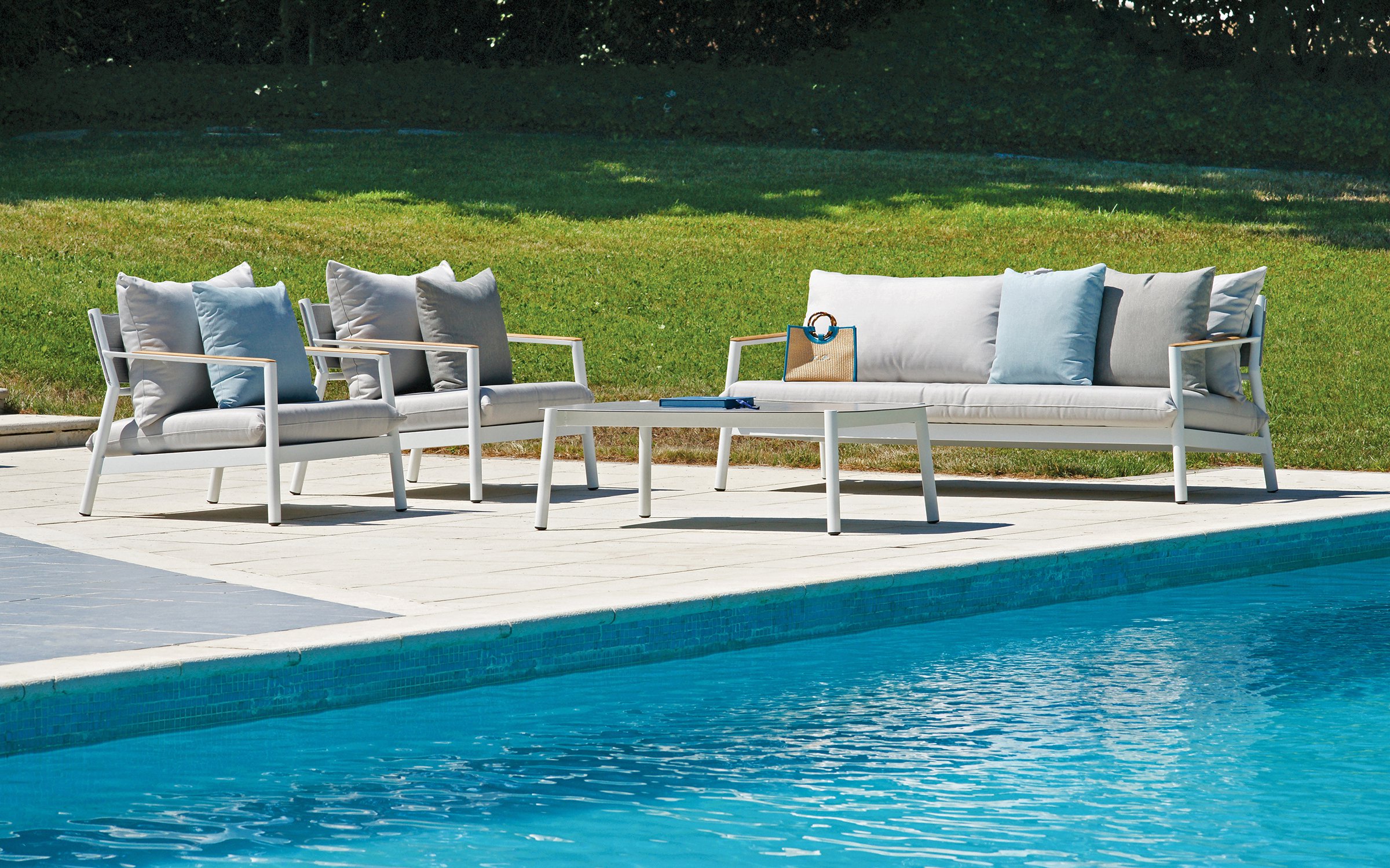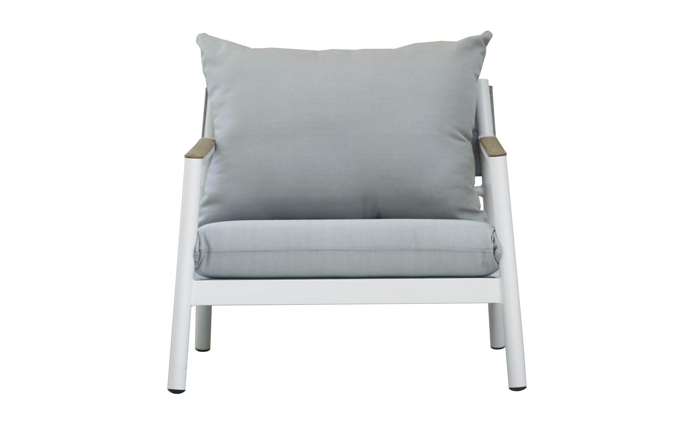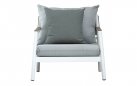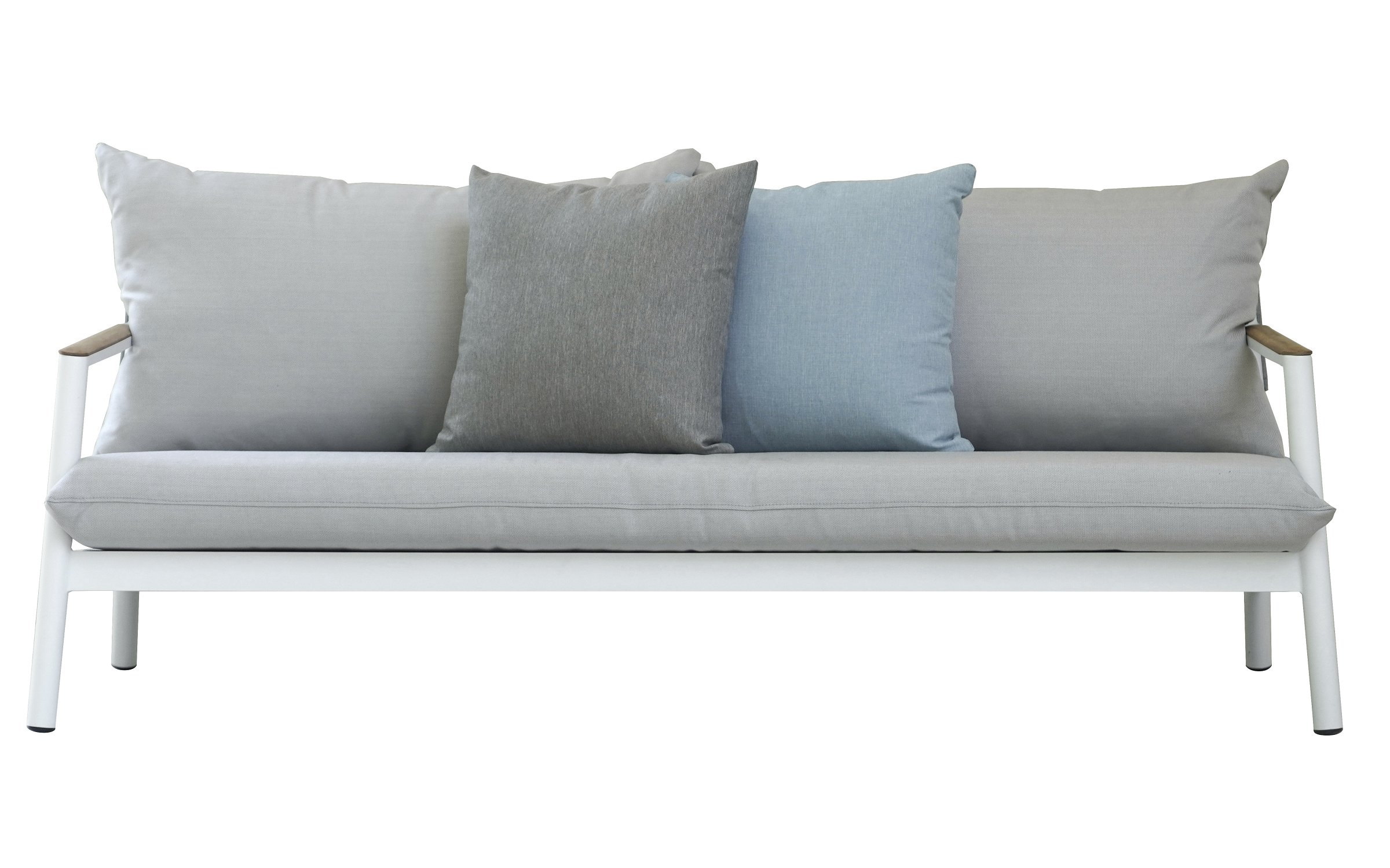 Konstrukcja z aluminium malowanego proszkowo. Podłokietniki z drewna teak. Blat stolika z ceramic glass o efekcie cementu lub łupka. Poduszki zdejmowane w kolorze piaskowym lub szarym, pillow dekoracyjne w zestawie.