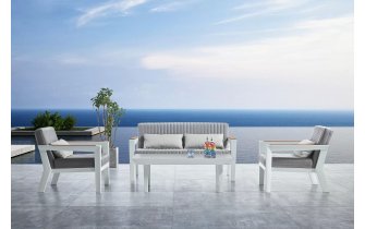 Aluminiowy modułowy narożnik ogrodowy na taras firmy HIGOLD w nowoczesnym stylu. Konstrukcja opiera się na spawanej ramie aluminiowej malowanej proszkowo, elementach dekoracyjnych z teaku i wygodnych poduszek szarych z obiciami z materiału Olefin z pięknymi pionowymi przeszyciami. Poduszki położone na opinającej siedzisko tekstylinie. Blat stolika ceramiczny o wyglądzie betonlook.