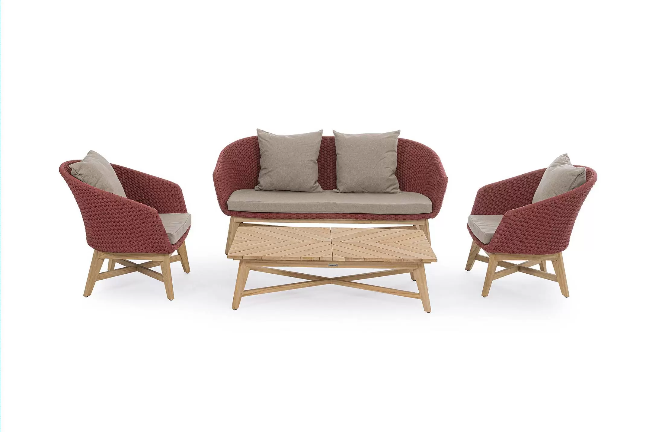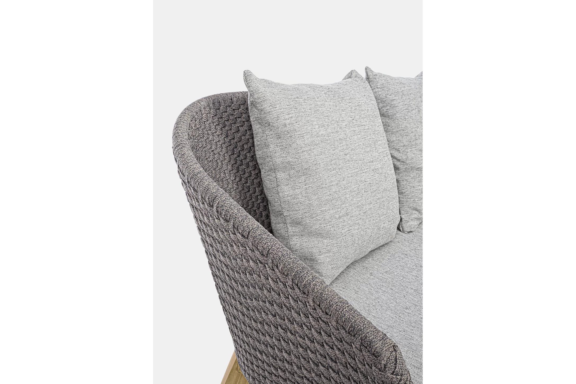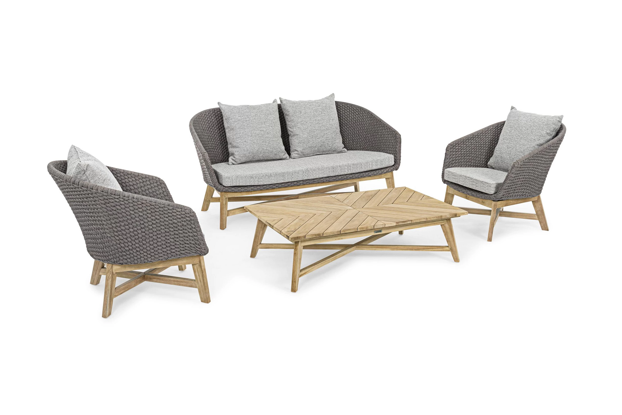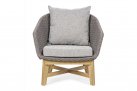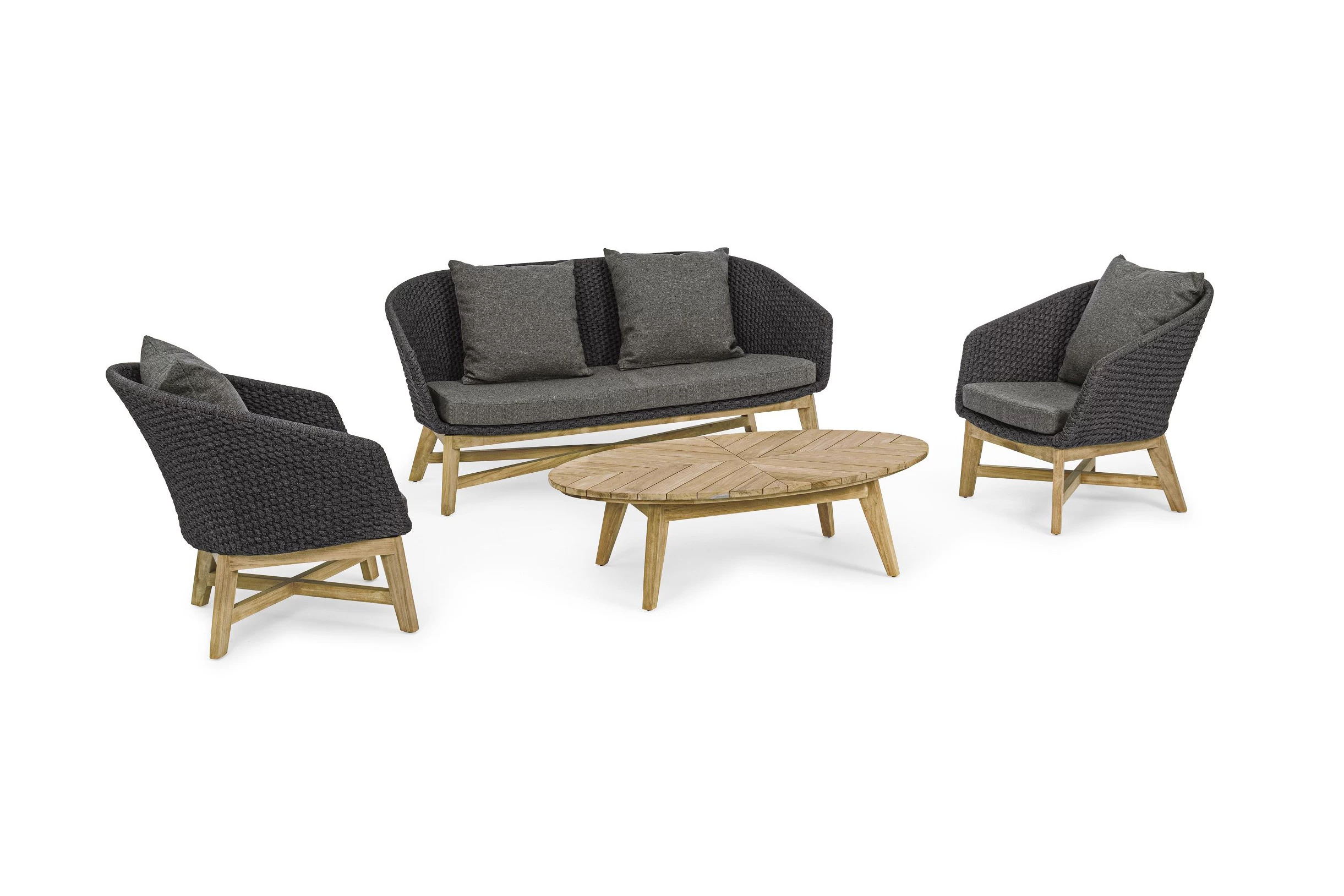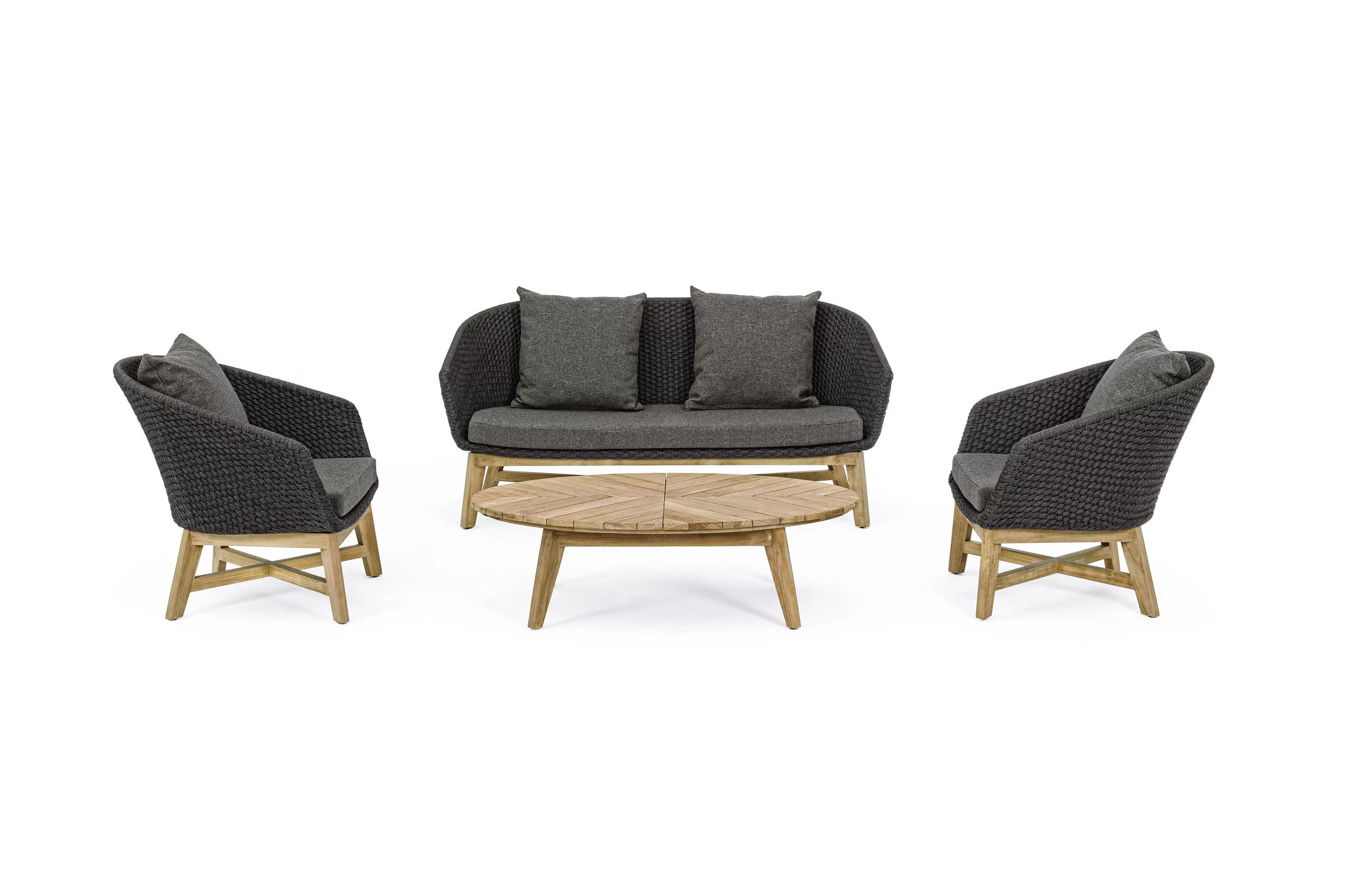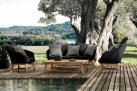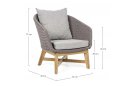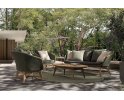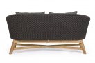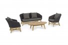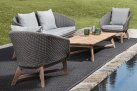 Meble ogrodowe nowoczesne z podstawą z drewna teak i siedziskami wyplatanymi lina polipropylenową. Każdy element kolekcji można zakupić osobno. Stoliki prostokątny lub owalny do wyboru.