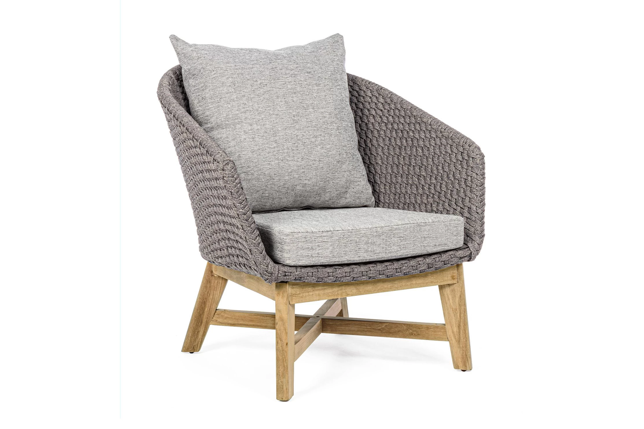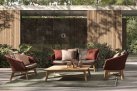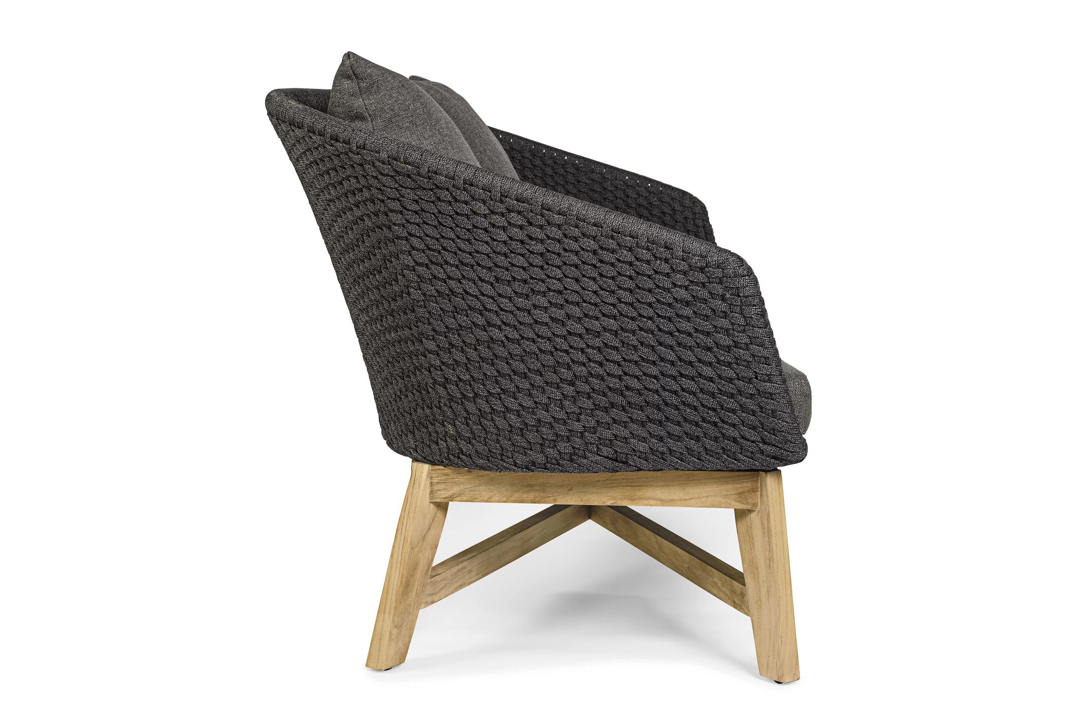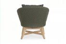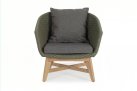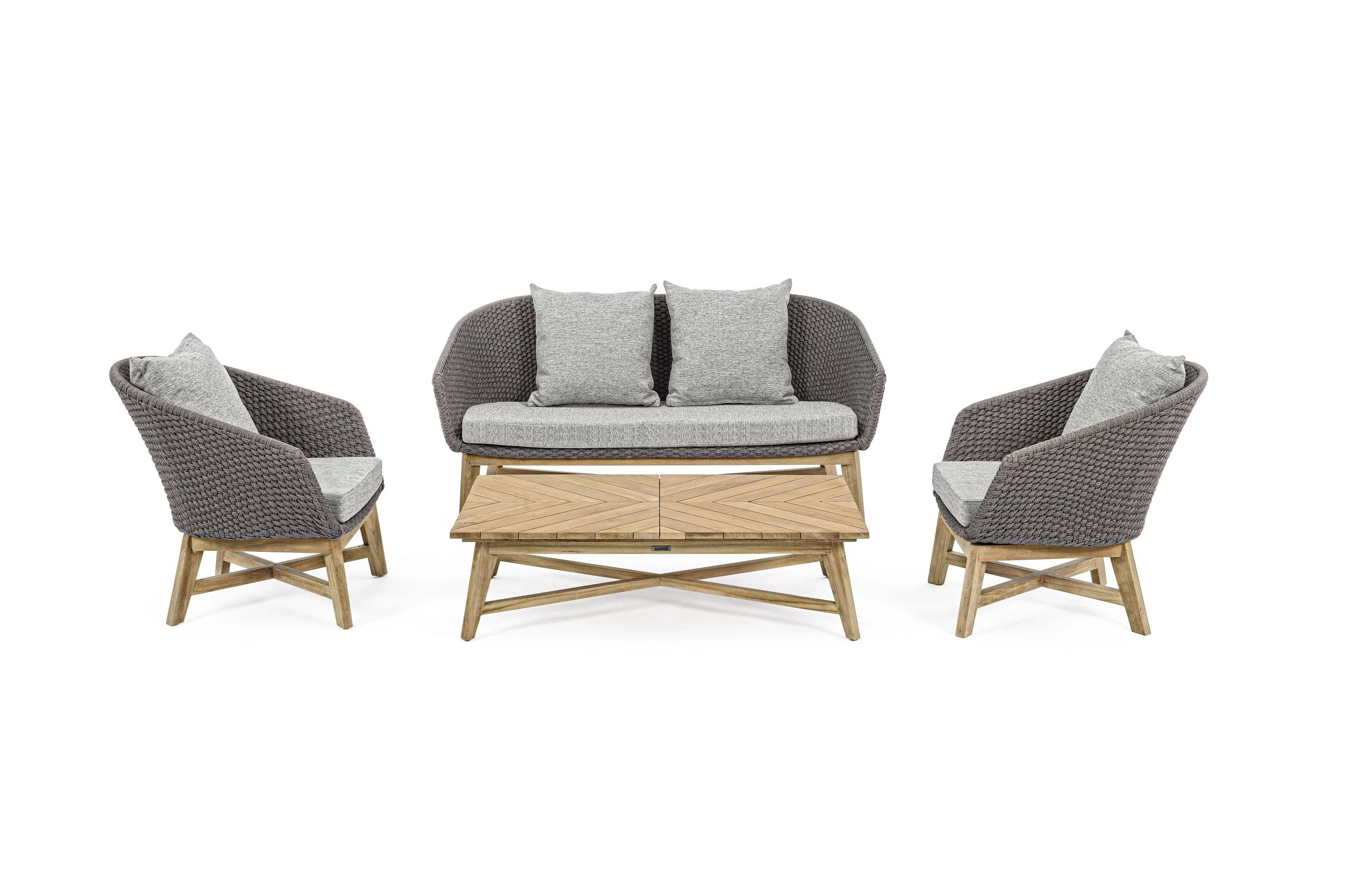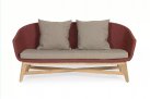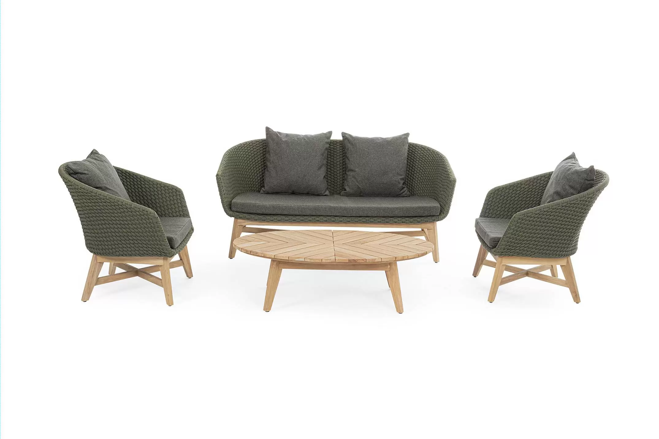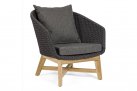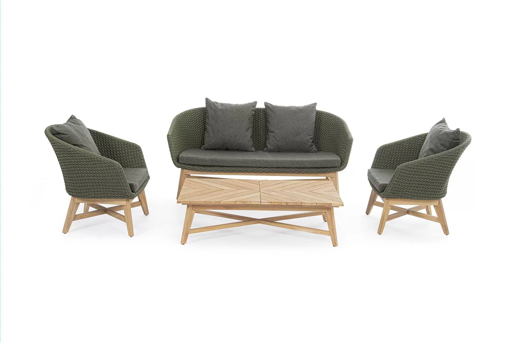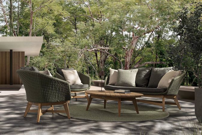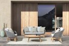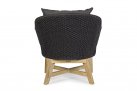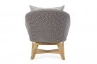 Meble ogrodowe nowoczesne z podstawą z drewna teak i siedziskami wyplatanymi lina polipropylenową. Każdy element kolekcji można zakupić osobno. Stoliki prostokątny lub owalny do wyboru.