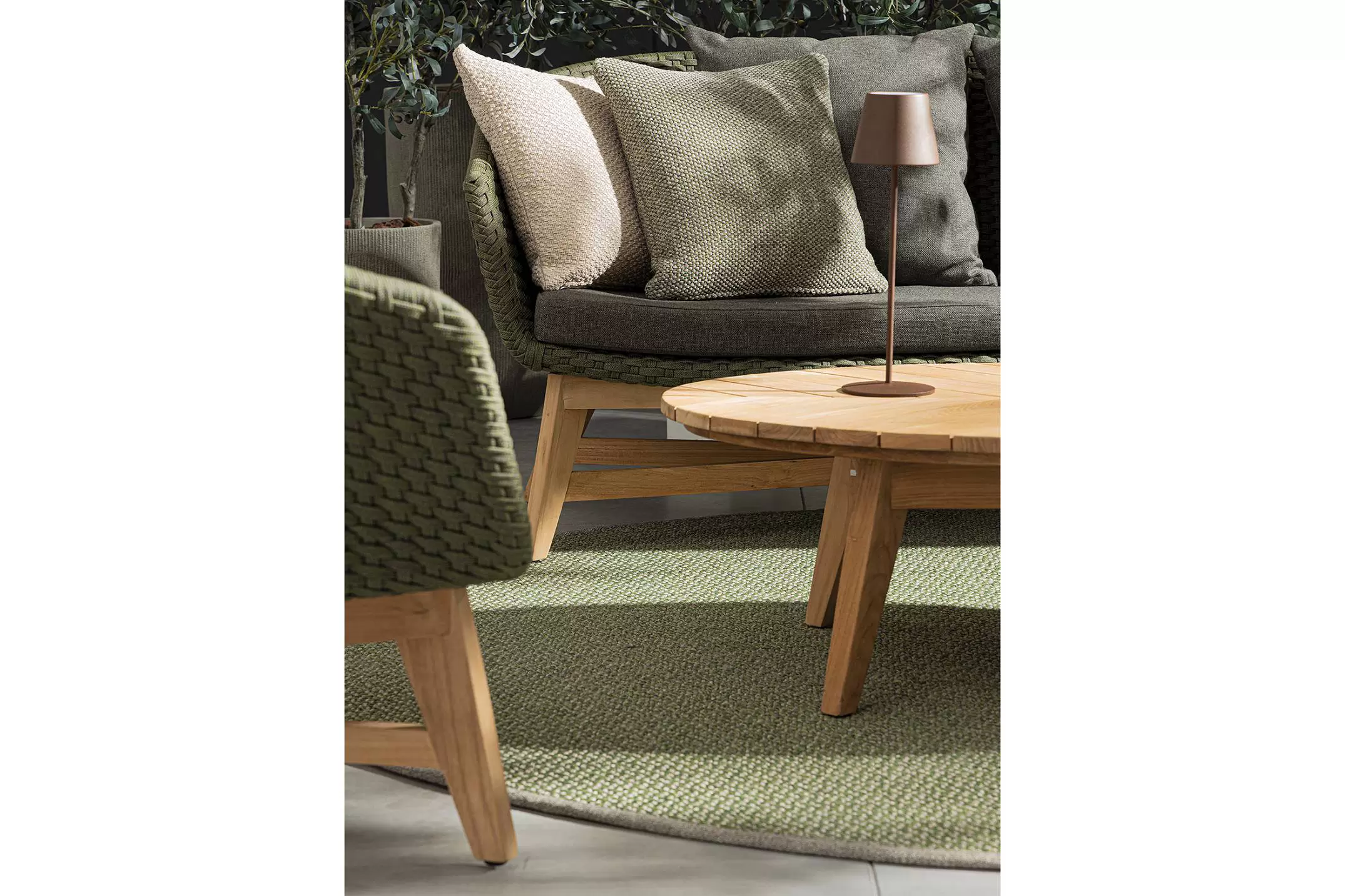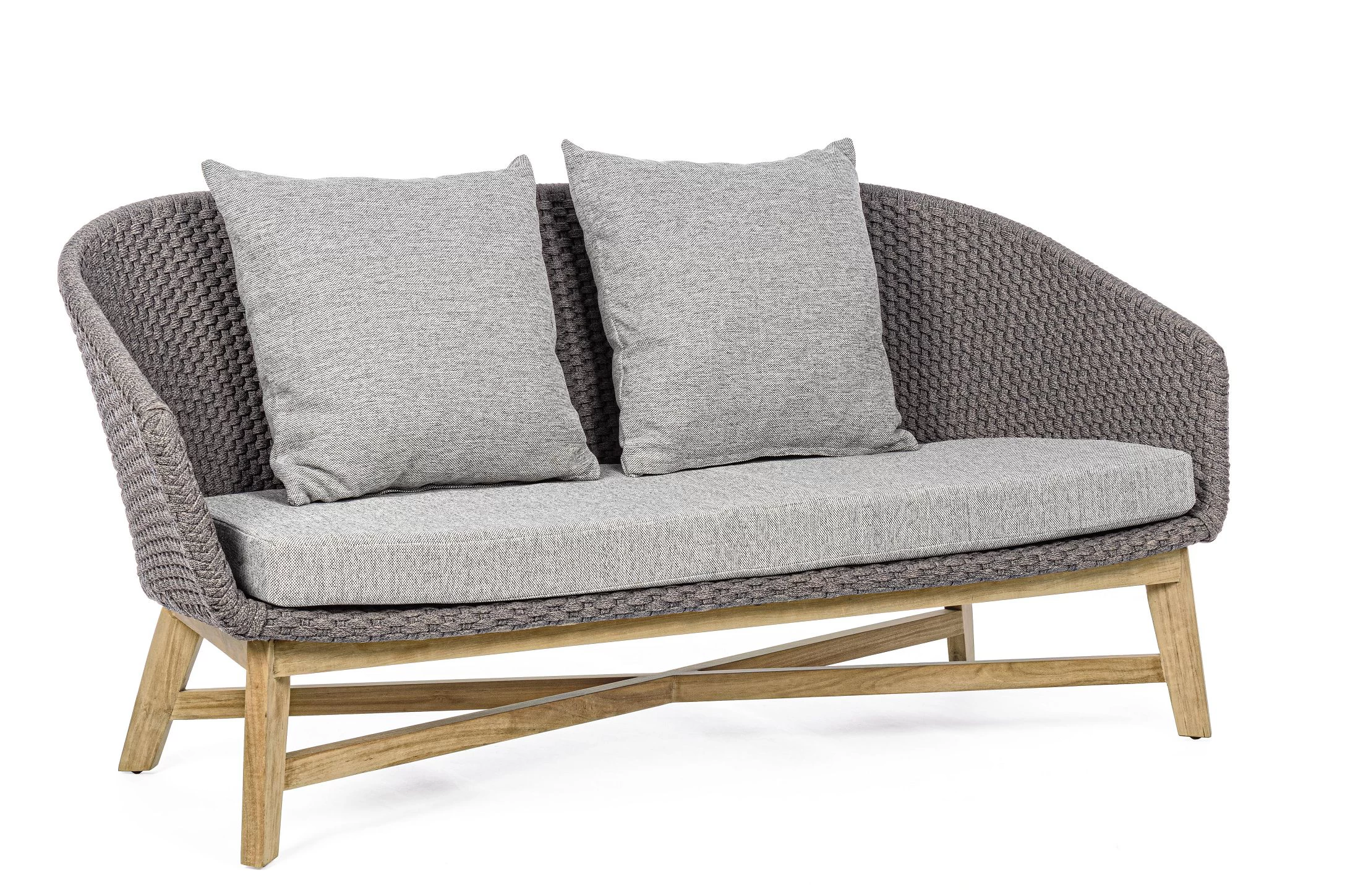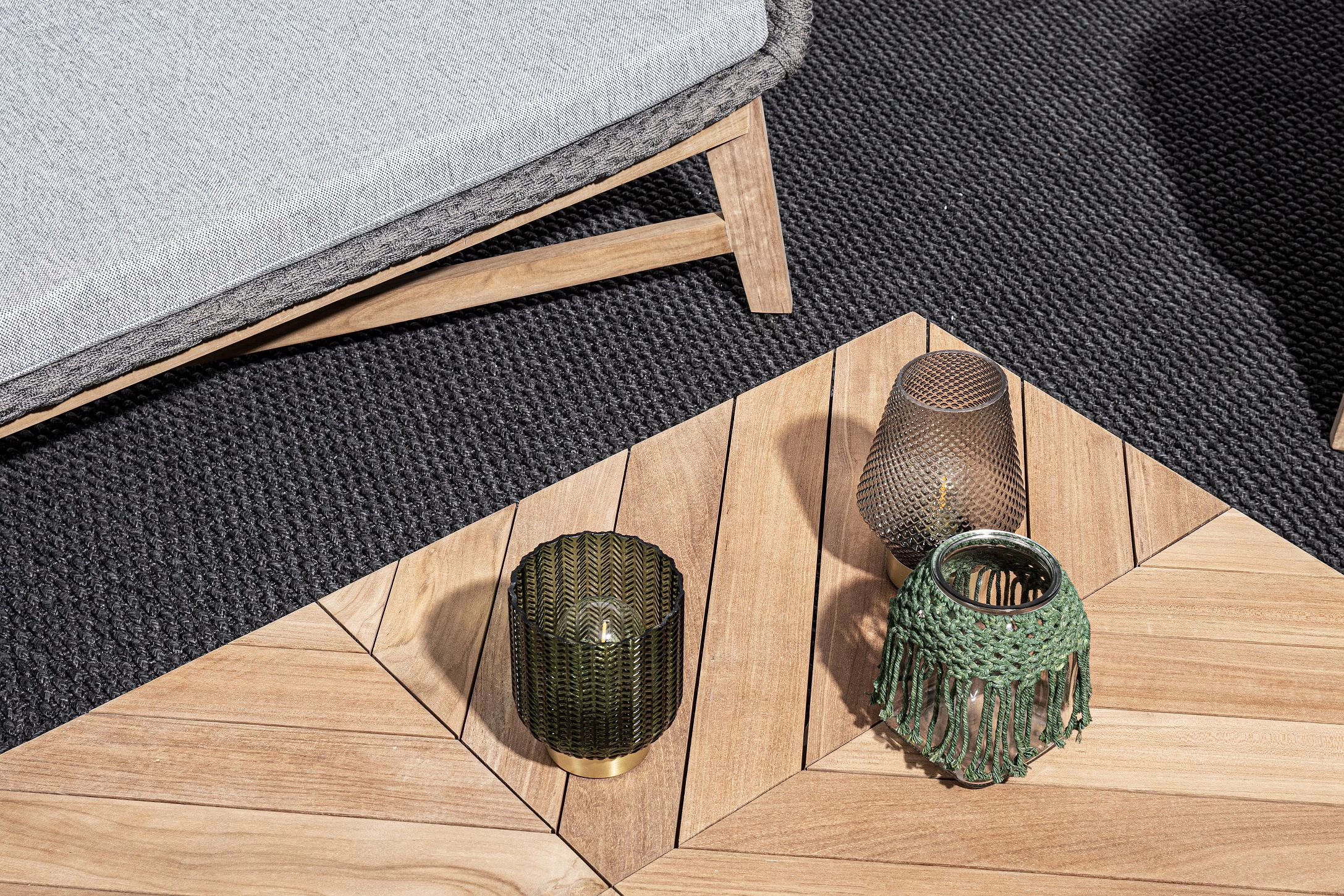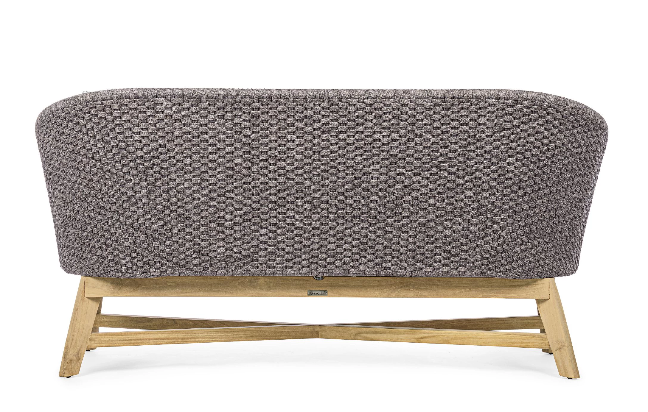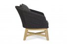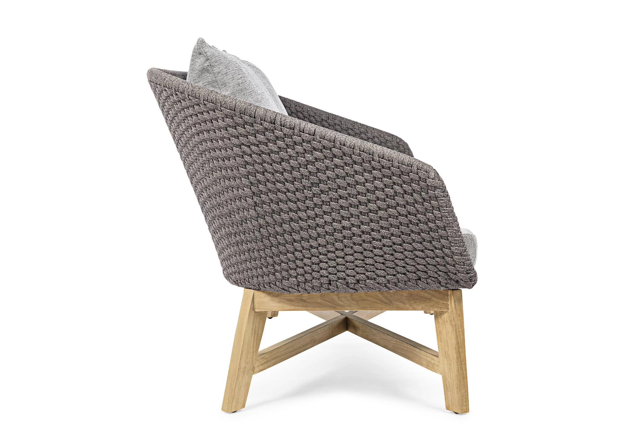Meble ogrodowe nowoczesne z podstawą z drewna teak i siedziskami wyplatanymi lina polipropylenową. Każdy element kolekcji można zakupić osobno. Stoliki prostokątny lub owalny do wyboru.