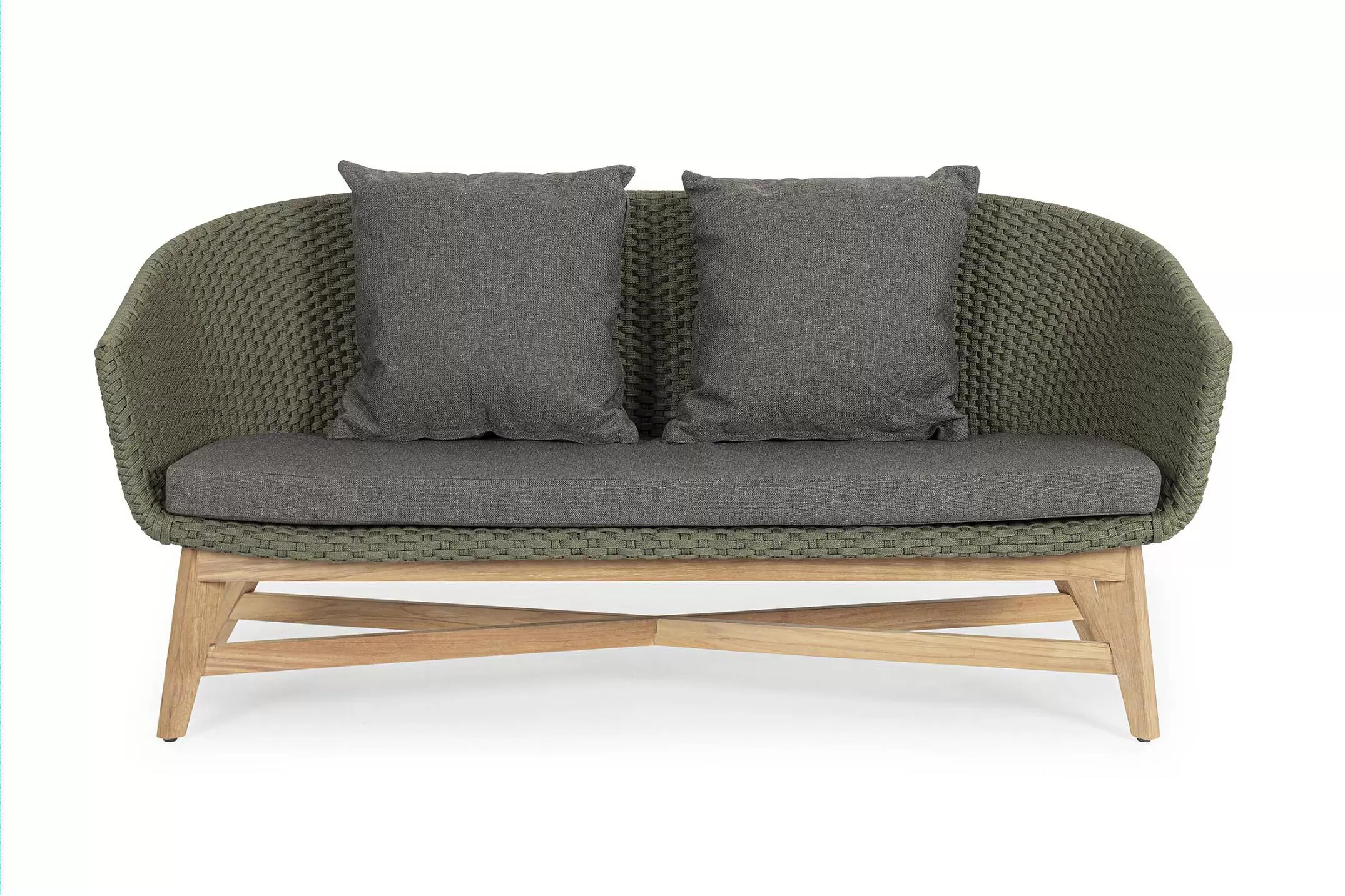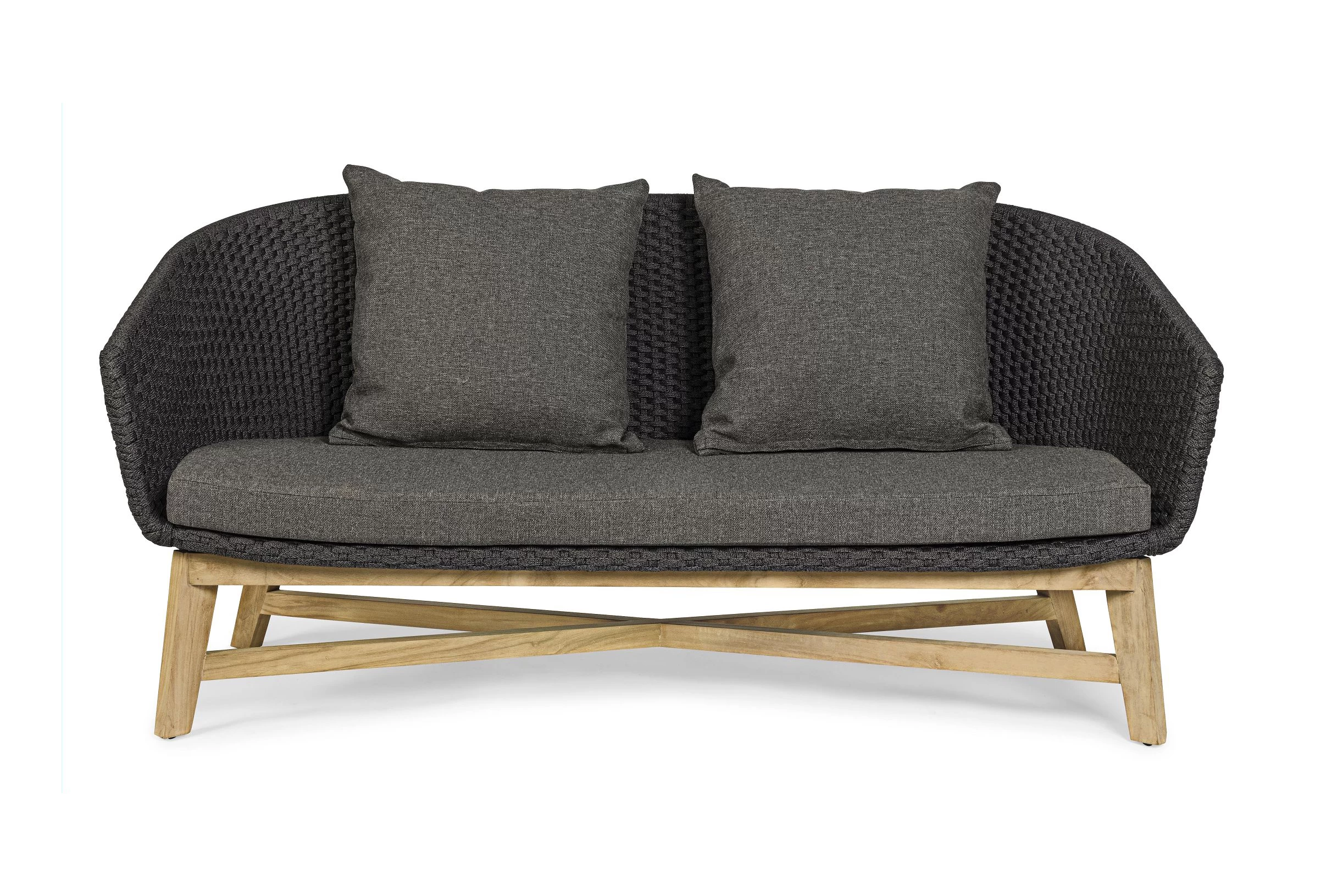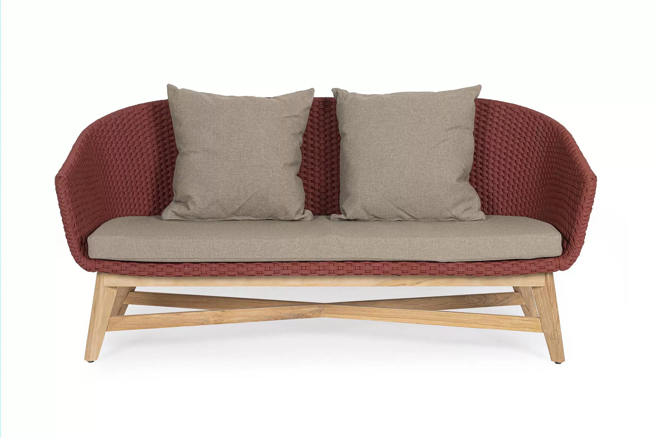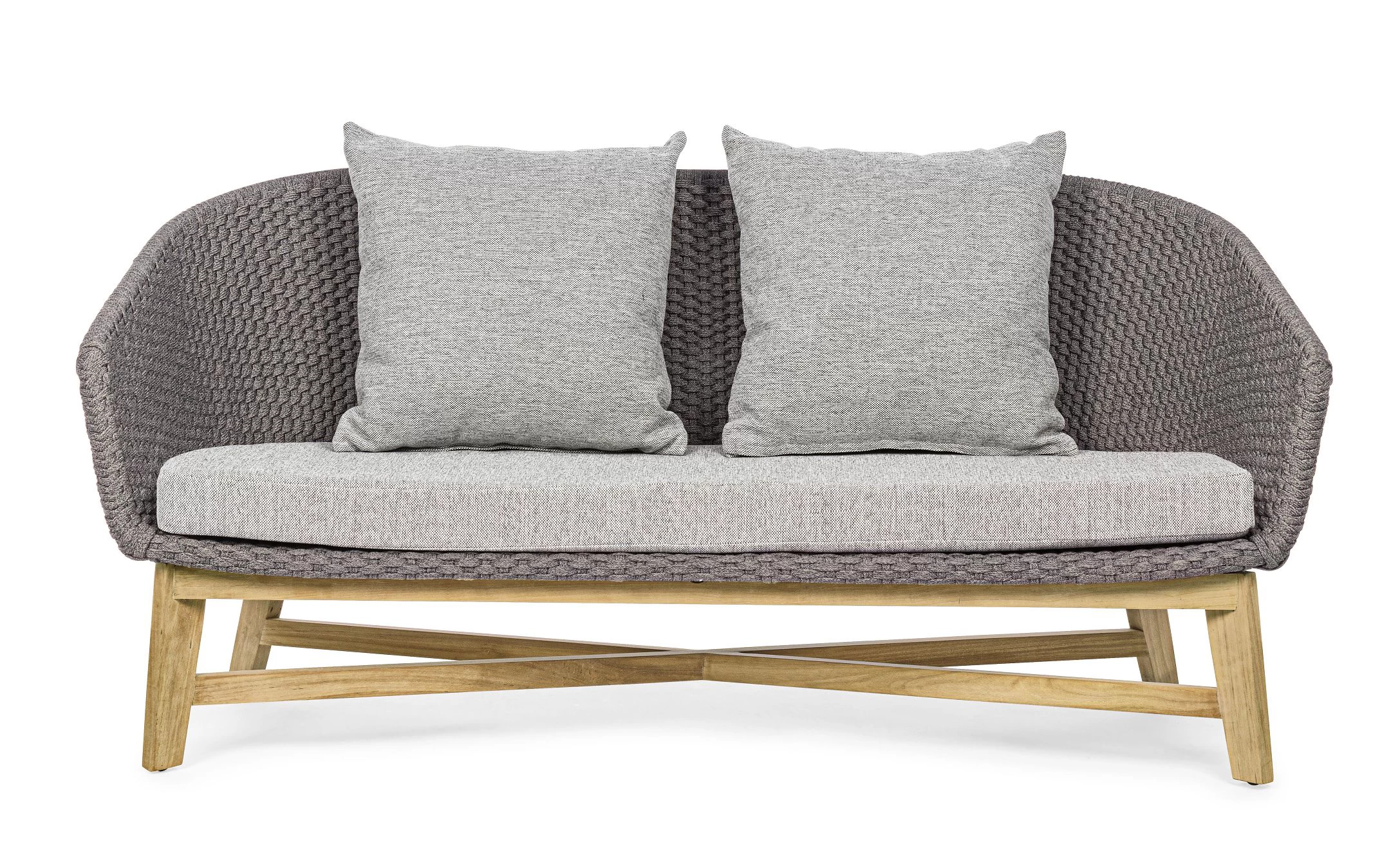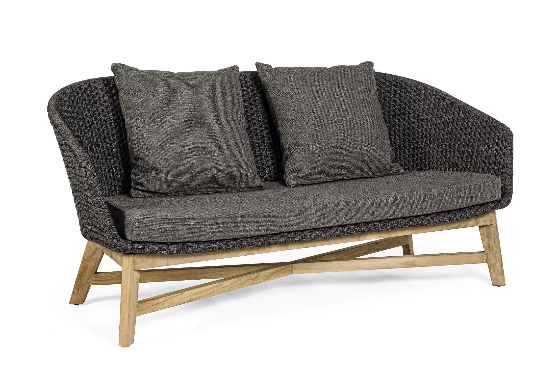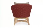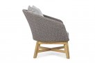 Meble ogrodowe nowoczesne z podstawą z drewna teak i siedziskami wyplatanymi lina polipropylenową. Każdy element kolekcji można zakupić osobno. Stoliki prostokątny lub owalny do wyboru.