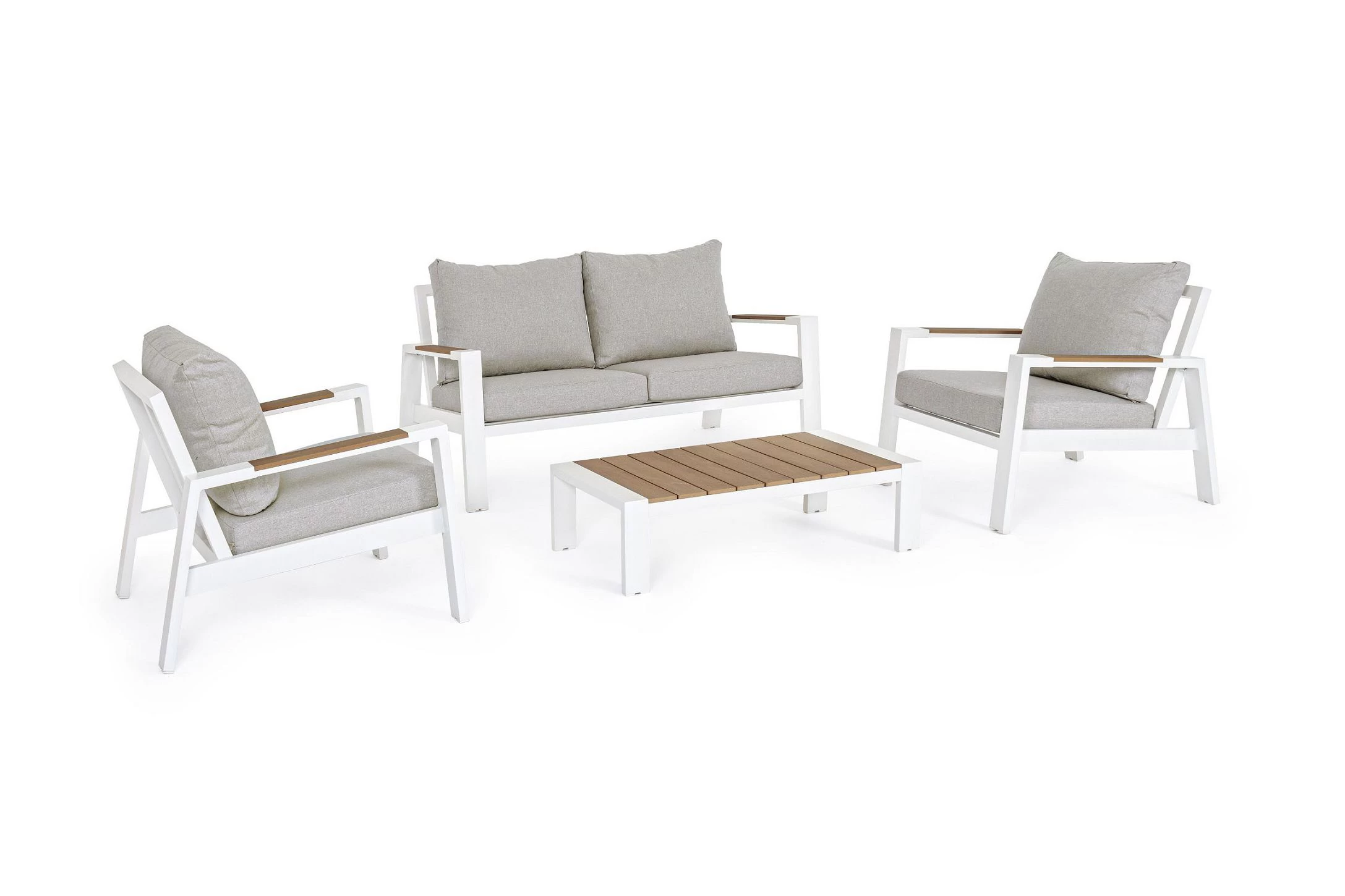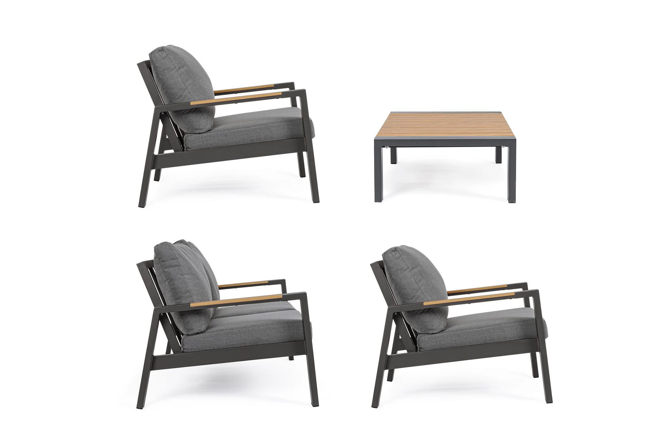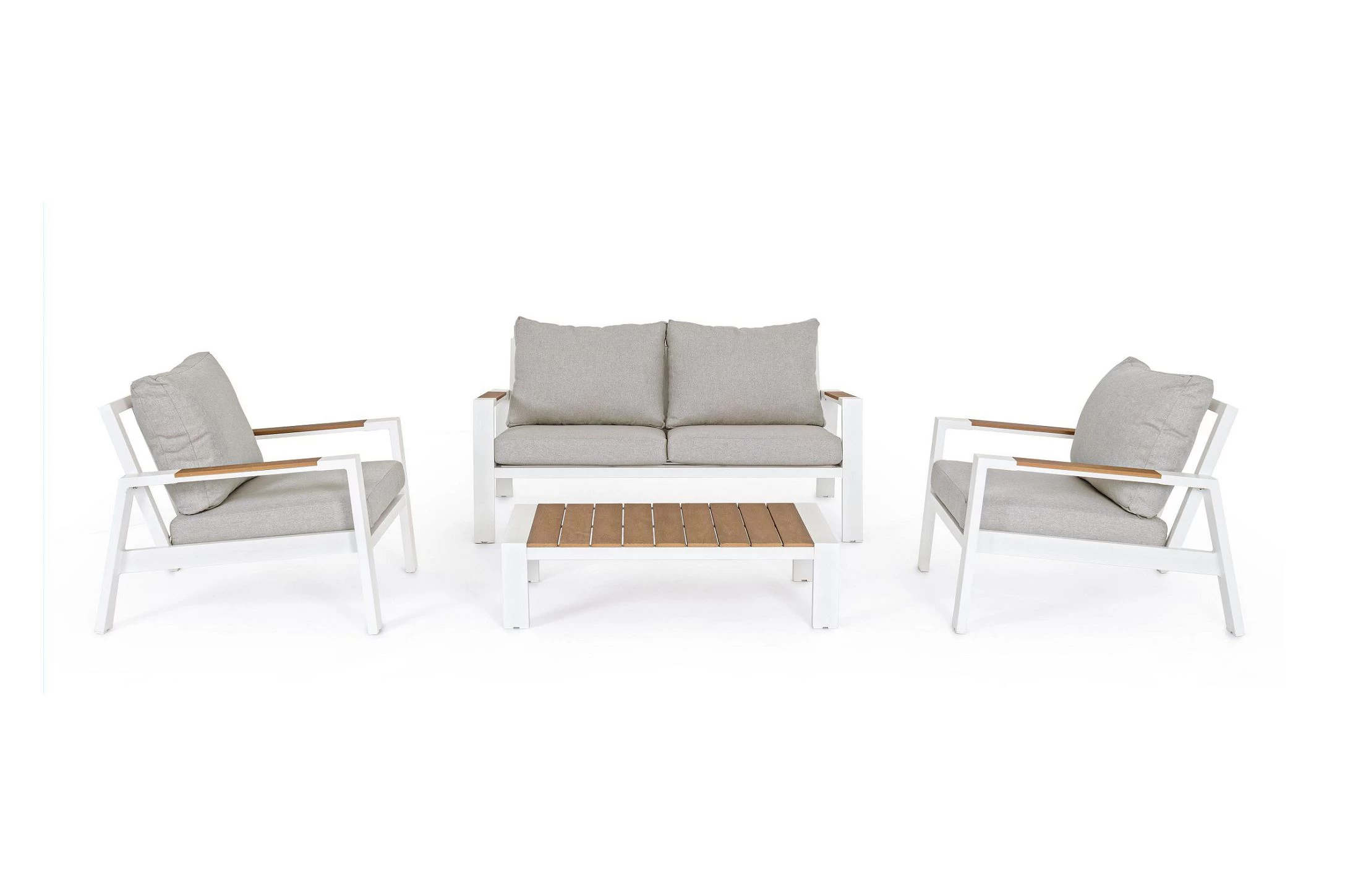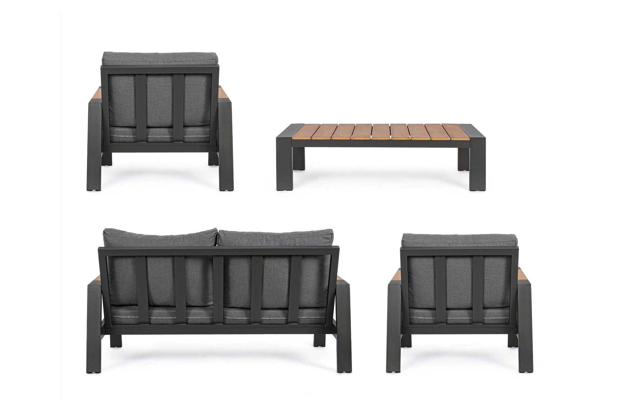 Zestaw wypoczynkowy aluminiowy ogrodowy z kompozytowymi wstawkami teak z 2-osobową sofą.