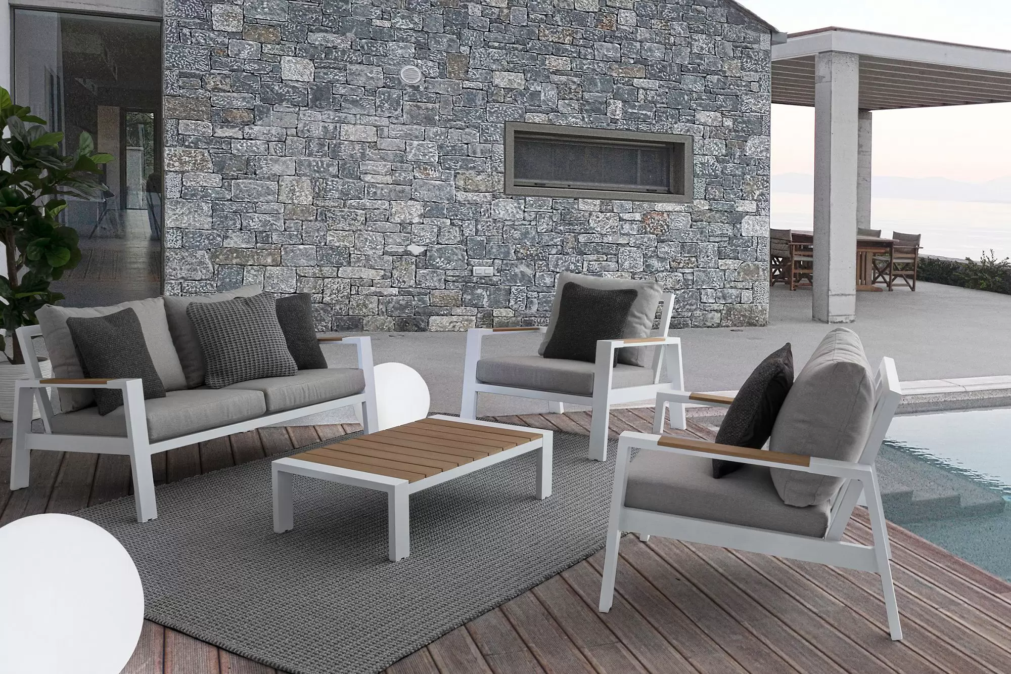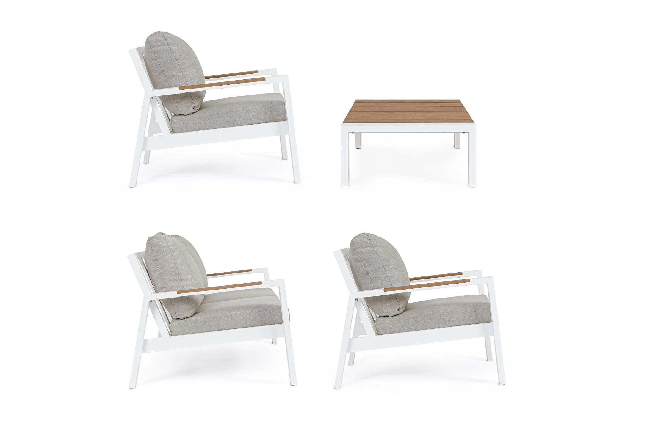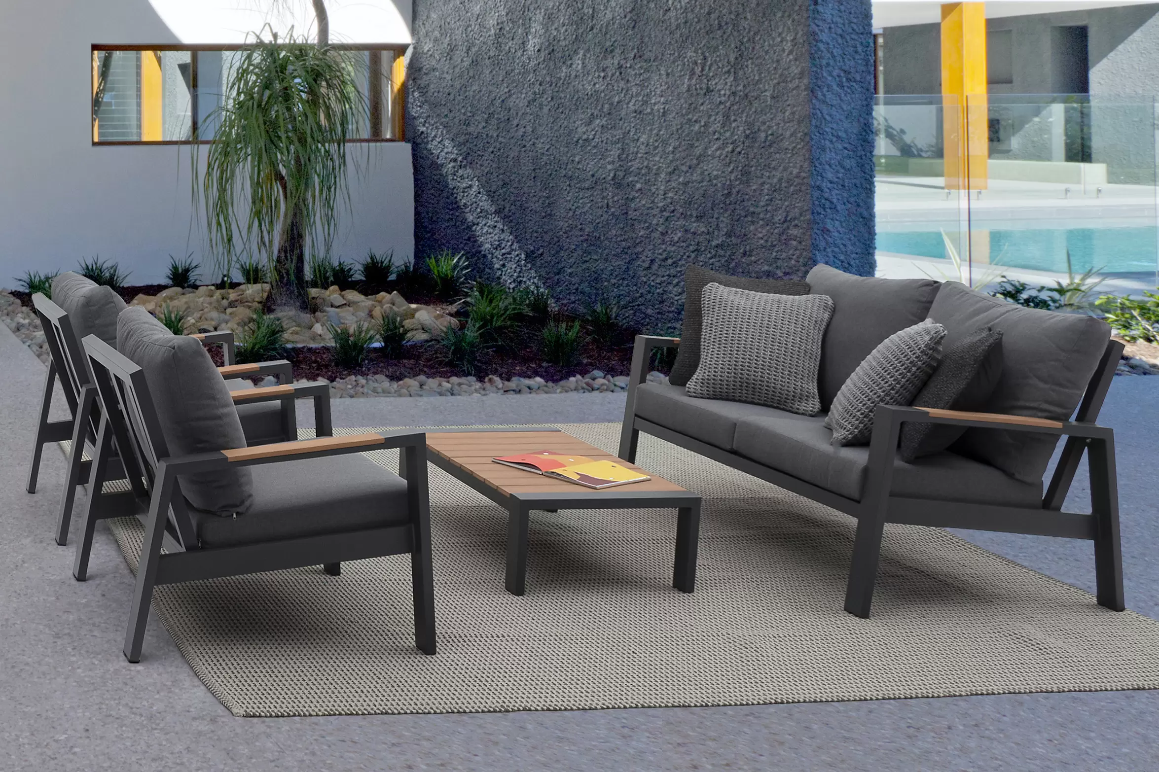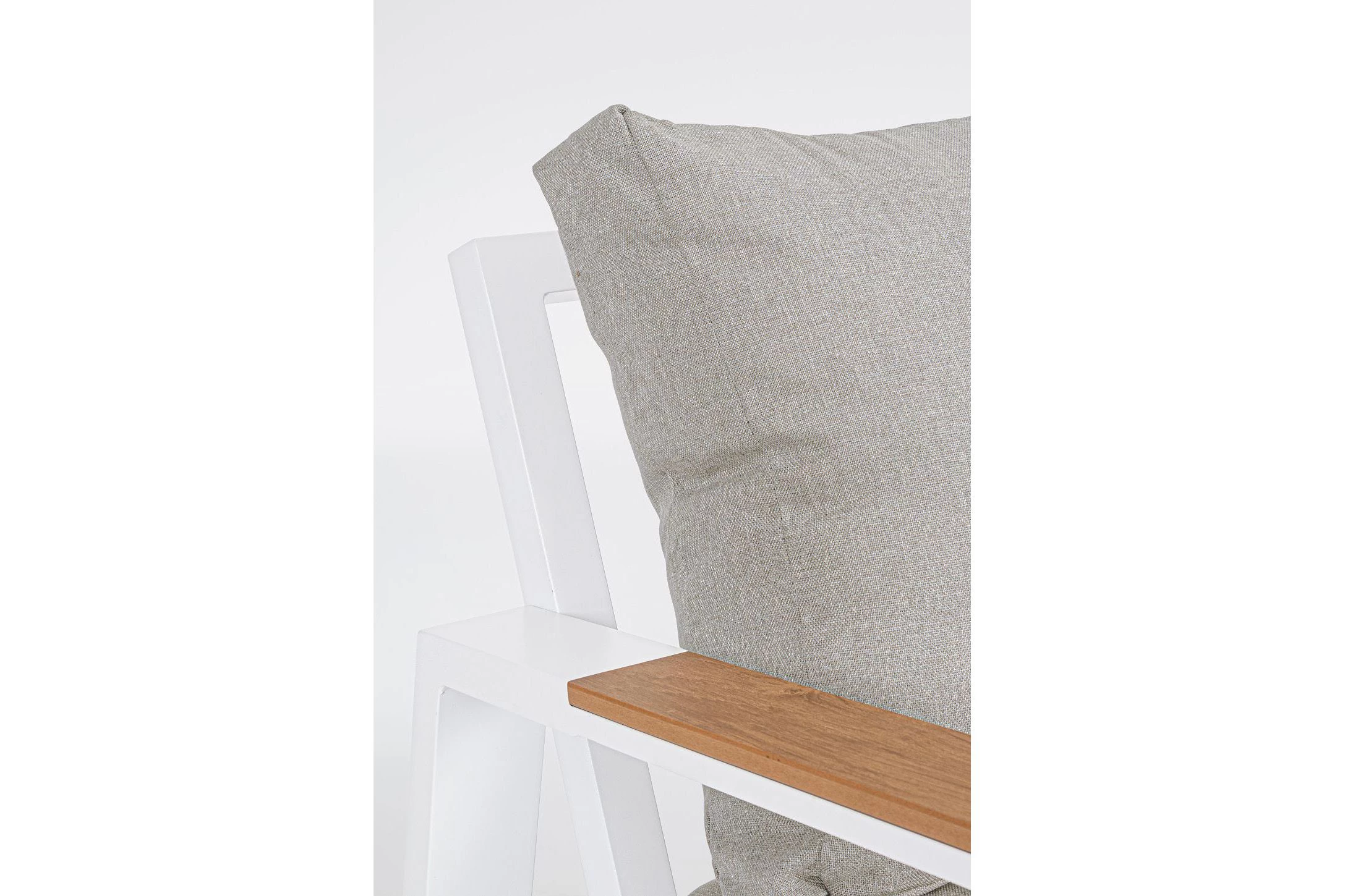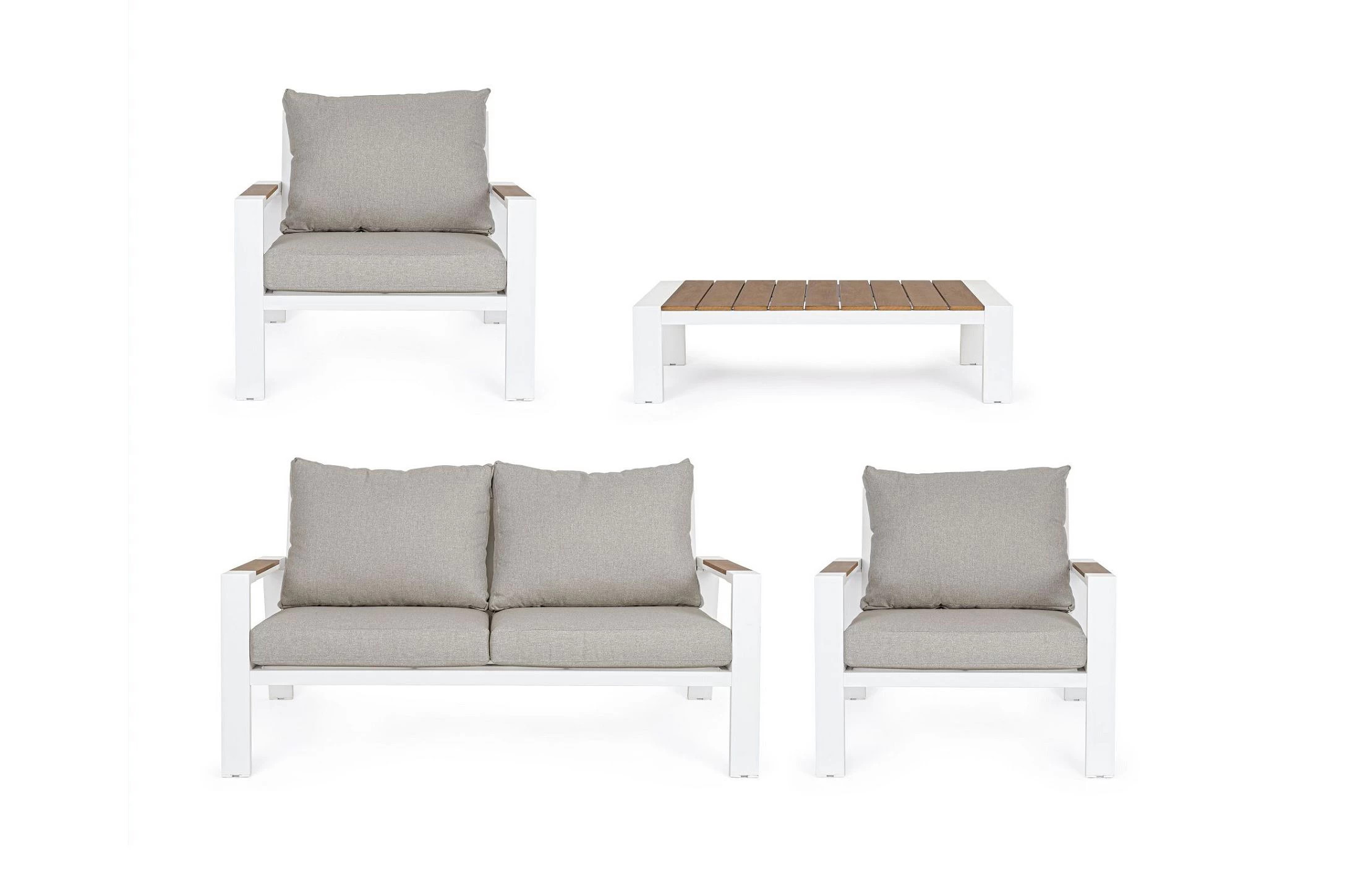Zestaw wypoczynkowy aluminiowy ogrodowy z kompozytowymi wstawkami teak z 2-osobową sofą.