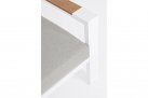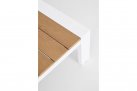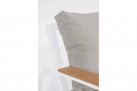 Blat stolika oraz podłokietniki z kompozytu drewnianego o wyglądzie identycznym jak drewno teakowe.