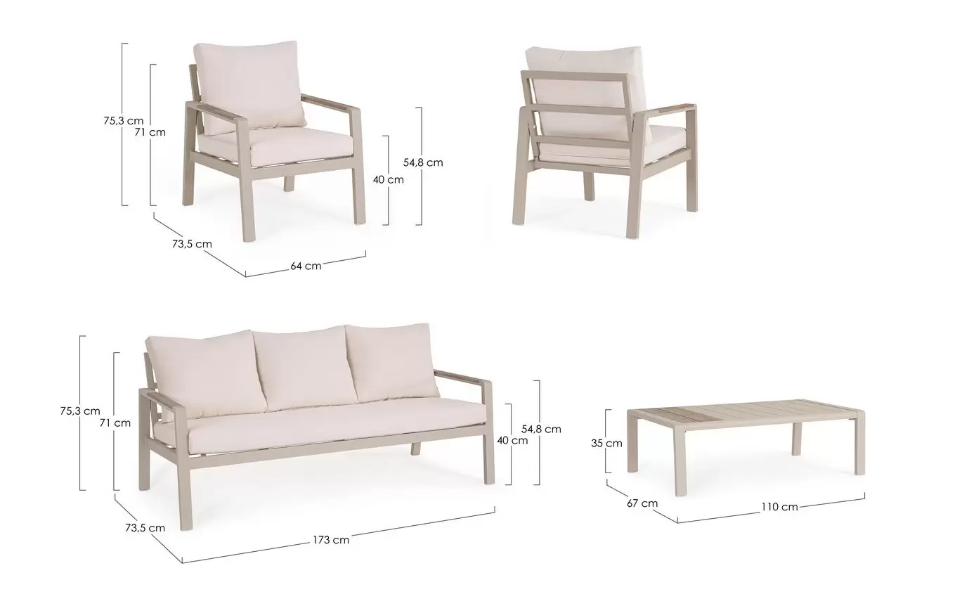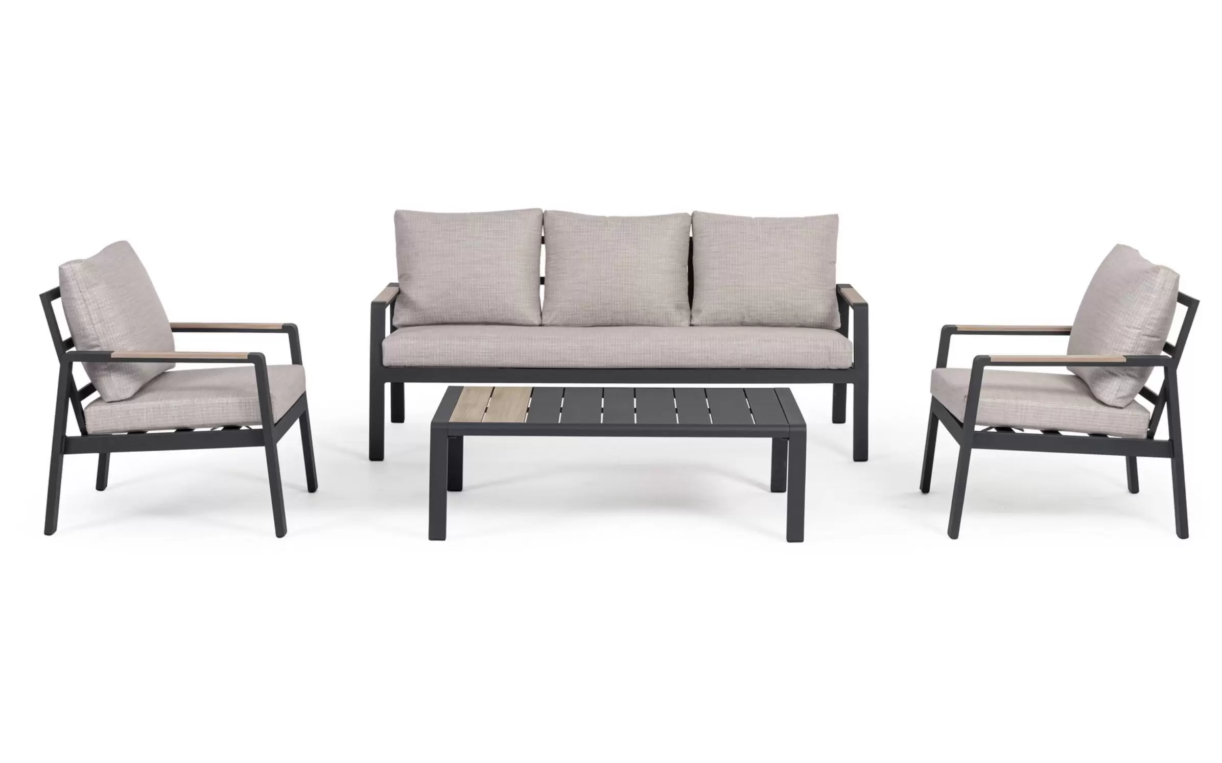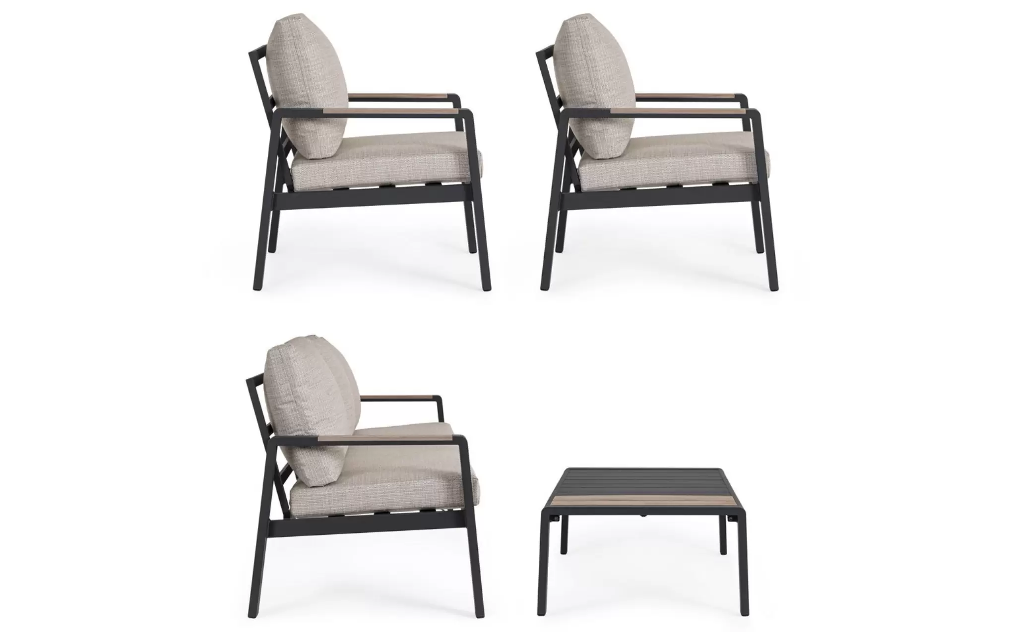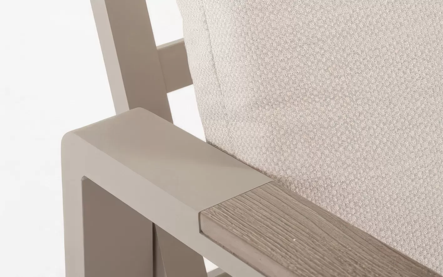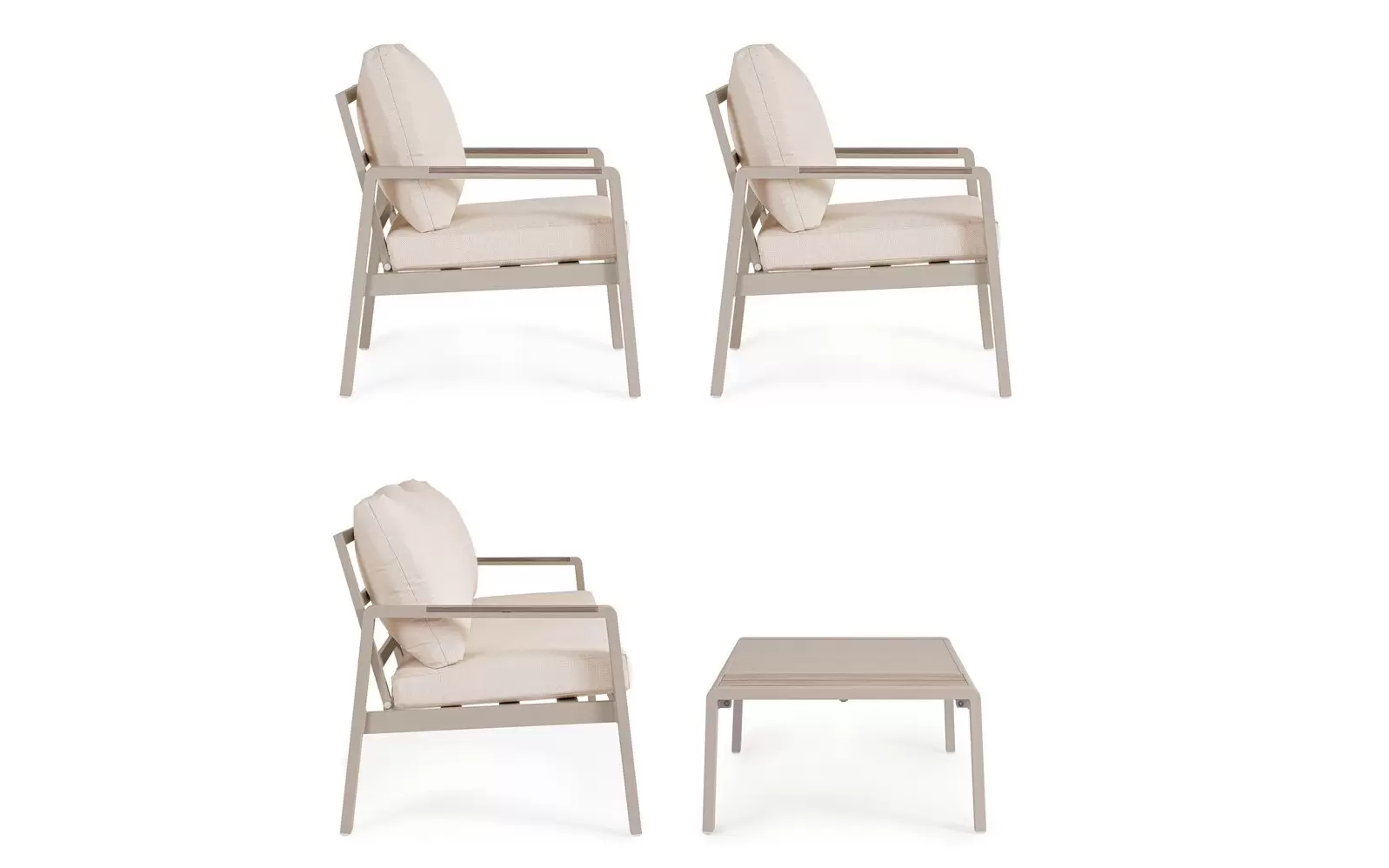 Aluminium malowane proszkowo ????️ – szkielet sofy, foteli i stolika wykonano z lekkiego stopu aluminium. Zastosowanie lakierowania proszkowego tworzy szczelną powłokę ochronną, która jest całkowicie odporna na korozję, promieniowanie UV oraz zmienne temperatury. Dzięki temu konstrukcja pozostaje stabilna i estetyczna przez lata, nie wymagając odnawiania powłoki lakierniczej.