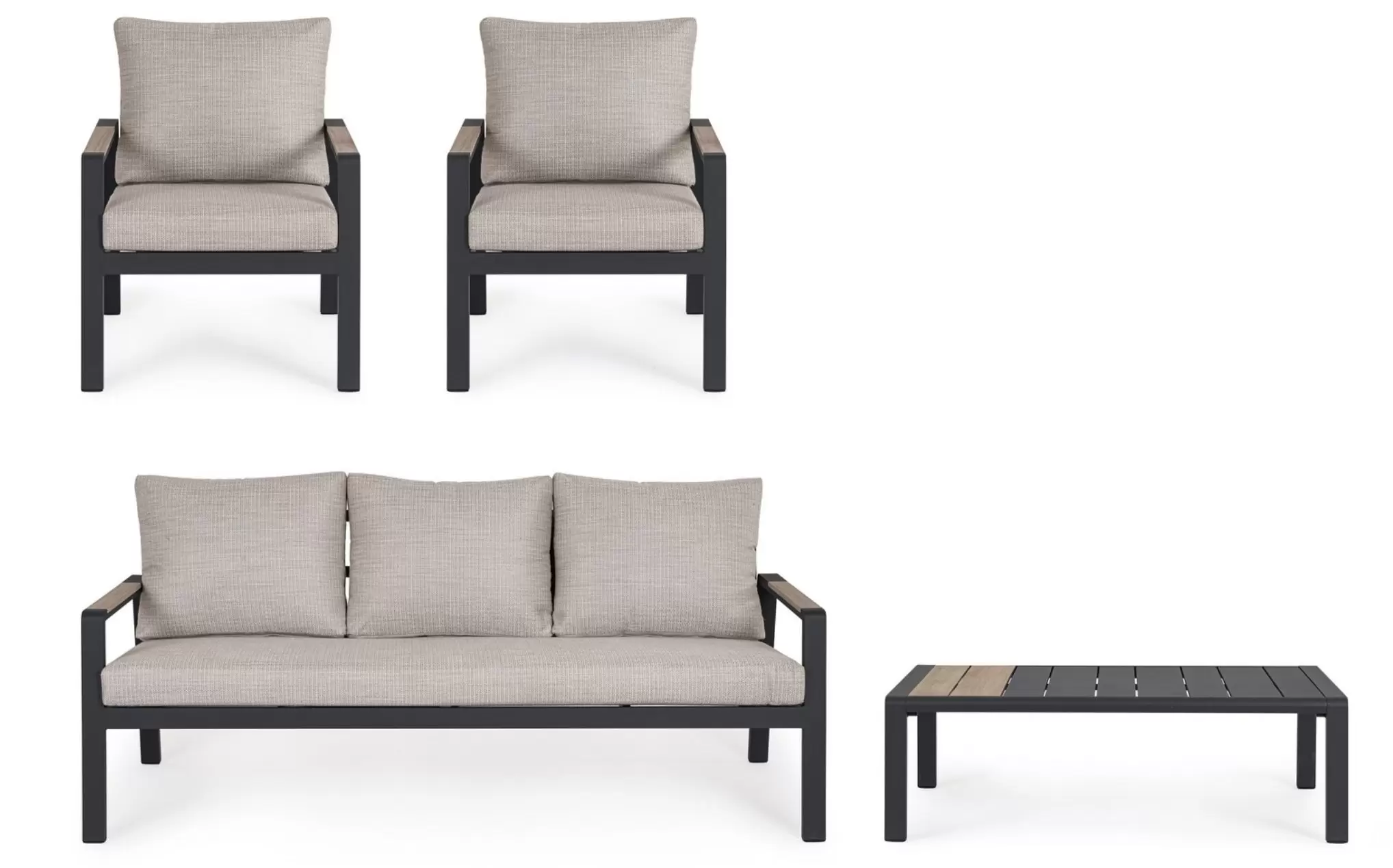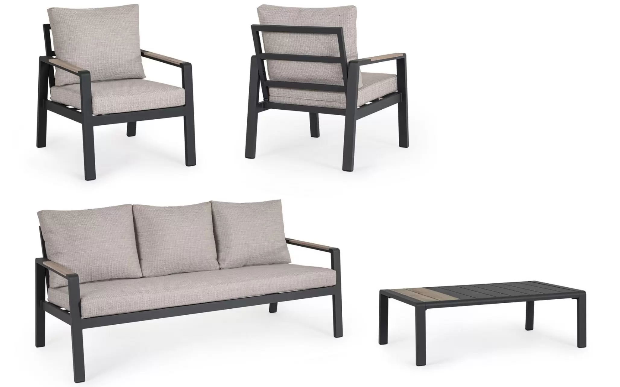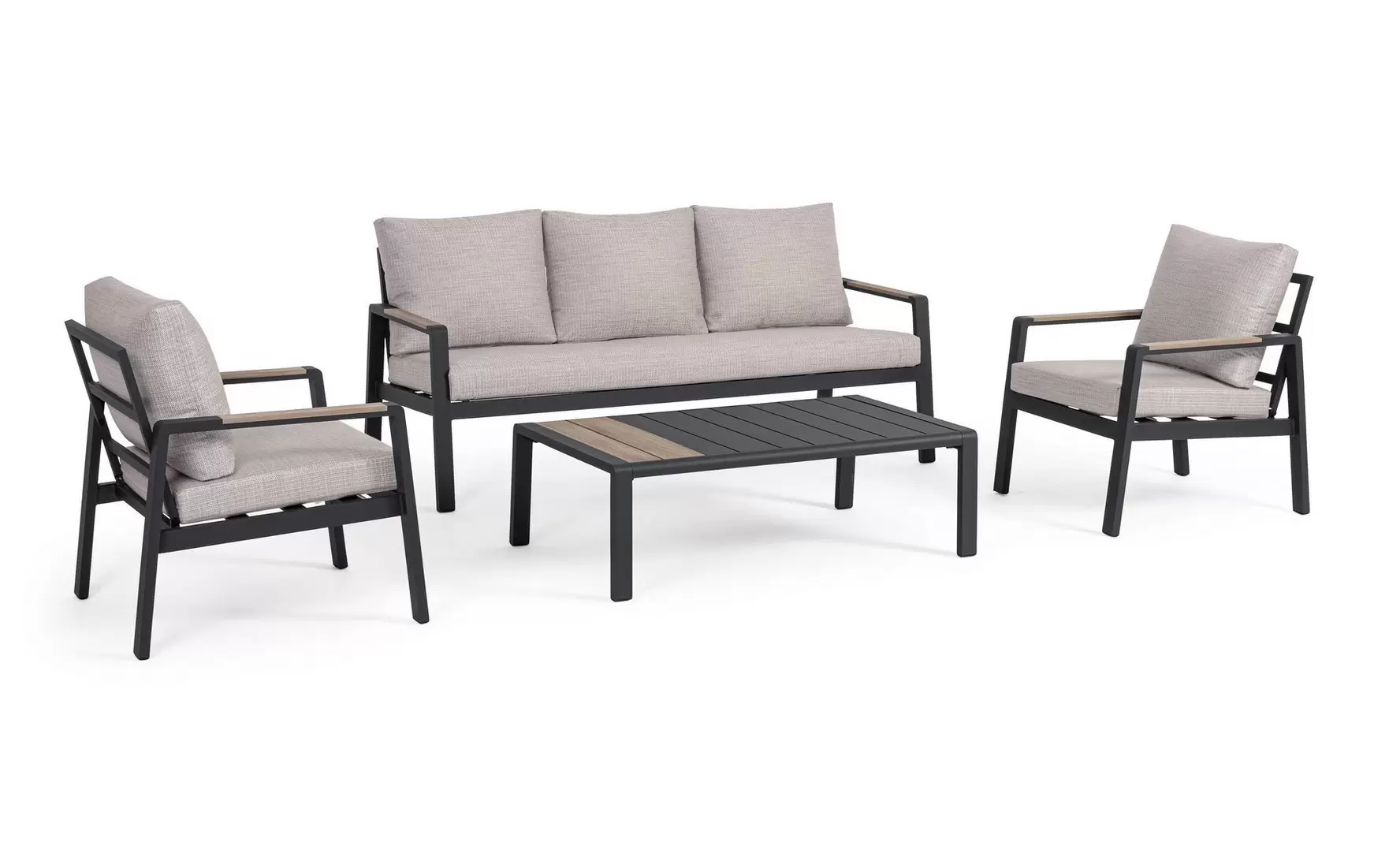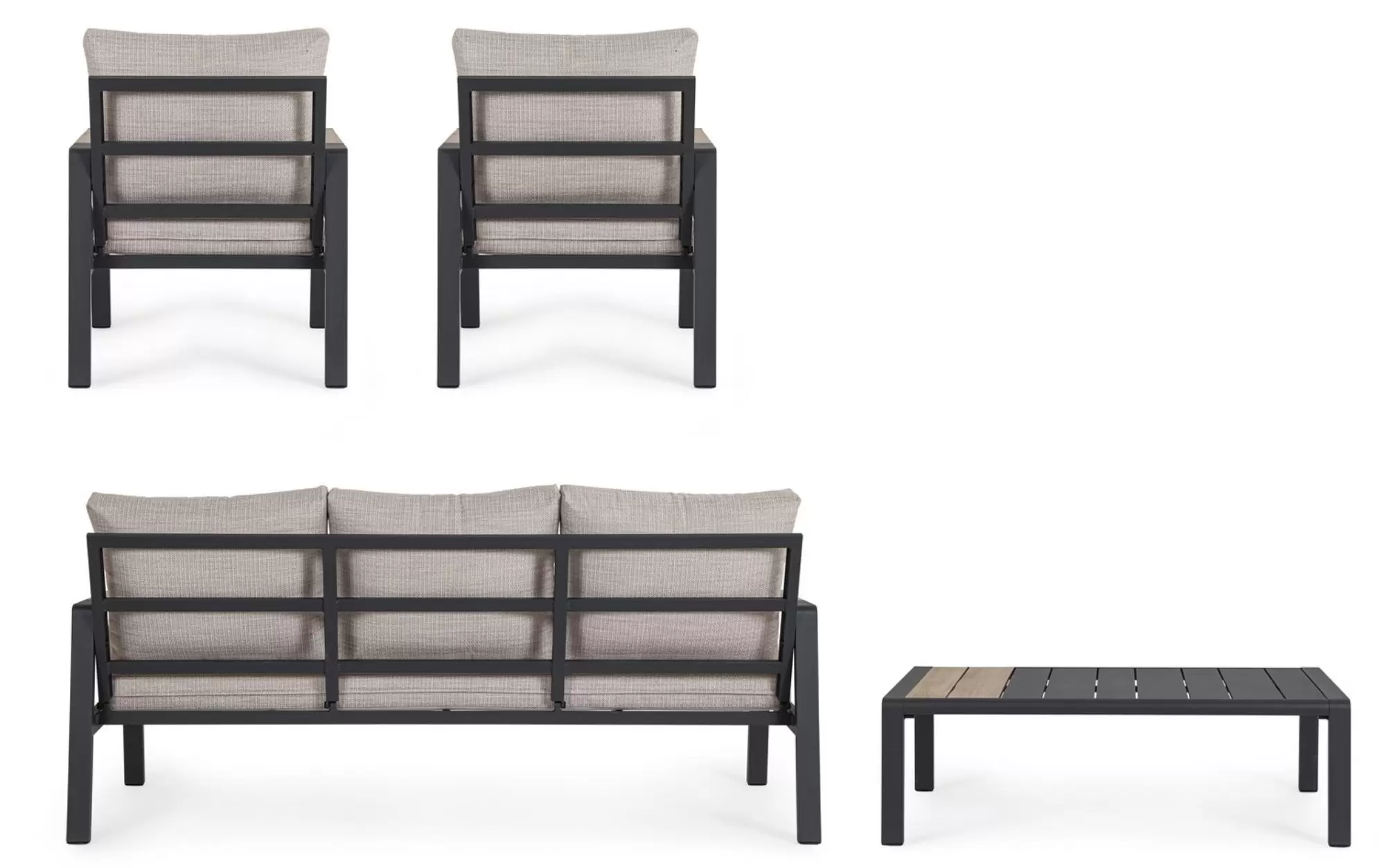 Aluminium malowane proszkowo ????️ – szkielet sofy, foteli i stolika wykonano z lekkiego stopu aluminium. Zastosowanie lakierowania proszkowego tworzy szczelną powłokę ochronną, która jest całkowicie odporna na korozję, promieniowanie UV oraz zmienne temperatury. Dzięki temu konstrukcja pozostaje stabilna i estetyczna przez lata, nie wymagając odnawiania powłoki lakierniczej.
