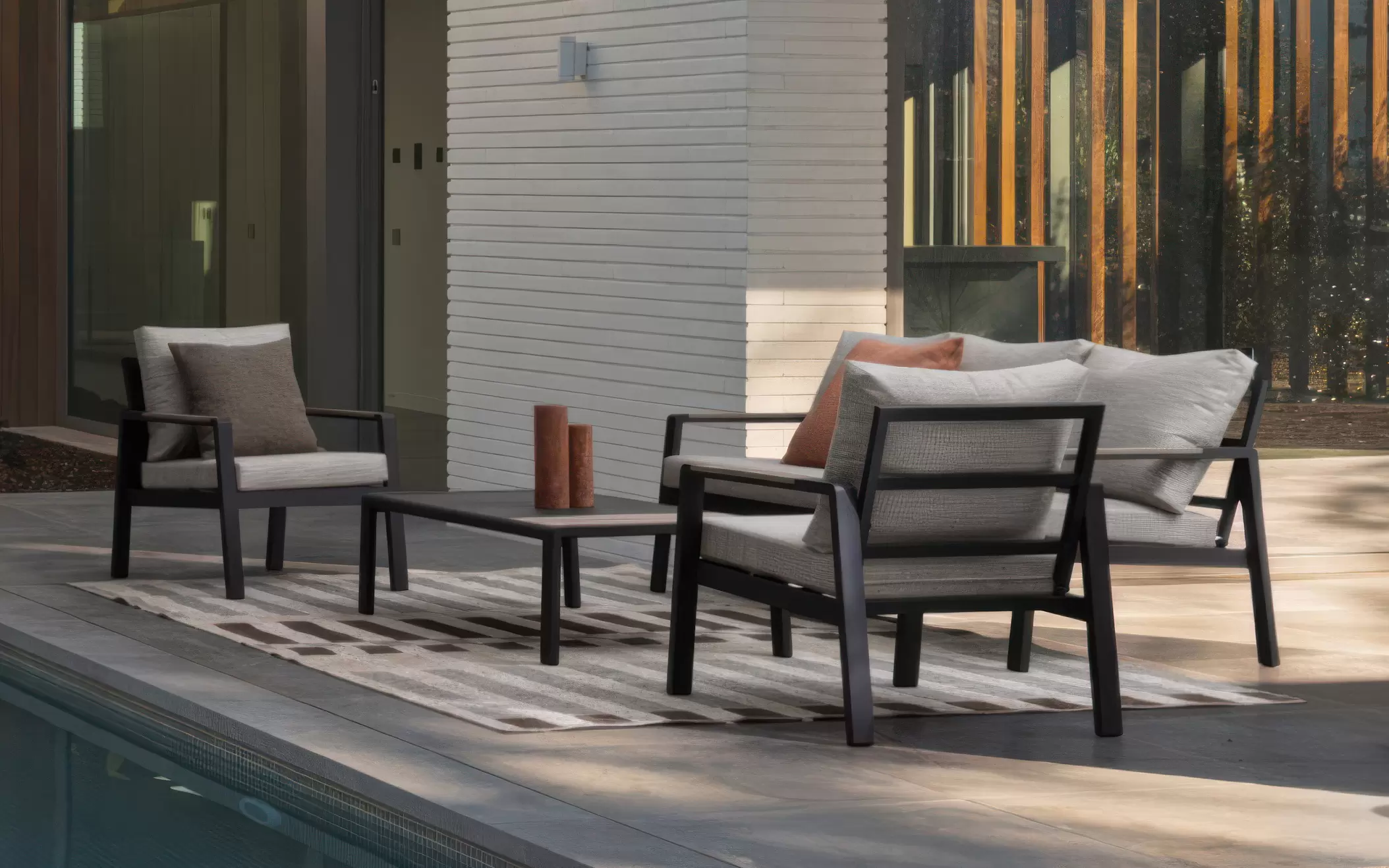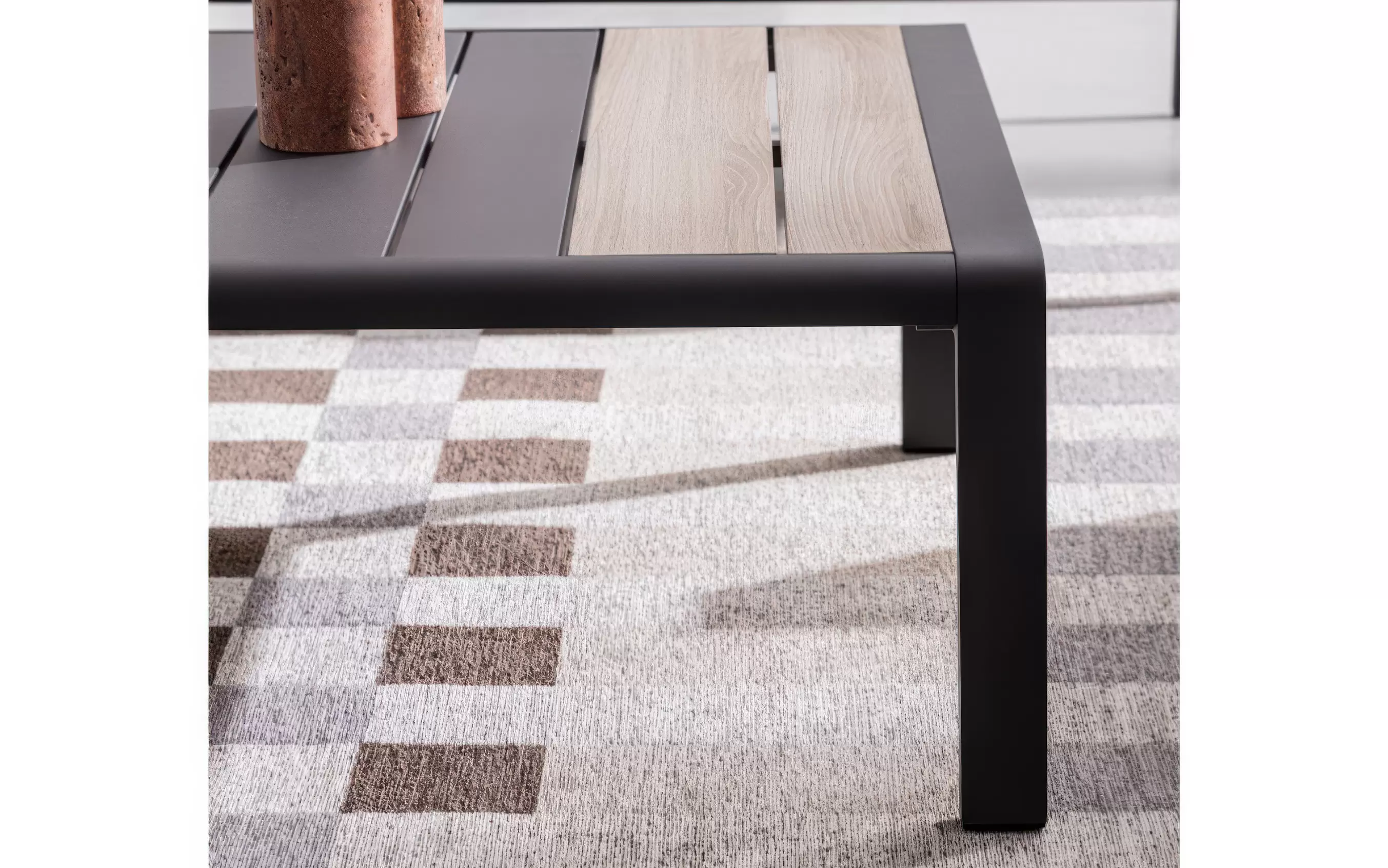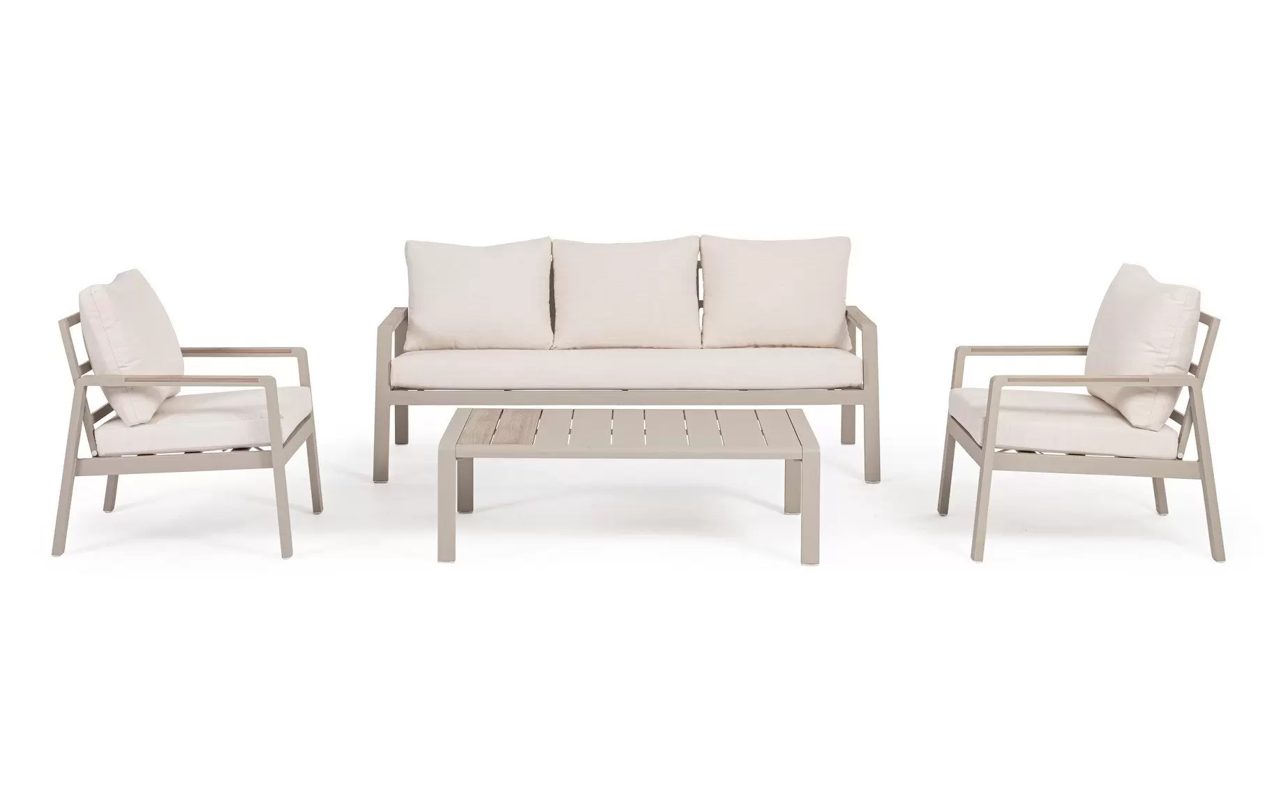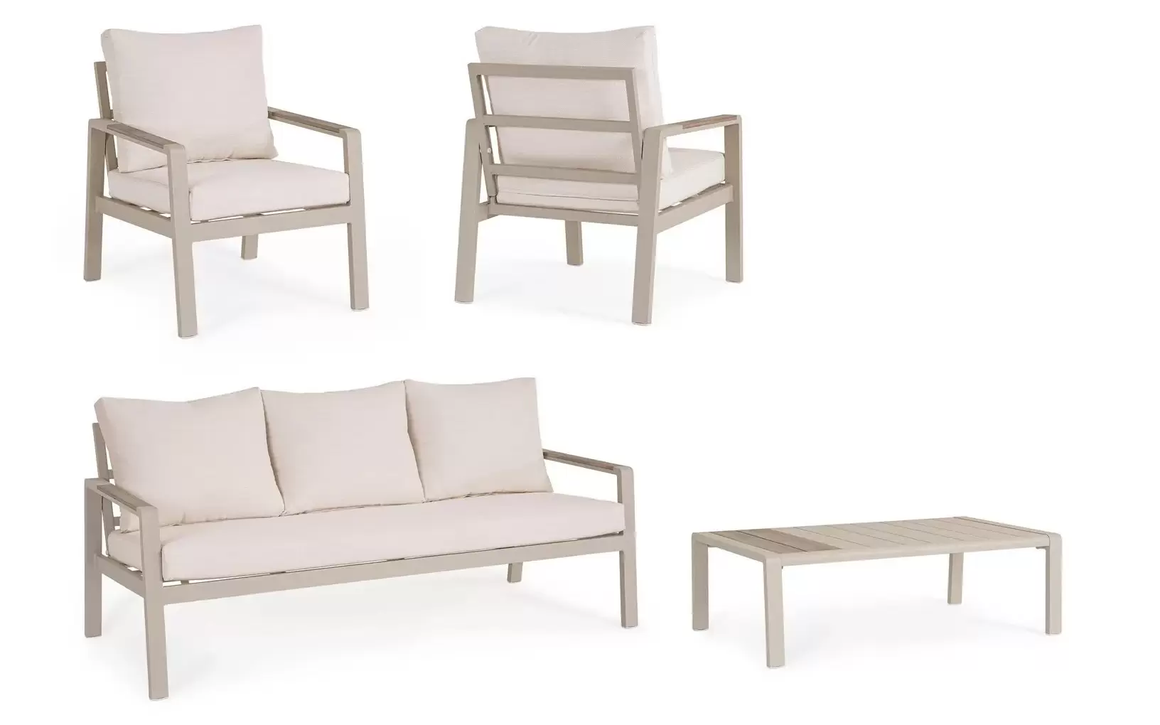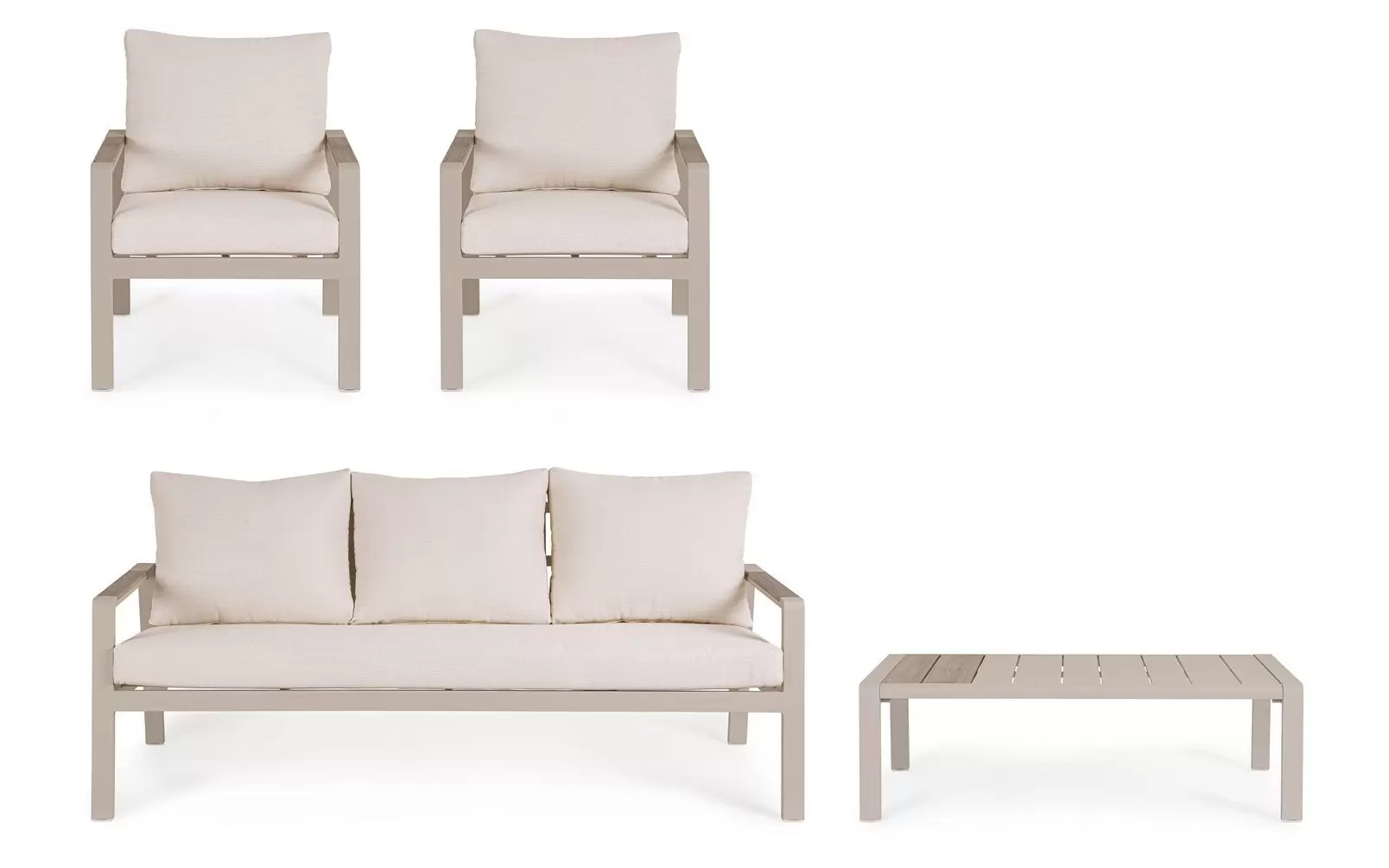 Aluminium malowane proszkowo ????️ – szkielet sofy, foteli i stolika wykonano z lekkiego stopu aluminium. Zastosowanie lakierowania proszkowego tworzy szczelną powłokę ochronną, która jest całkowicie odporna na korozję, promieniowanie UV oraz zmienne temperatury. Dzięki temu konstrukcja pozostaje stabilna i estetyczna przez lata, nie wymagając odnawiania powłoki lakierniczej.
