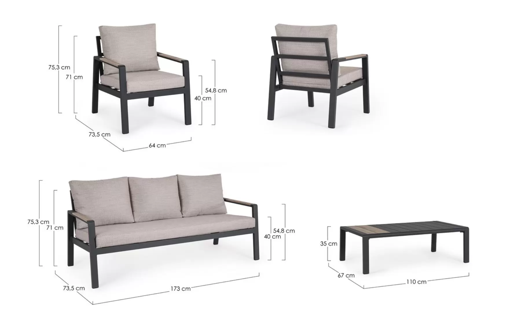 Szerokość 173 cm / Głębokość 73,5 cm / Wysokość 75,3 cm