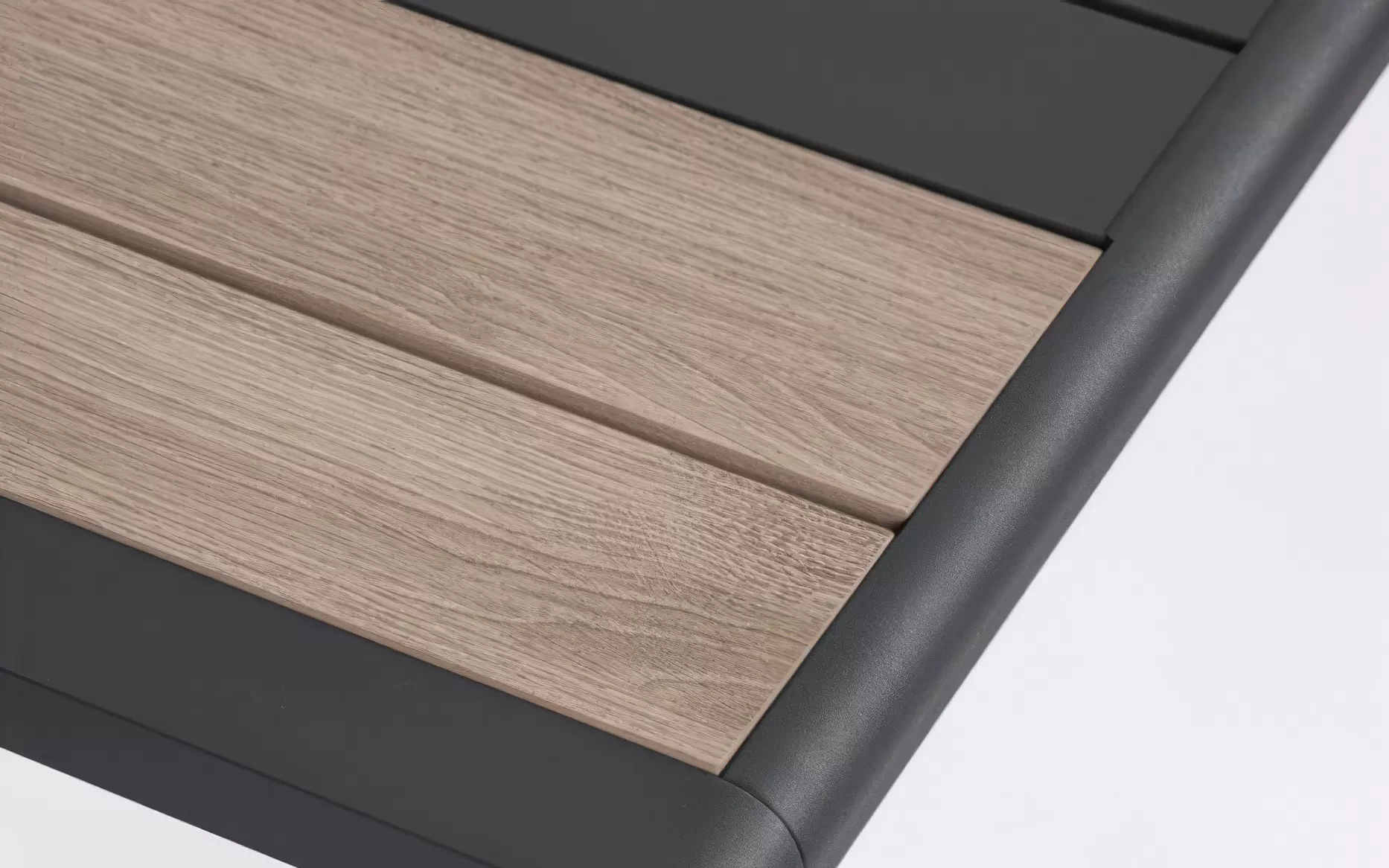 Polywood (kompozyt drzewny) ???? – wstawki w podłokietnikach oraz blat stolika wykonano z nowoczesnego tworzywa imitującego strukturę drewna. Materiał ten charakteryzuje się wyjątkową trwałością i odpornością na warunki zewnętrzne; nie pęka pod wpływem słońca i nie butwieje pod wpływem wilgoci, eliminując konieczność regularnego olejowania typową dla naturalnego drewna.