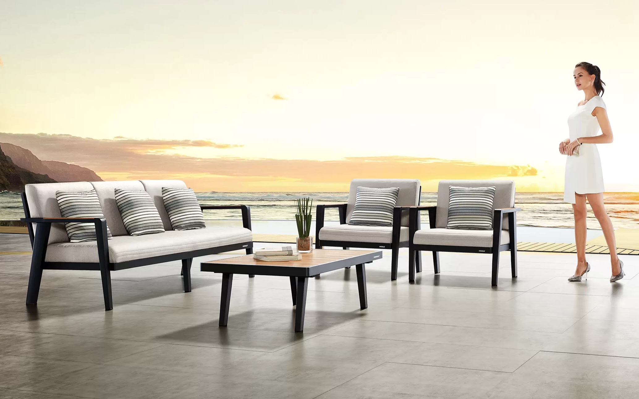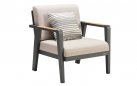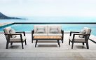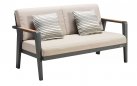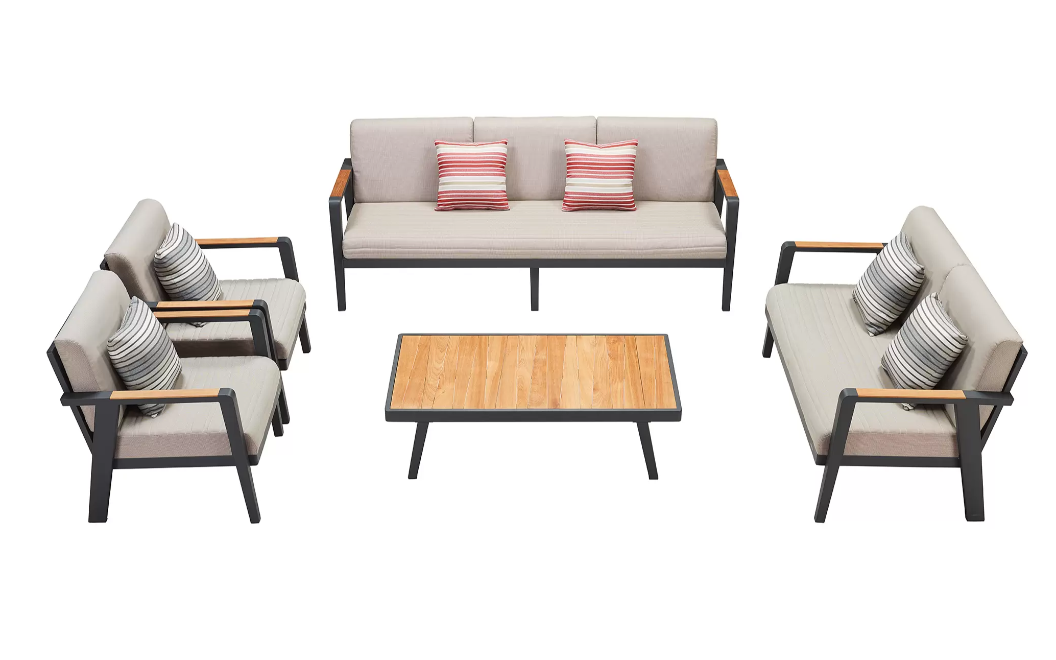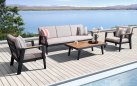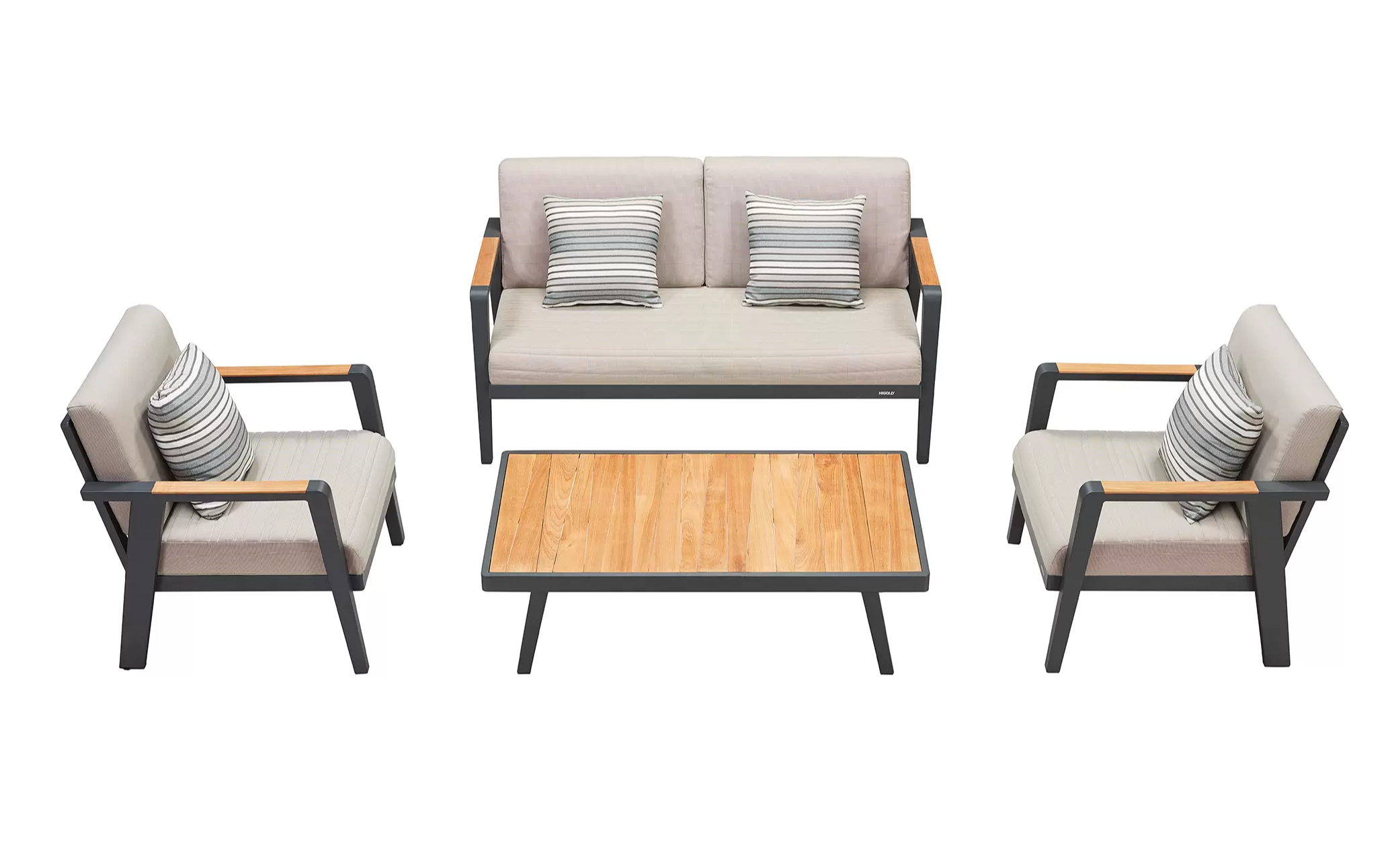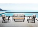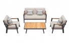 Aluminiowy zestaw ogrodowy wypoczynkowy na taras firmy HIGOLD w nowoczesnym stylu. Konstrukcja opiera się na spawanej ramie aluminiowej malowanej proszkowo, elementach dekoracyjnych z teaku i wygodnych poduszek beżowych z obiciami z materiału Olefin. Poduszki położone na opinającej siedzisko tekstylinie.