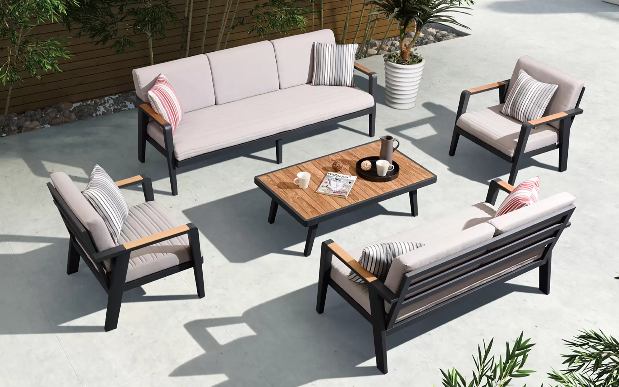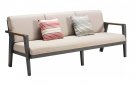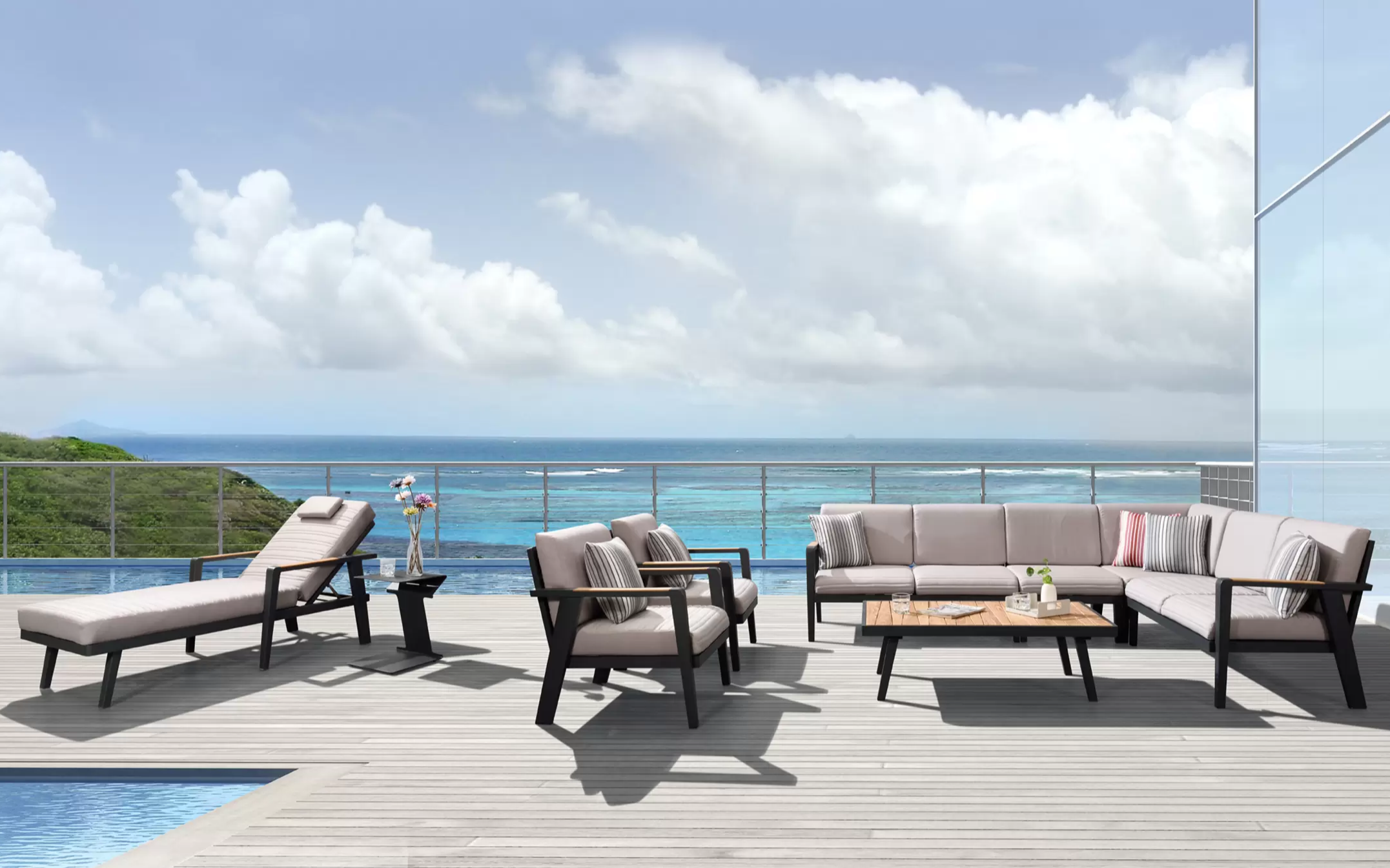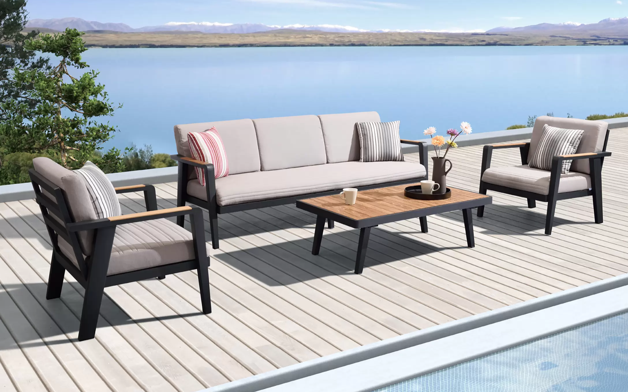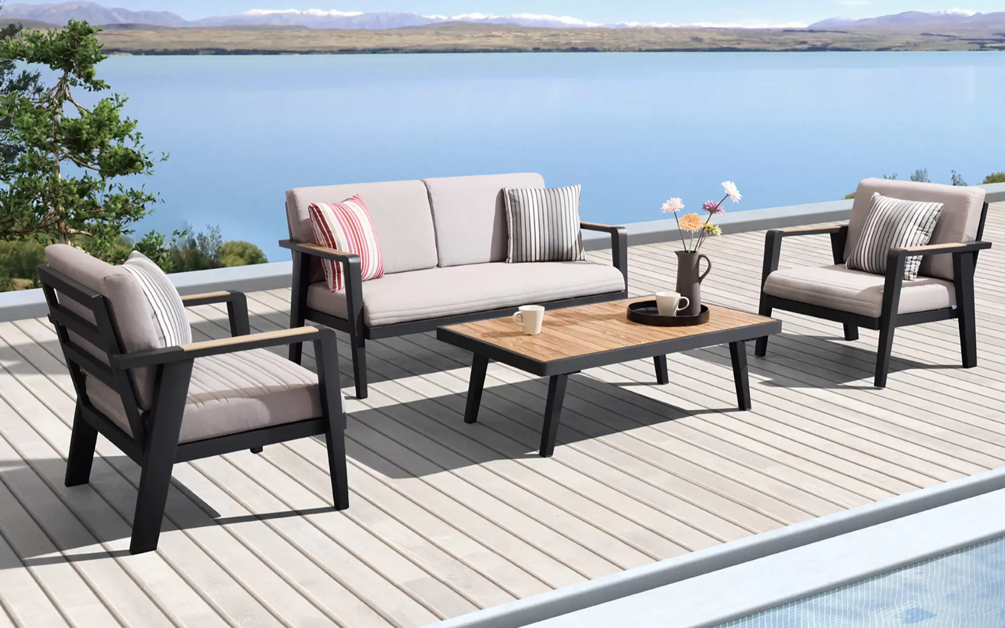 Aluminiowy zestaw ogrodowy wypoczynkowy na taras firmy HIGOLD w nowoczesnym stylu. Konstrukcja opiera się na spawanej ramie aluminiowej malowanej proszkowo, elementach dekoracyjnych z teaku i wygodnych poduszek beżowych z obiciami z materiału Olefin. Poduszki położone na opinającej siedzisko tekstylinie.