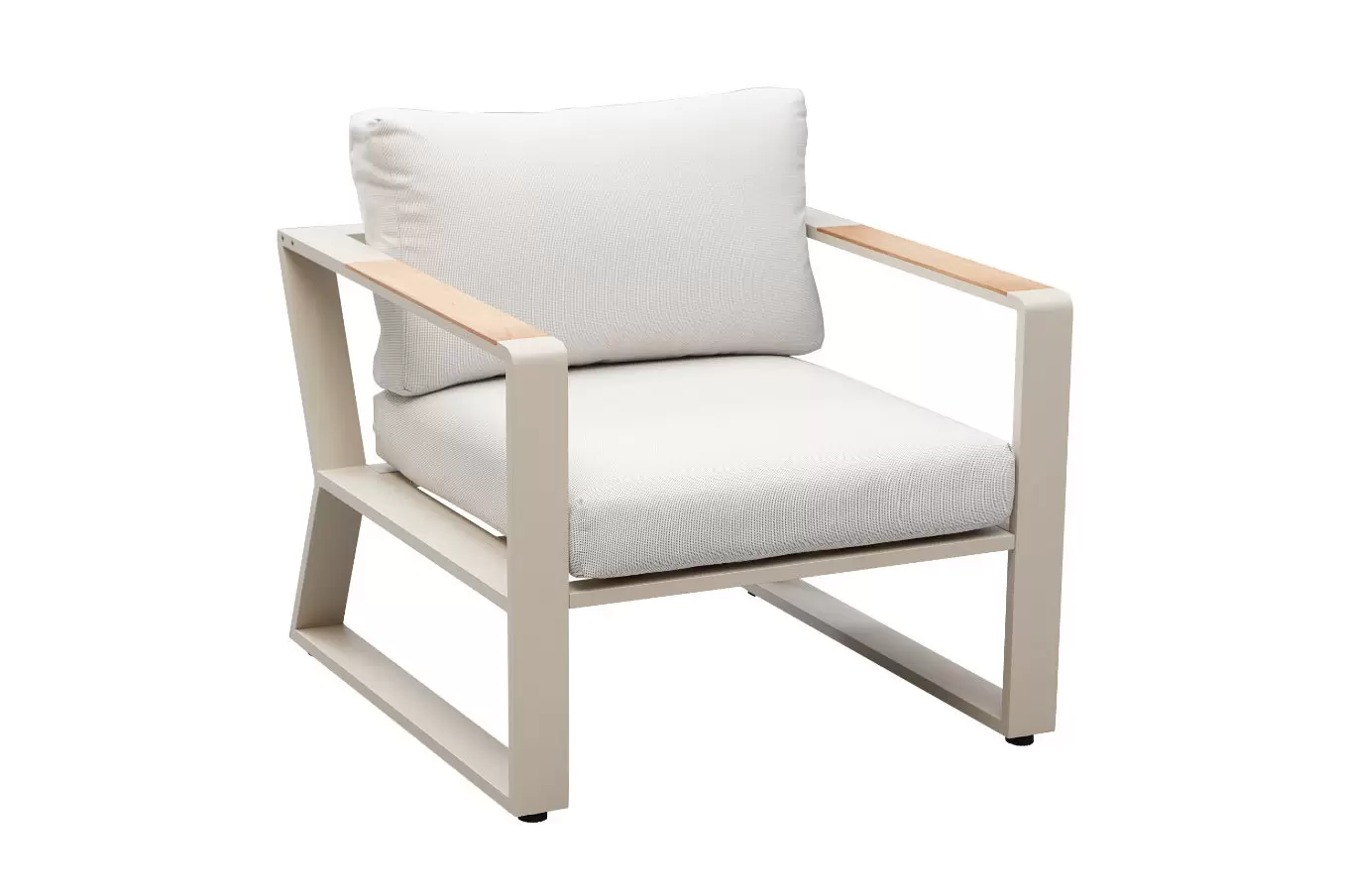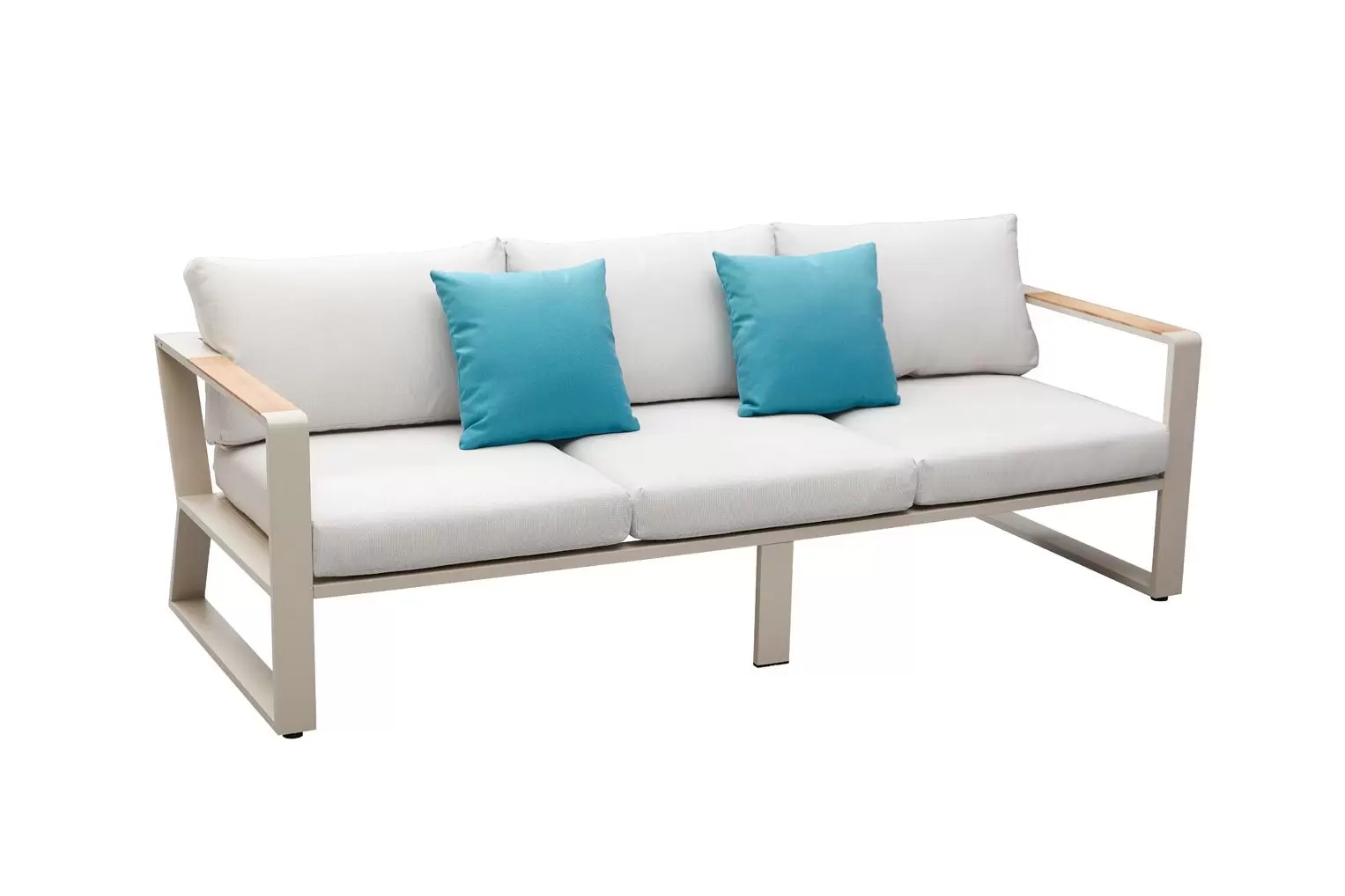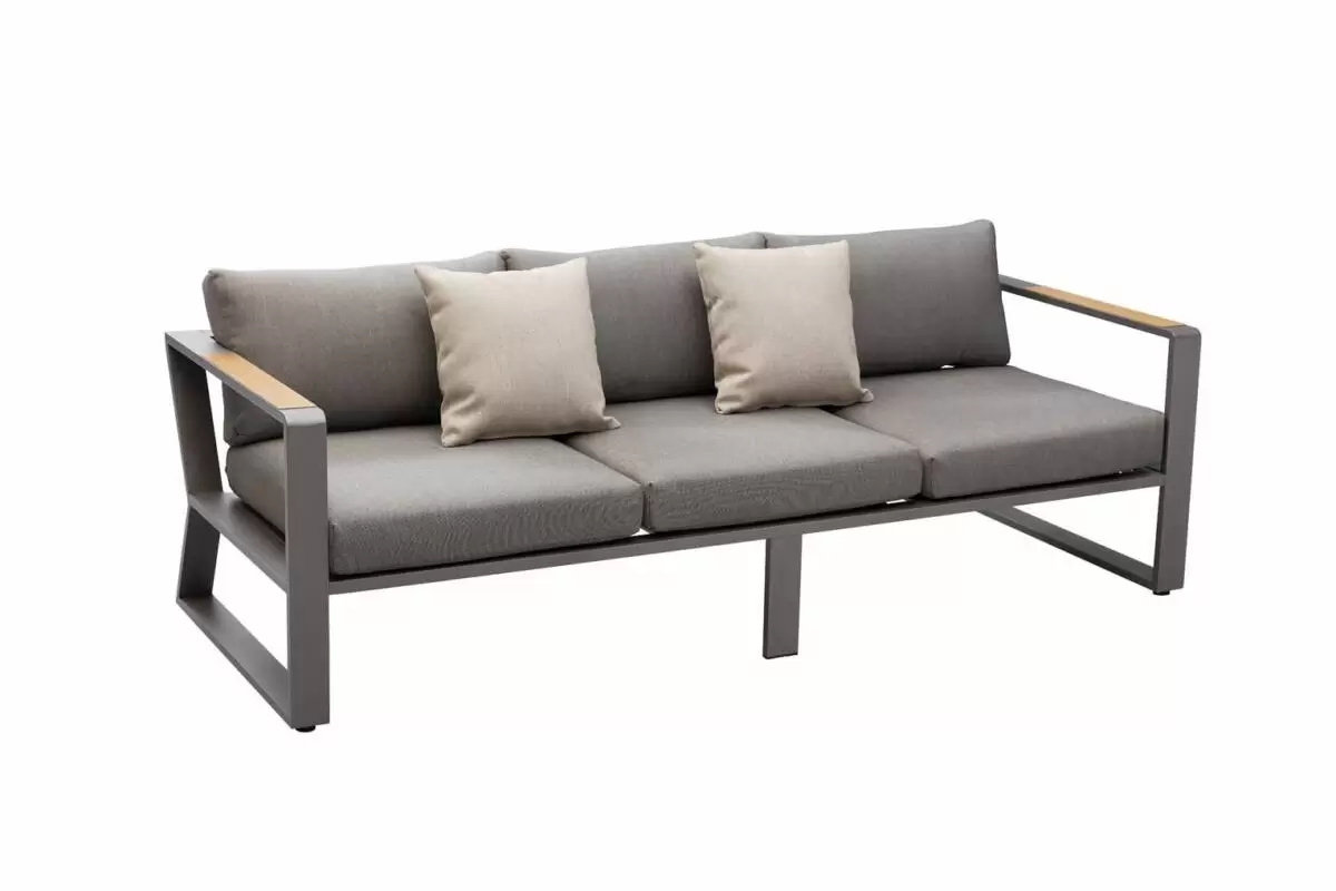 Nierdzewne, malowane proszkowo aluminium w kolorze Taupe lub czarnym w połączeniu z najlepszym drewnem teakowym i mocnymi kontrastowymi kolorami sprawiają, że te meble ogrodowe są elegancką i ekskluzywną ucztą dla oczu. Wysoki komfort zapewniają wygodne i miękkie poduszki siedziska i oparcia, które wypełnione są specjalną pianką outdoorową, hydrofobową i dodatkowo szybkoschnącą. Wysokiej jakości miękkie poszewki na poduszki są również wodoodporne i odporne na zabrudzenia oraz w 100% odporne na promieniowanie UV. Pokrowce są również zdejmowane i można je prać, są bardzo trwałe i trwałe.