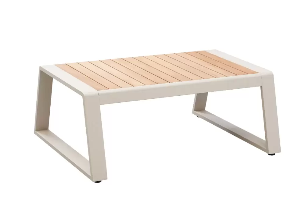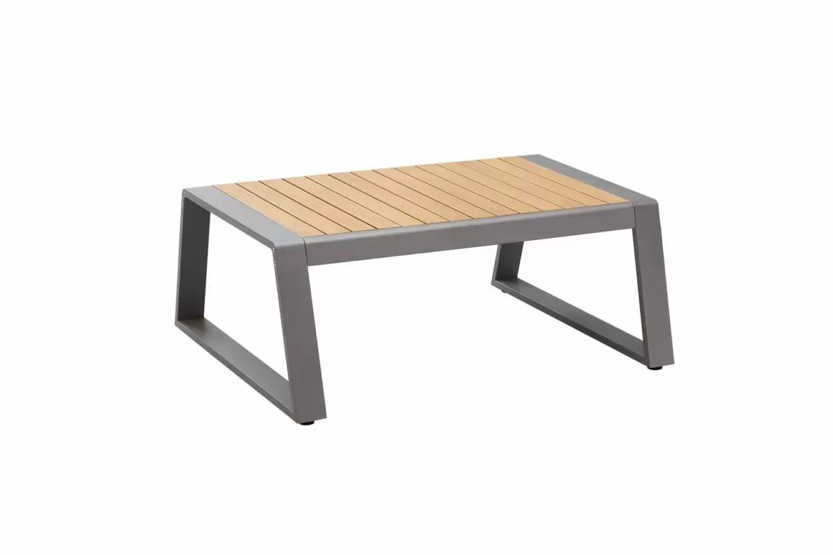 Elegancki stolik kawowy również wykonany jest z wysokiej jakości aluminium malowanego proszkowo, a blat ze szlachetnych i wytrzymałych listew tekowych.