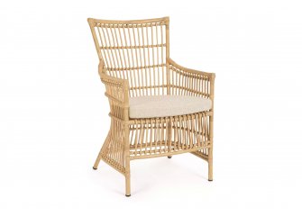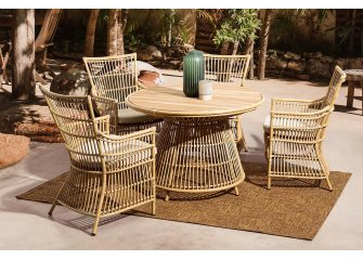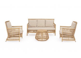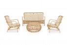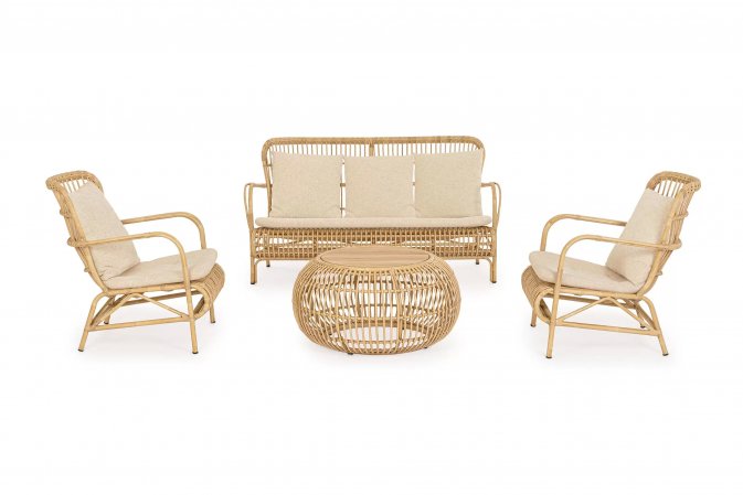 Klasyczny w formie komplet ogrodowy wykonany z nowoczesnych materiałów. Aluminiowe profile malowane proszkowo z technologią sublimacji tworzące powłokę imitująca naturalny rattan. Taka powłoka jest odporna na warunki atmosferyczne i UV.